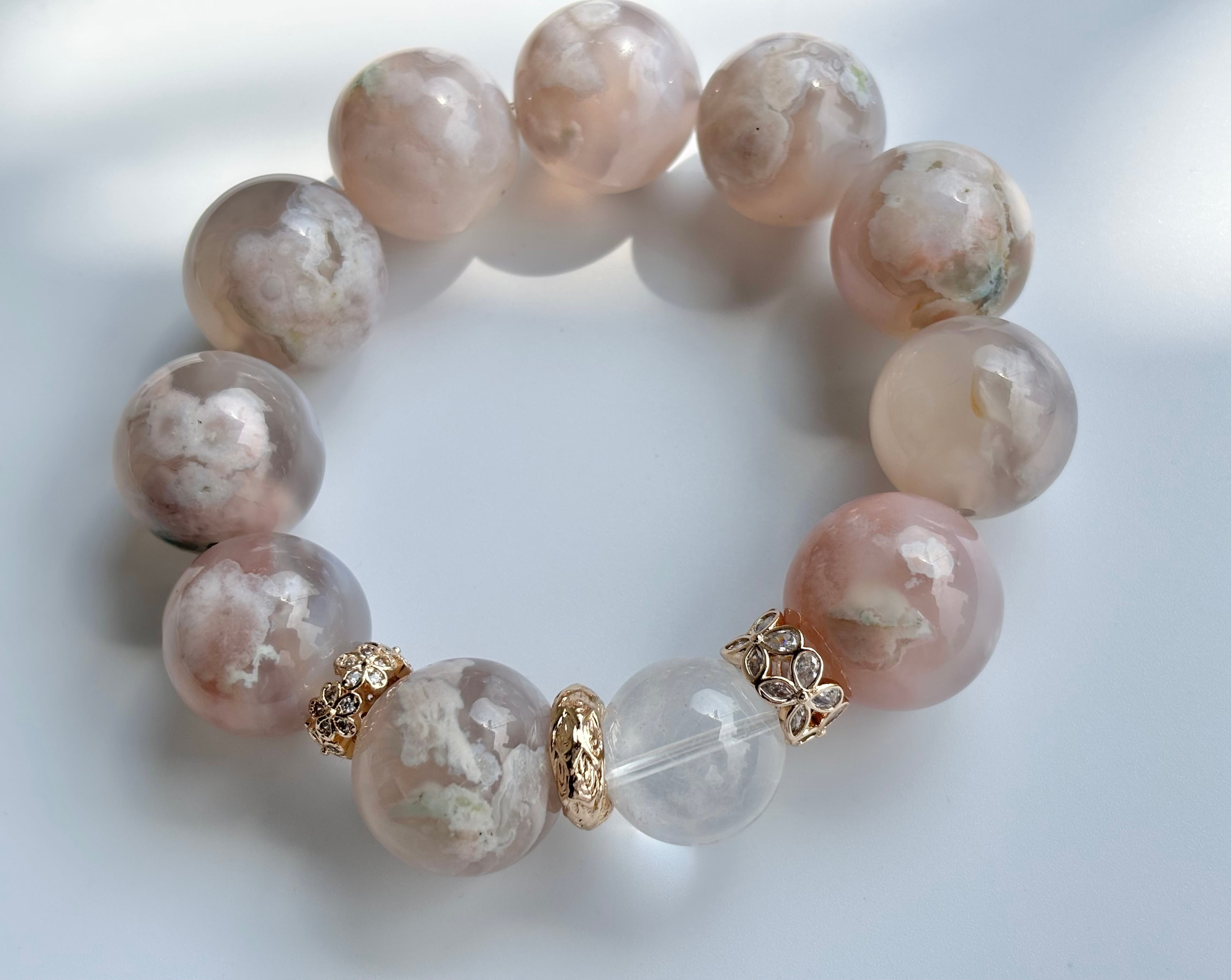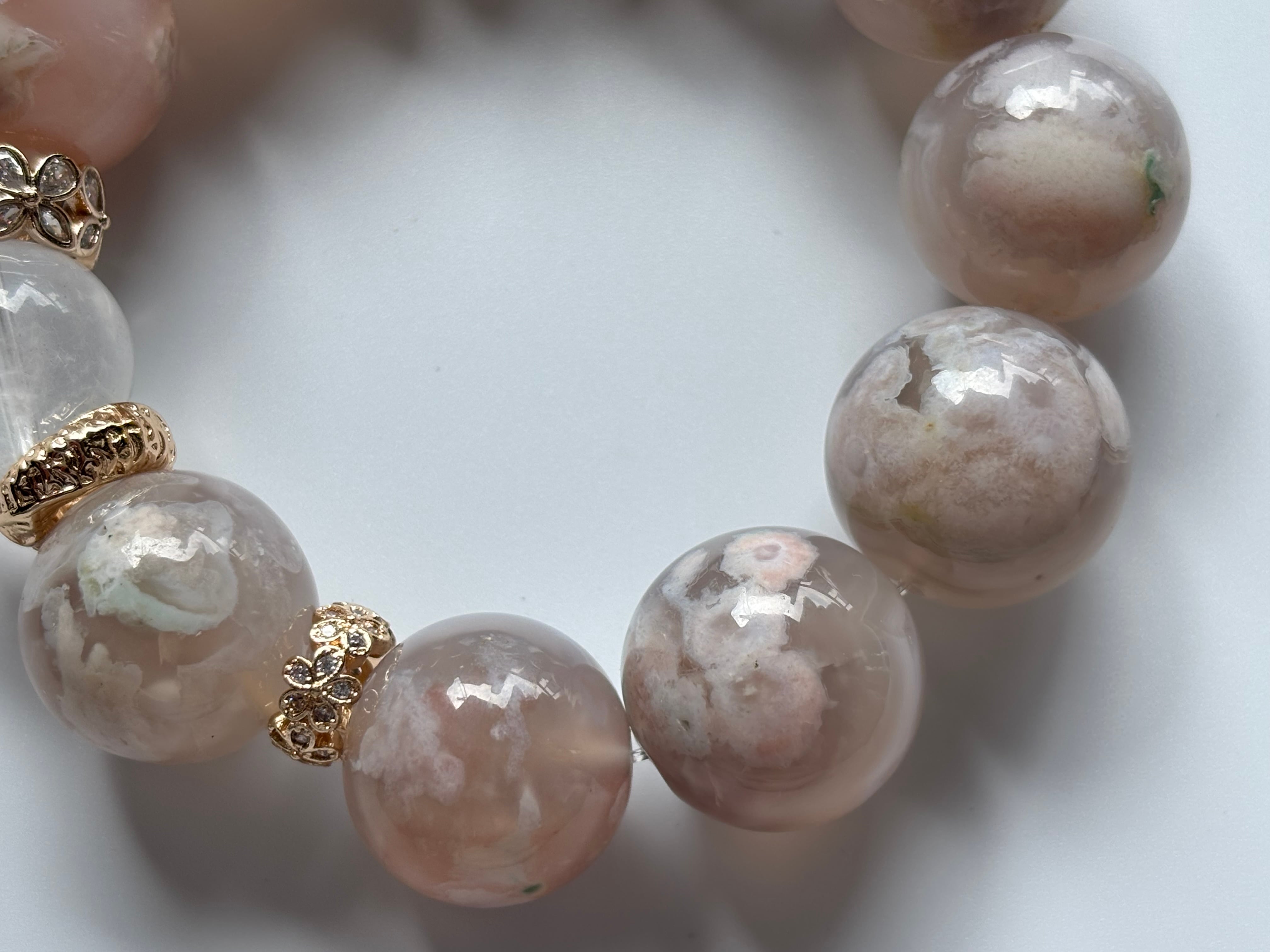 たんぽぽの綿毛のような、ふんわりとした内包が印象的なたんぽぽサゲニティックをトップに、桜が咲いたような模様が美しい高品質な桜瑪瑙を合わせたデザインブレスレットです。