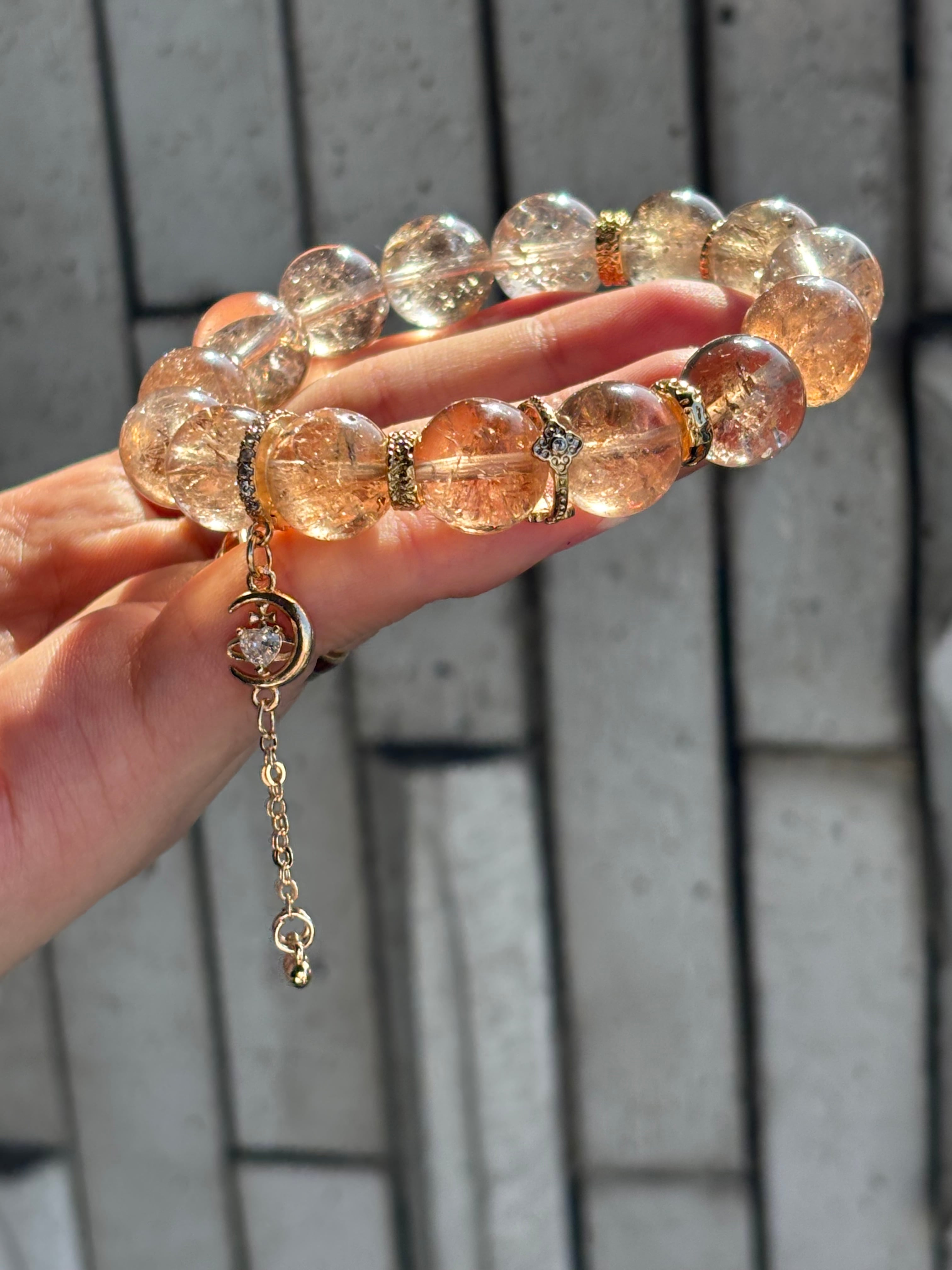今回のブレスレットは、ブラウン系の穏やかな色味とゴールド系パーツの相性が良く、上品さの中にほんのり華やかさも感じられる仕上がりです。月モチーフのチャームもデザインのアクセントになっており、取り外してシンプルにも楽しめます。