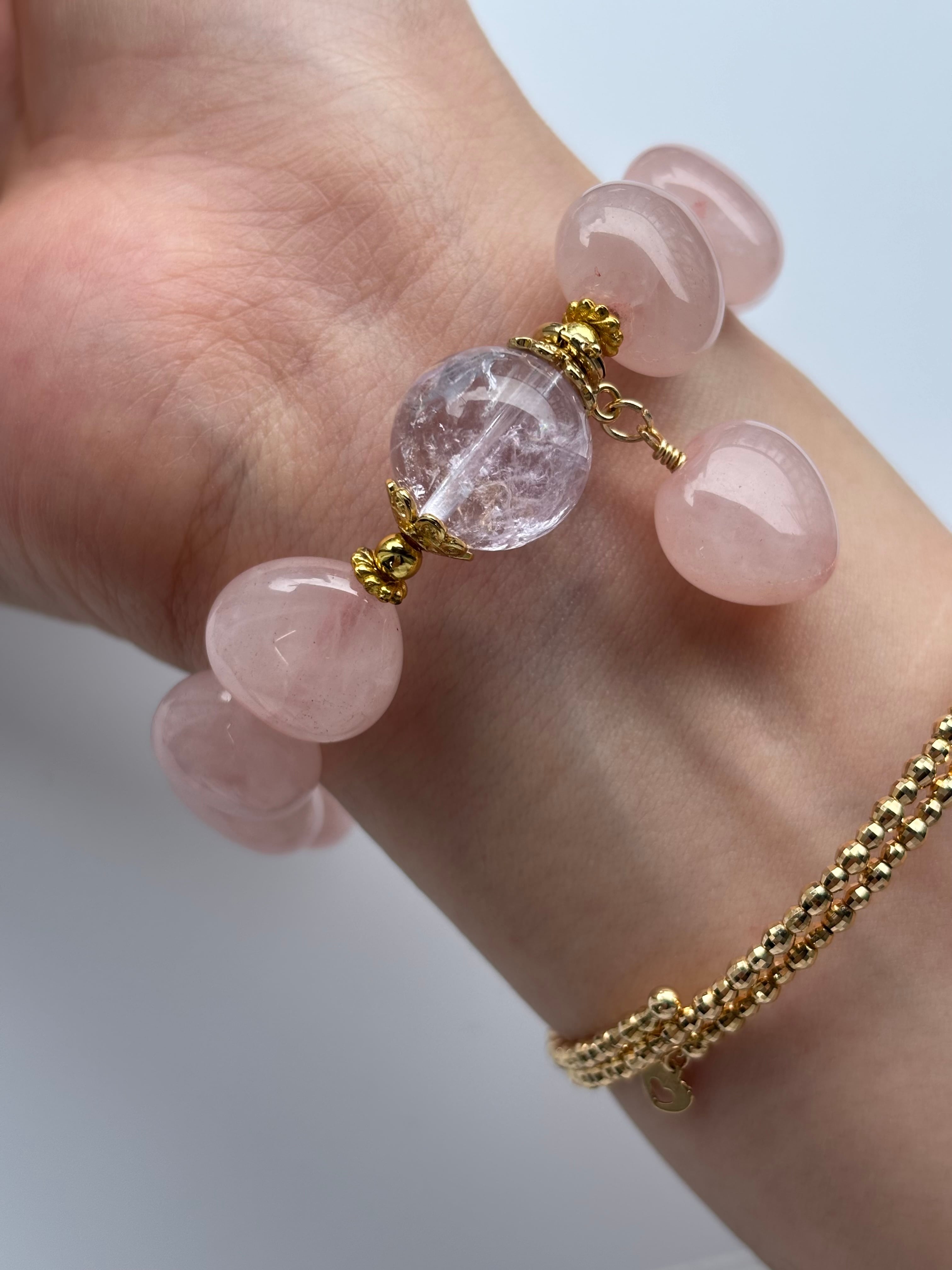 この組み合わせは、アメジストの落ち着いた雰囲気と、ローズクォーツのやさしい印象が自然に馴染み、可愛らしさの中にも静かな上品さを感じられる相性です。見た目の色合わせとしてもまとまりがよく、淡いピンク系がお好きな方には特におすすめです。