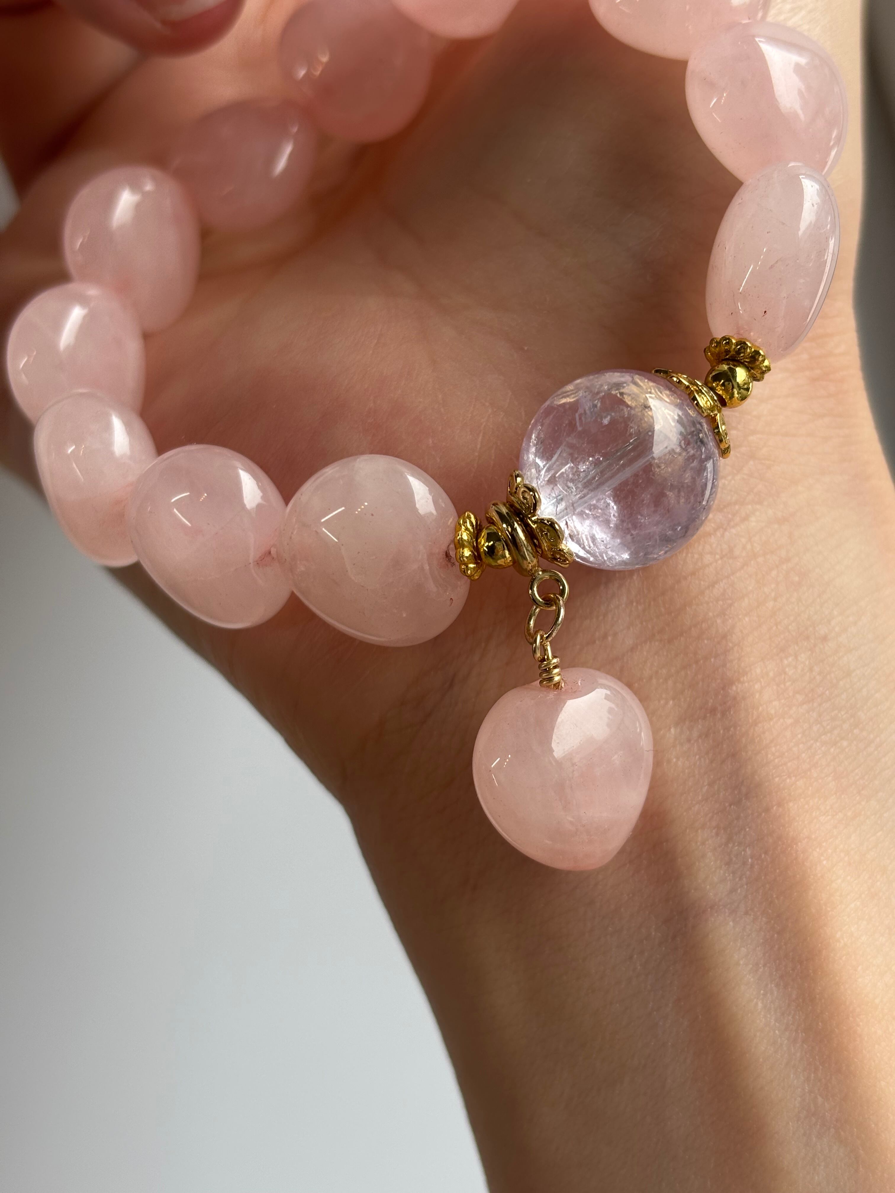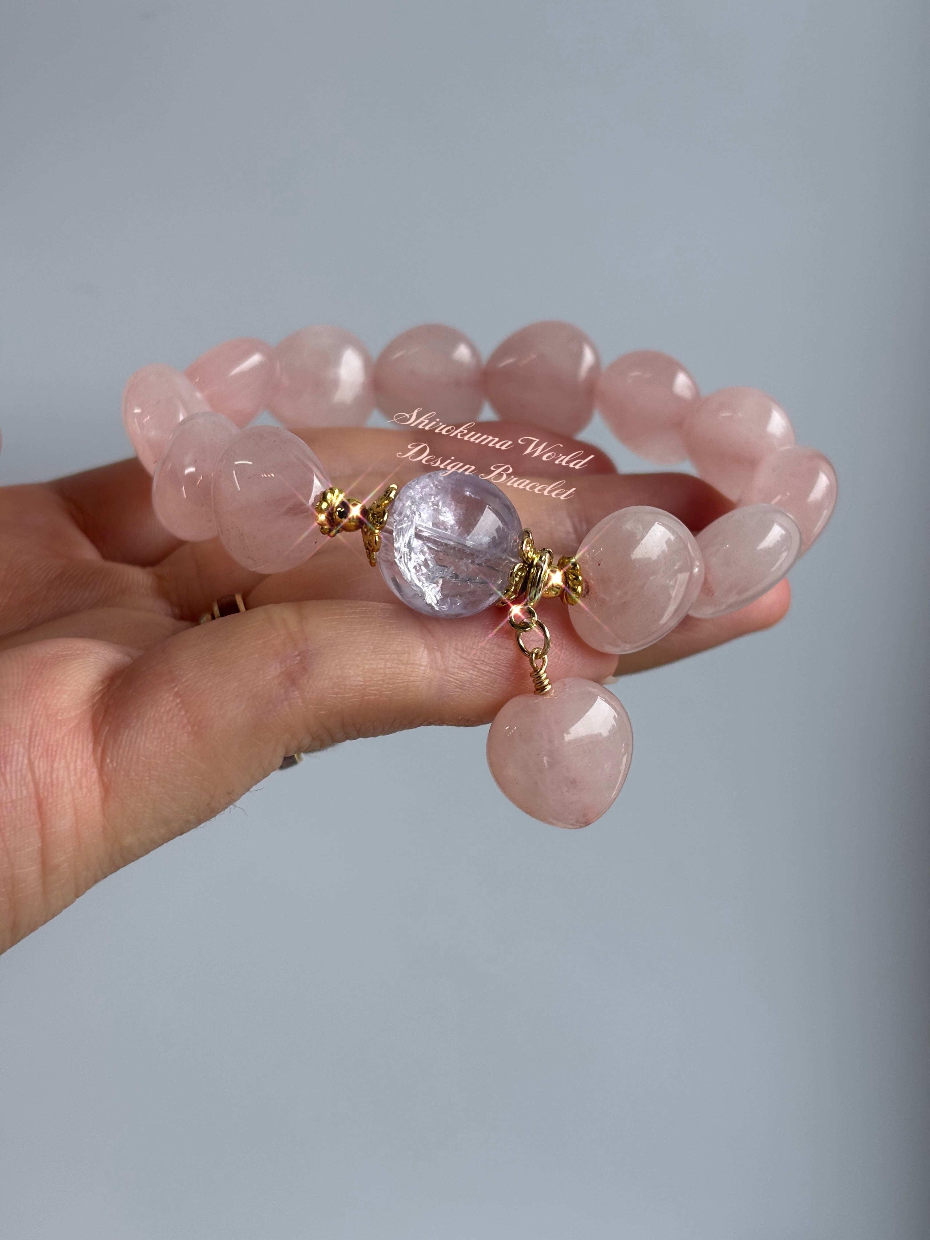 可愛いラベンダーピンクカラーのアイリスピンクアメジストを主役に、ふんわり優しいハート型ローズクォーツを合わせたデザインブレスレットです。