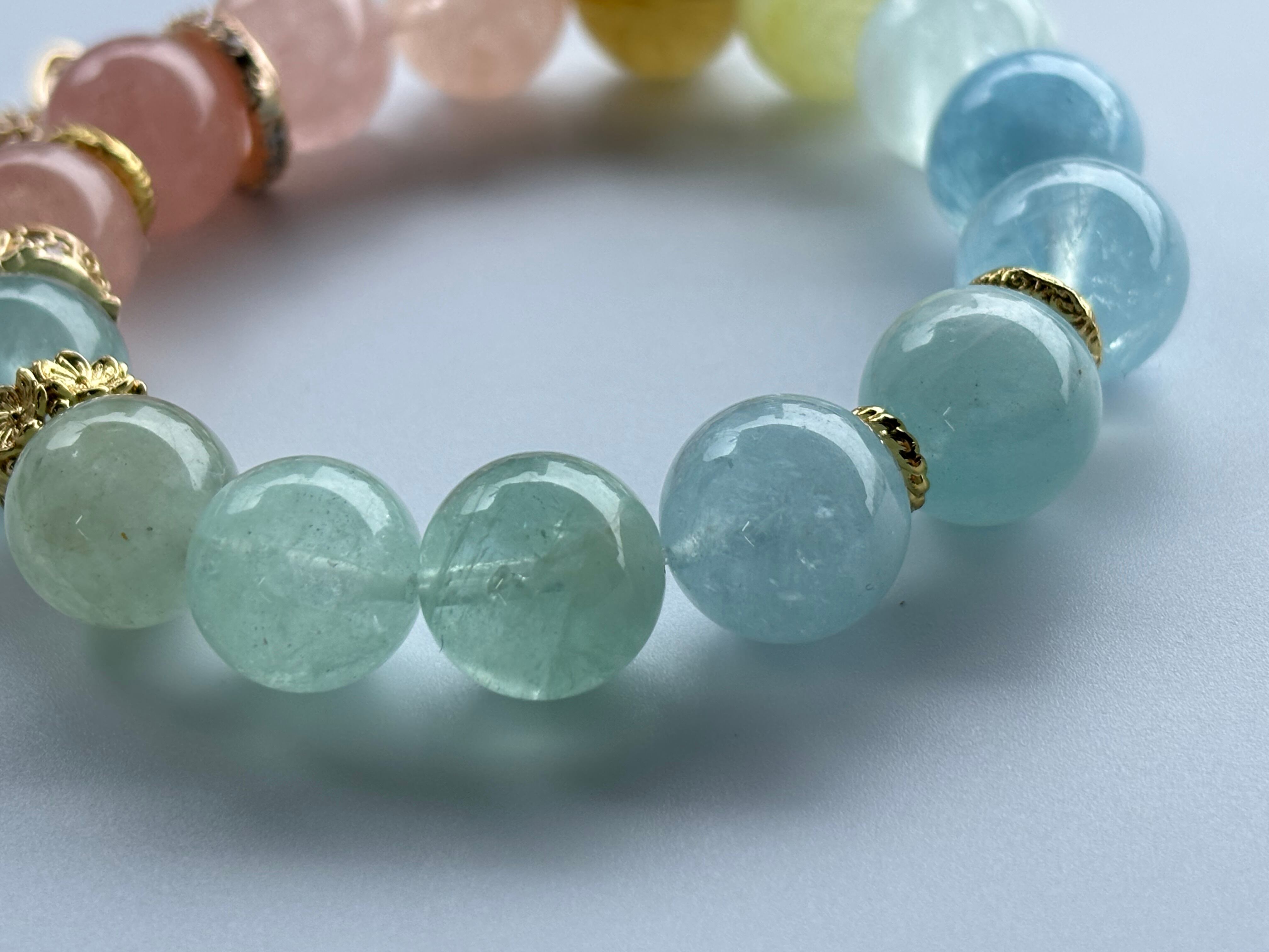アクアマリン、モルガナイト、ヘリオドールなど、さまざまなベリルが織りなす高品質ミックスベリルのデザインブレスレットです。