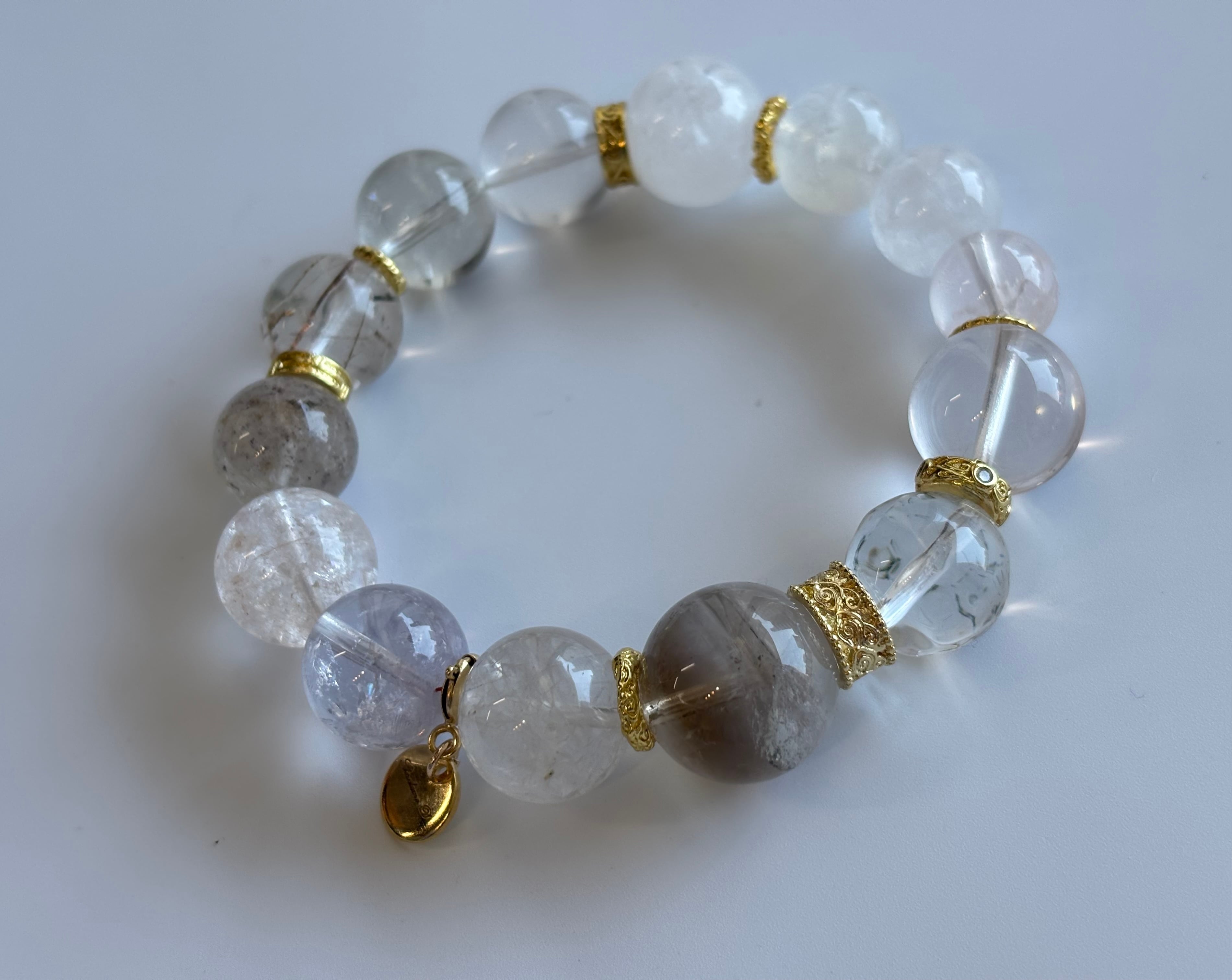 水晶系を中心に、エレスチャルやラダー、マイカなど個性的な内包物を持つ石を組み合わせており、ひと粒ごとに違った魅力があります。