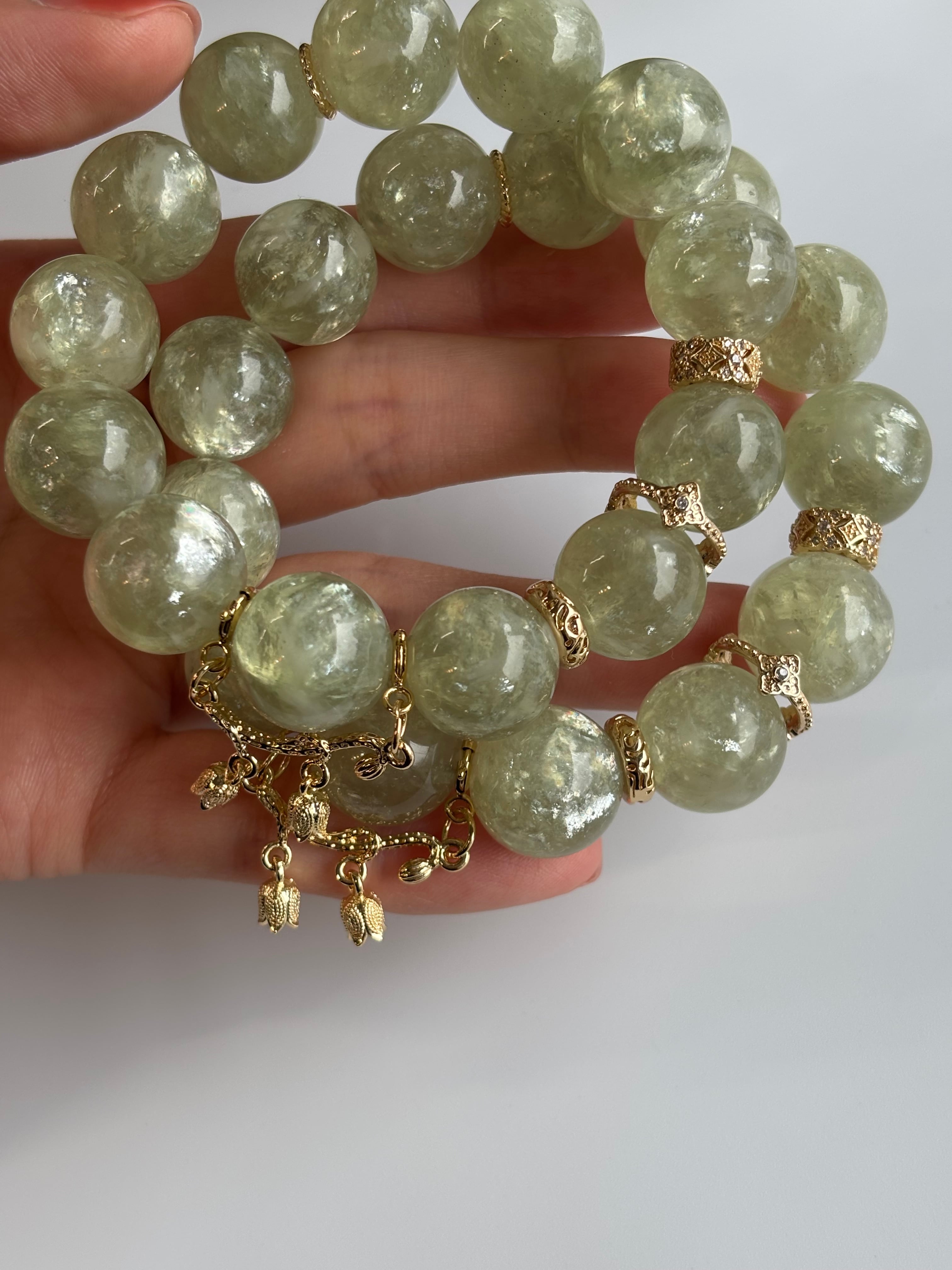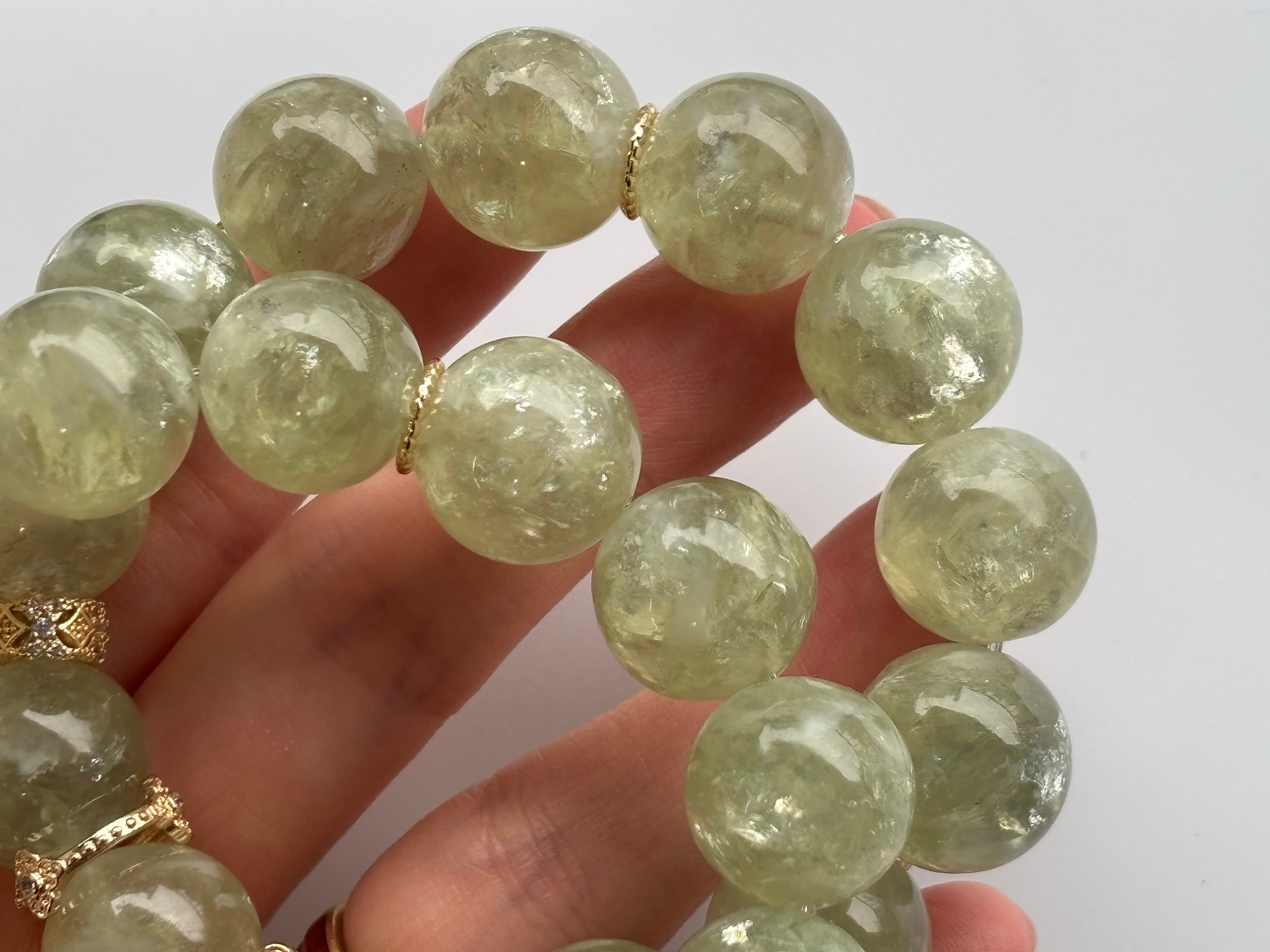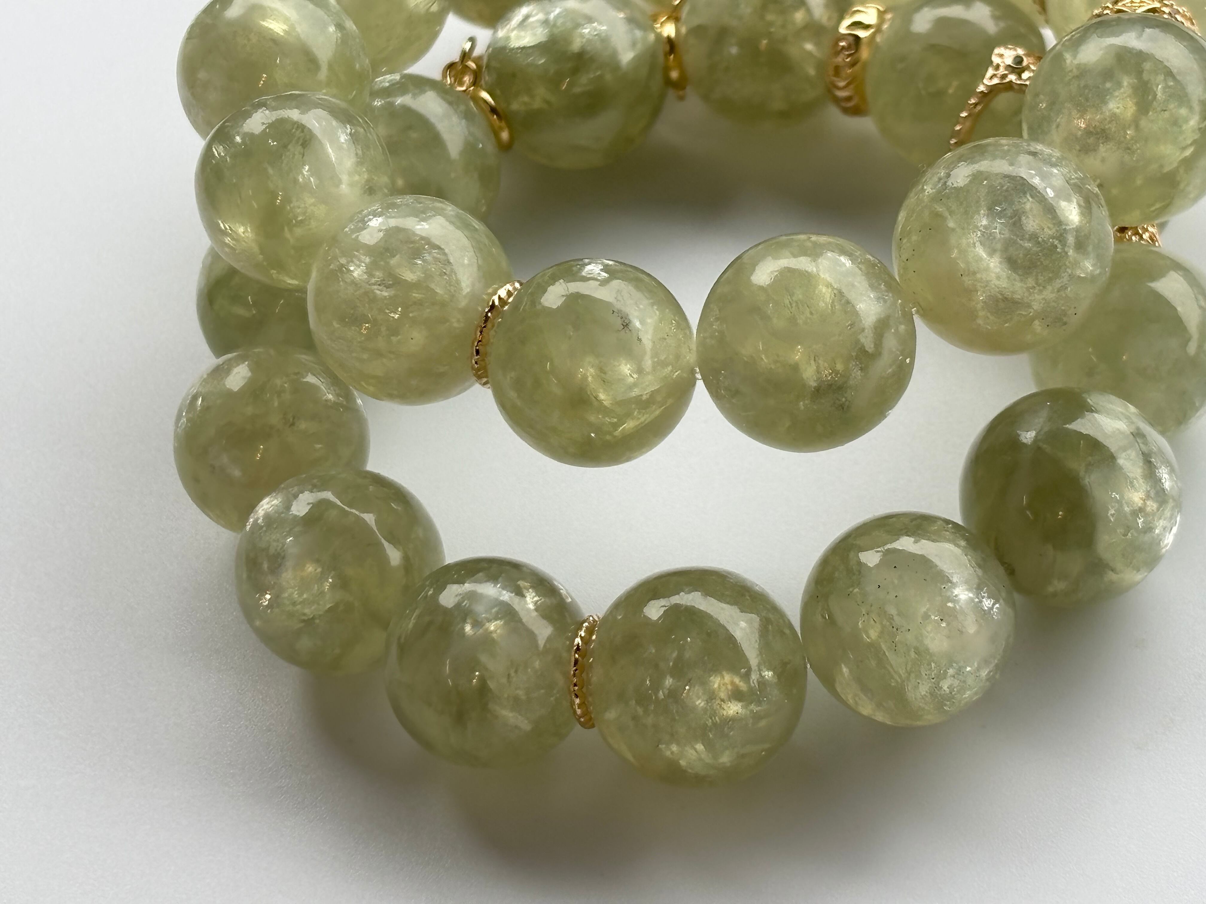 大粒のぷるんとしたゼリーのような質感と、やわらかな天然の抹茶グリーンが印象的なグリーンマイカのデザインブレスレットです。