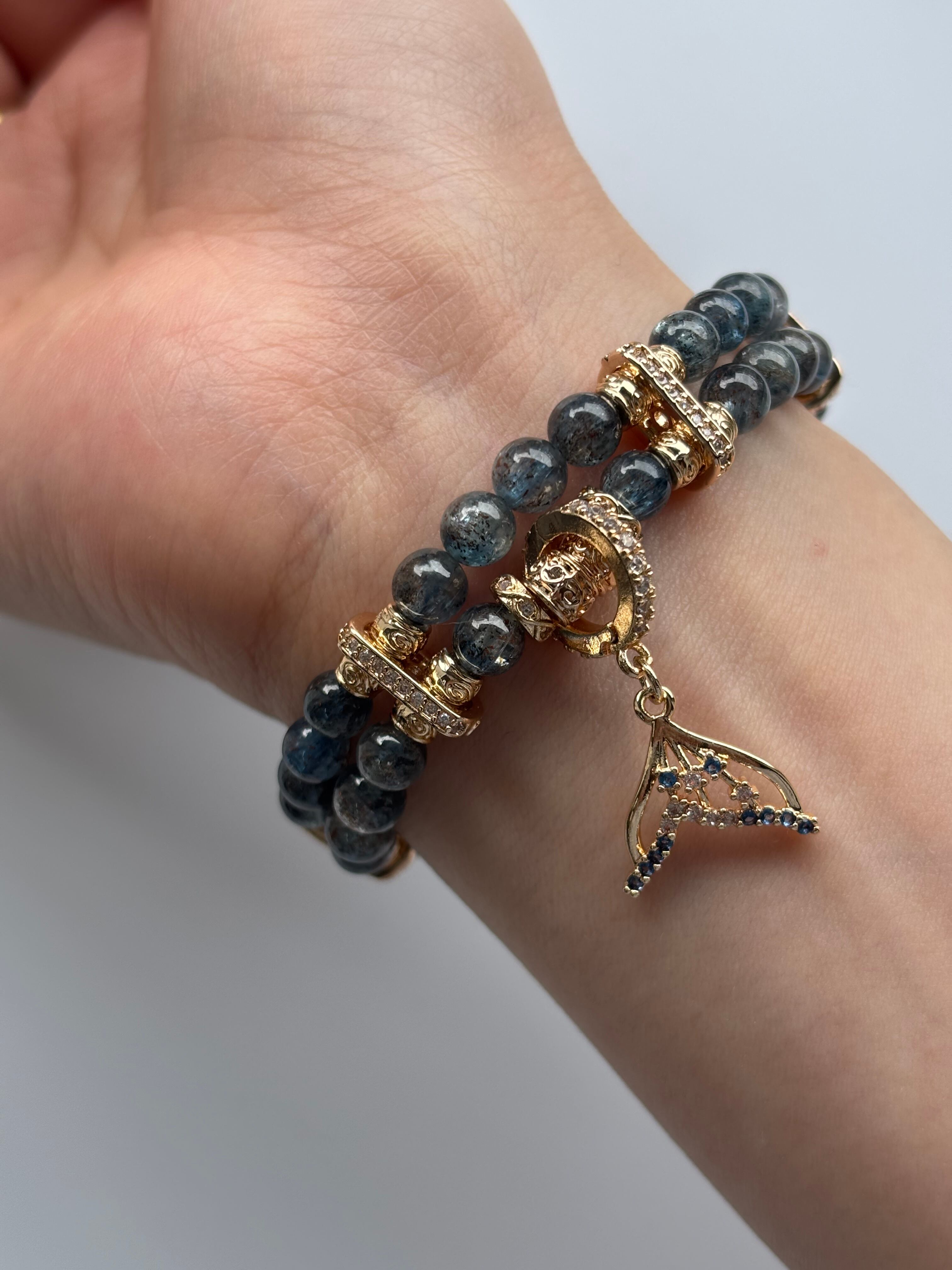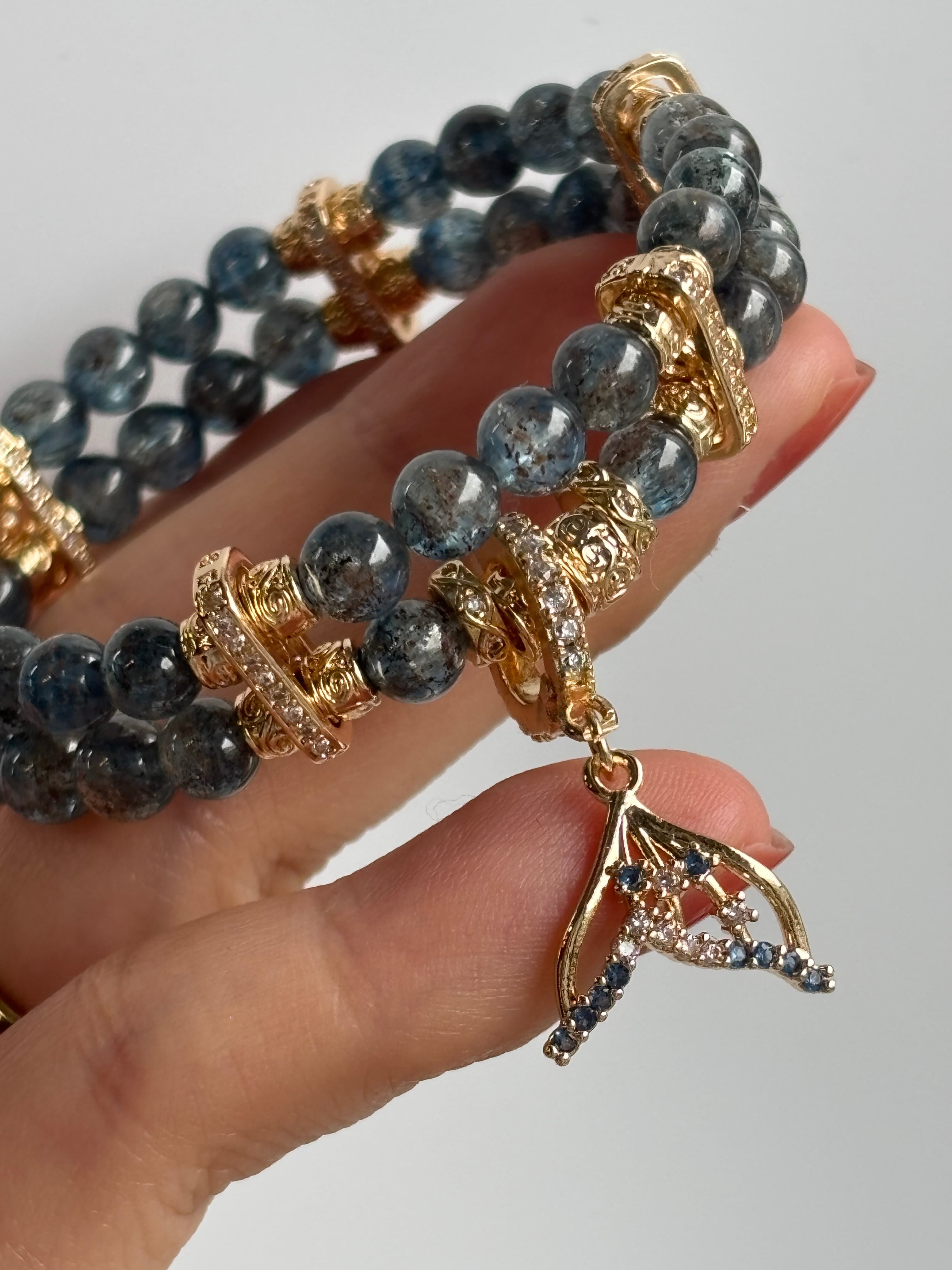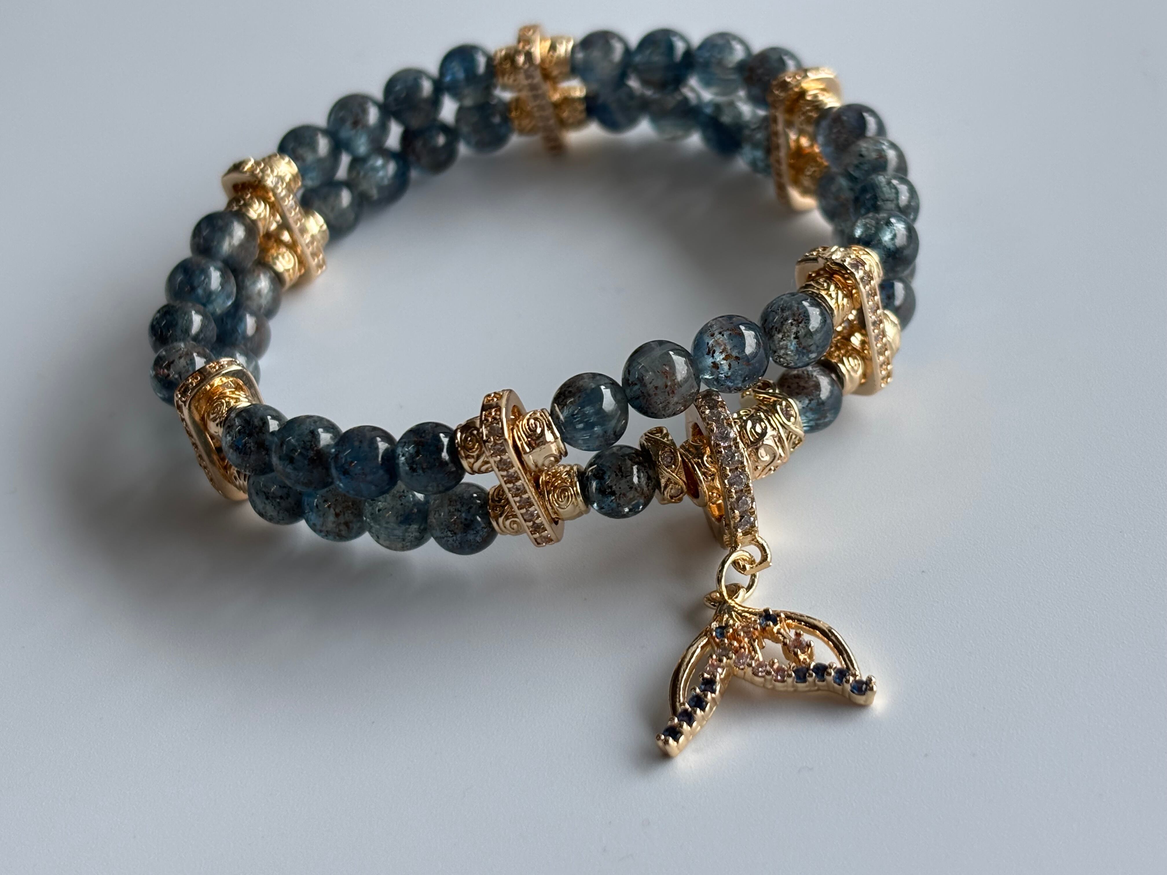 透明感のある澄んだブルーのカイヤナイトの中に、サンストーン由来のアベチュレッセンスが見える粒を使用した固定パーツを使用した二連ブレスレット。