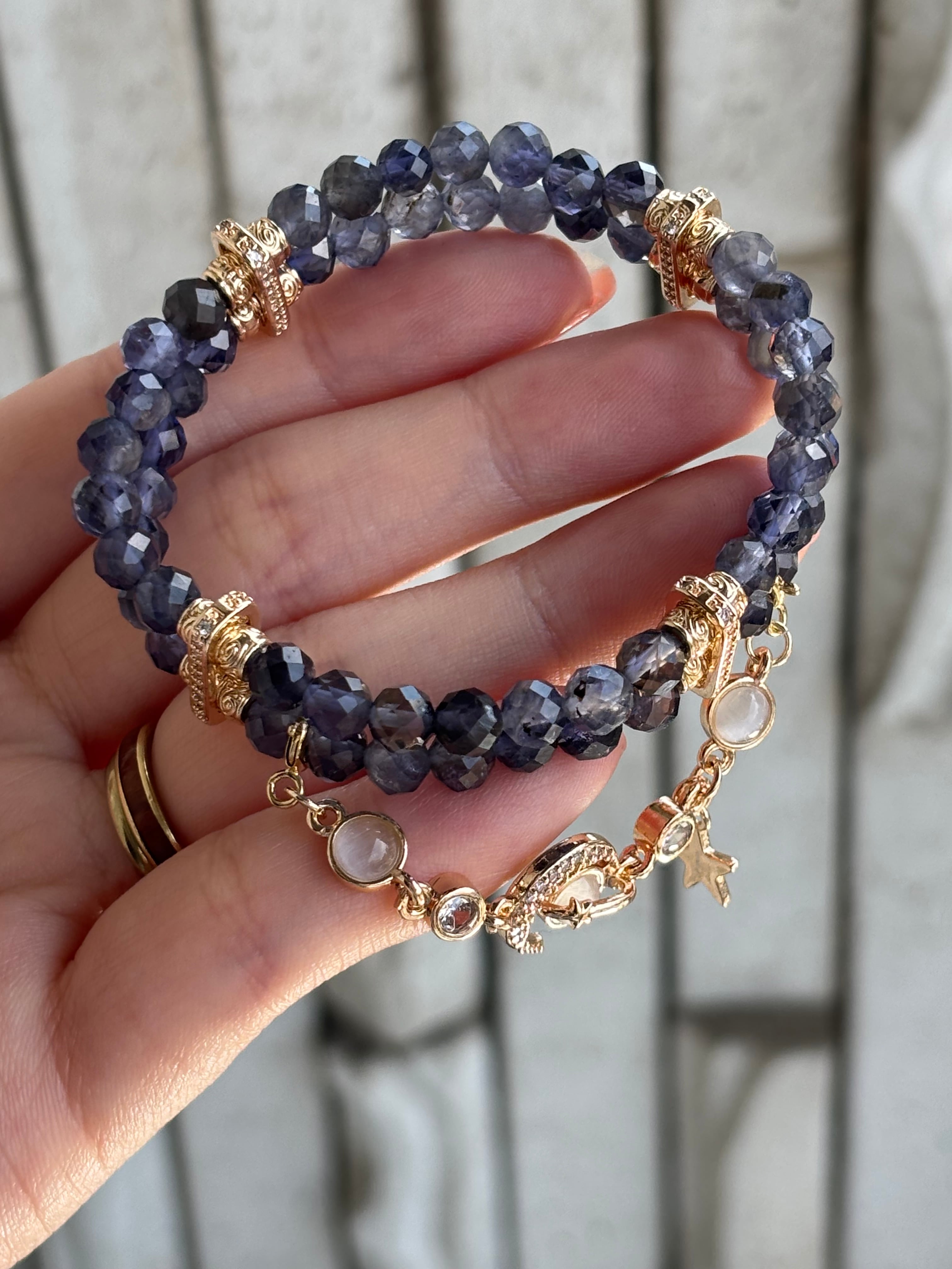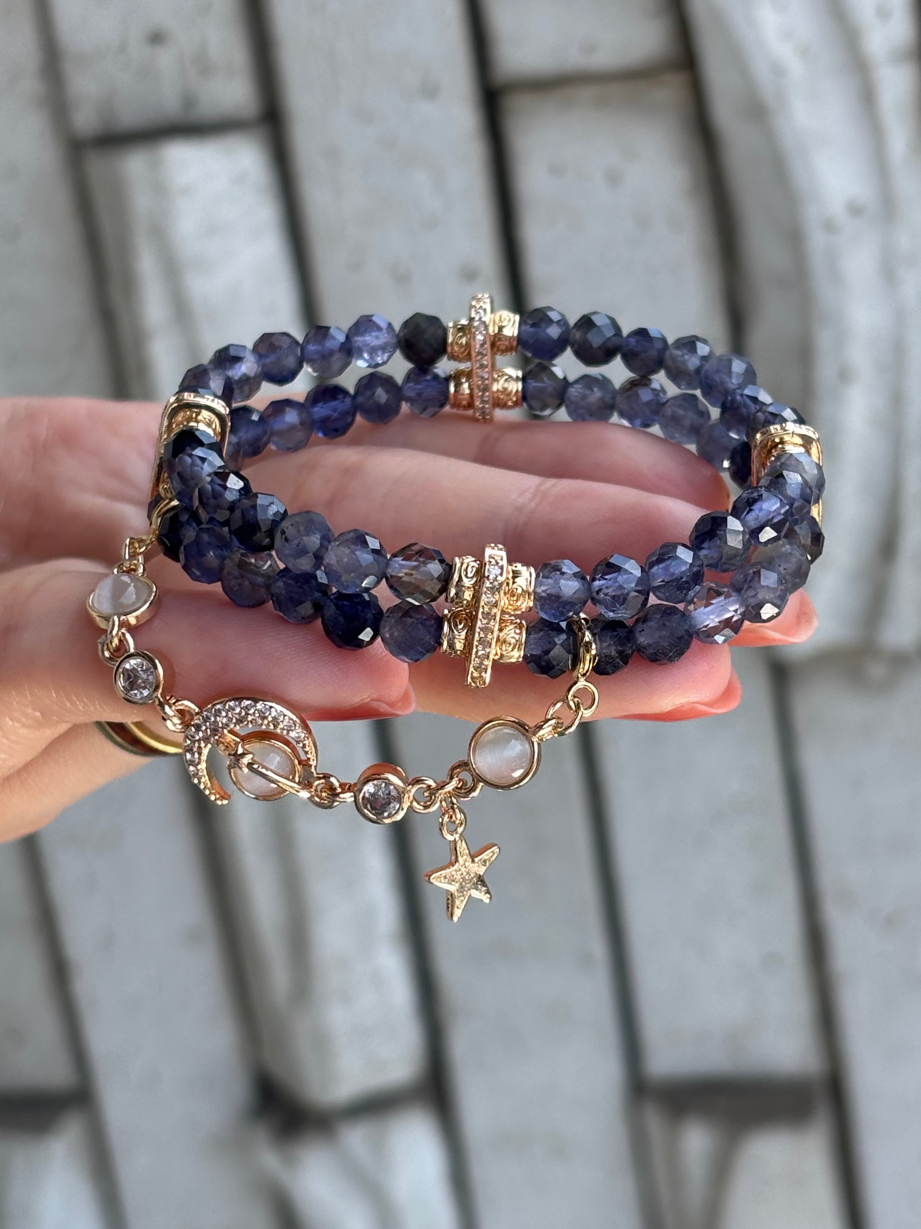 キラキラと宝石カットが美しい、高品質アイオライトの二連デザインブレスレットです。