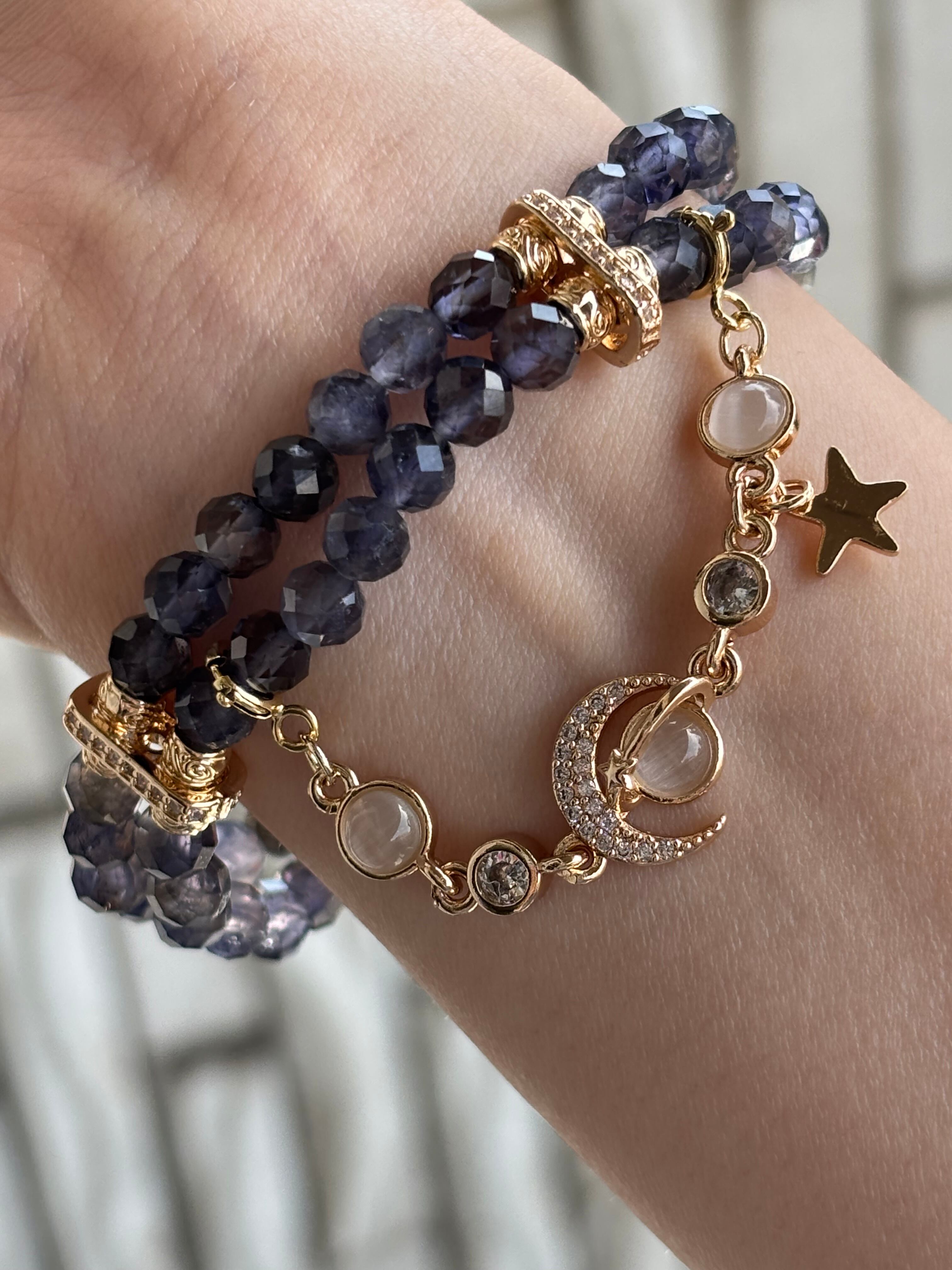 ゴールドカラーのパーツで二連を固定し、夜空のようなアイオライトに、月や星のチャームを合わせたデザインに仕立てました。