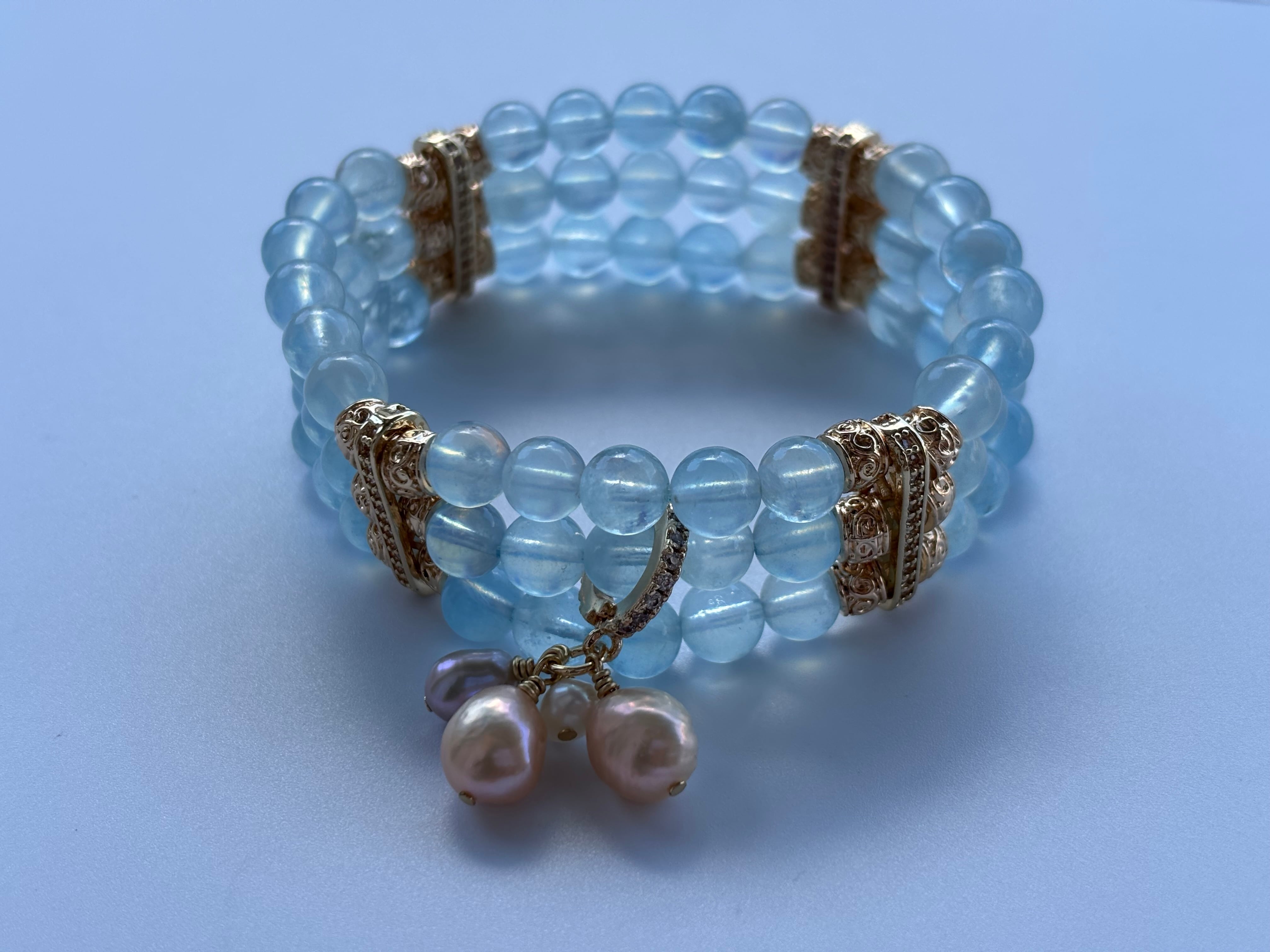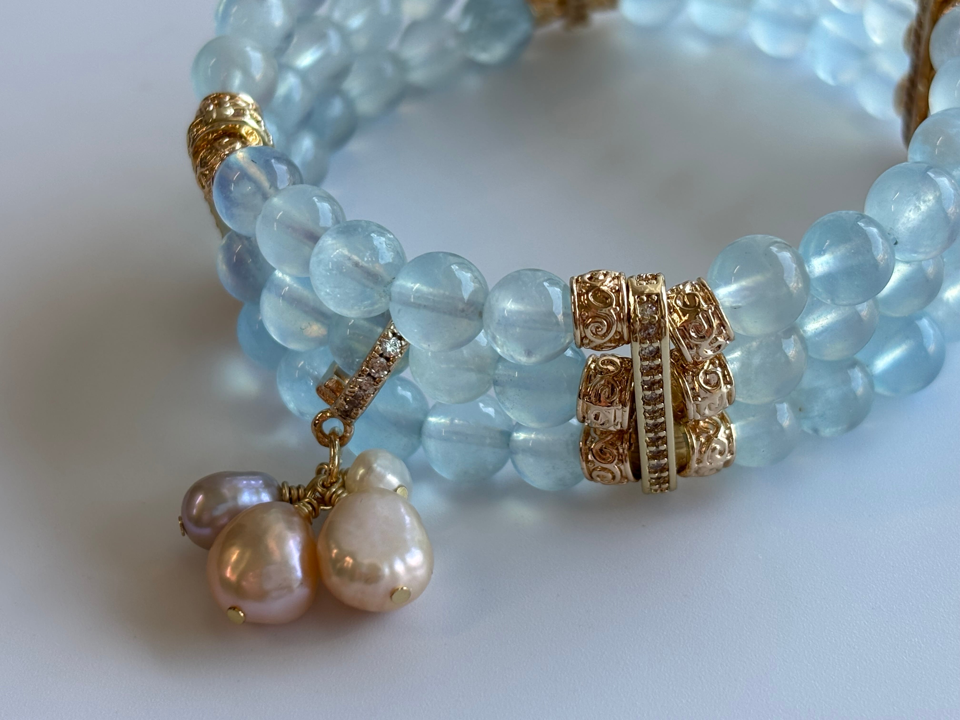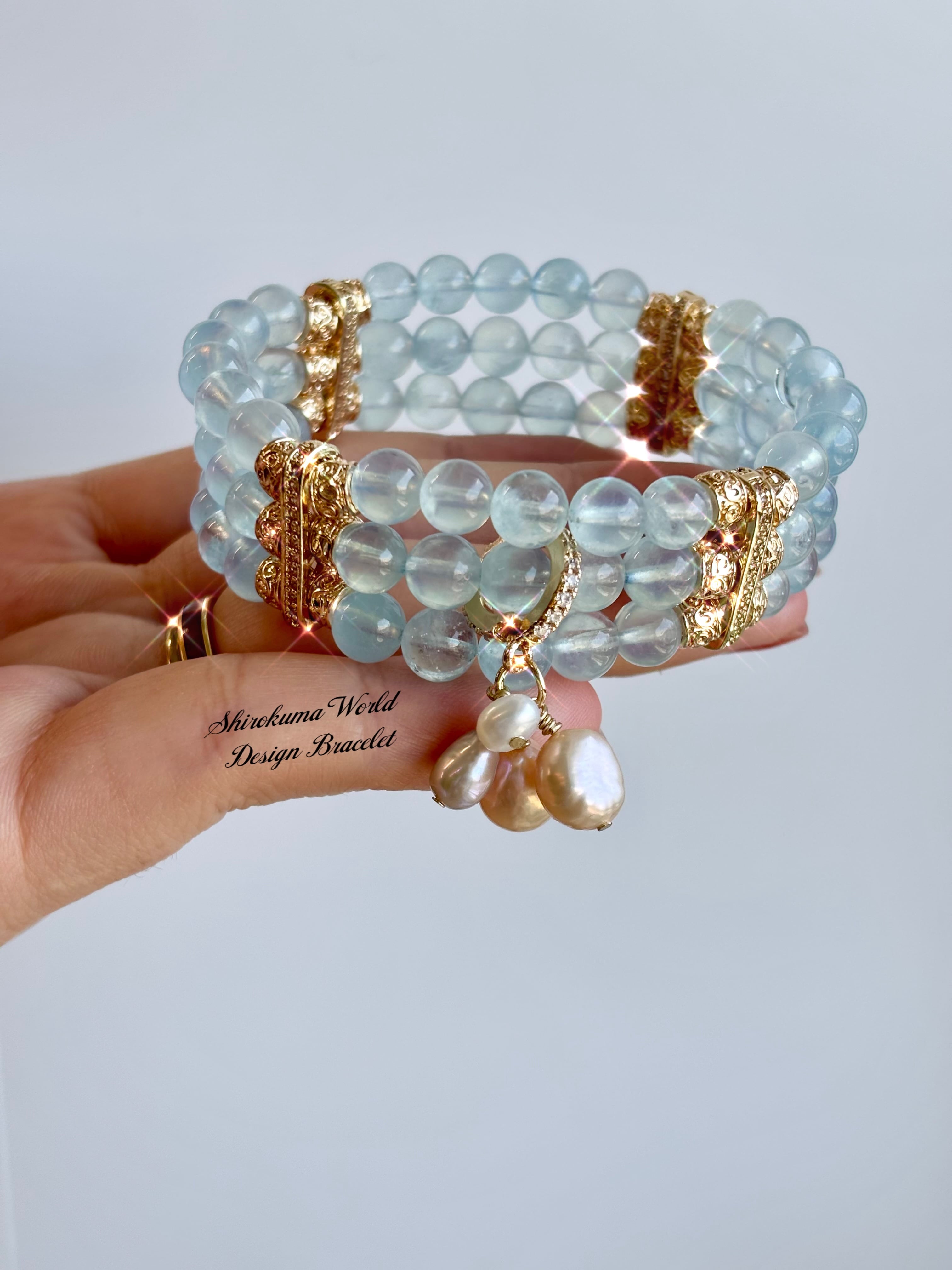 王道のアクアマリンらしい爽やかさと、ちゅるんとした透明感が魅力の三連デザインブレスレットです。