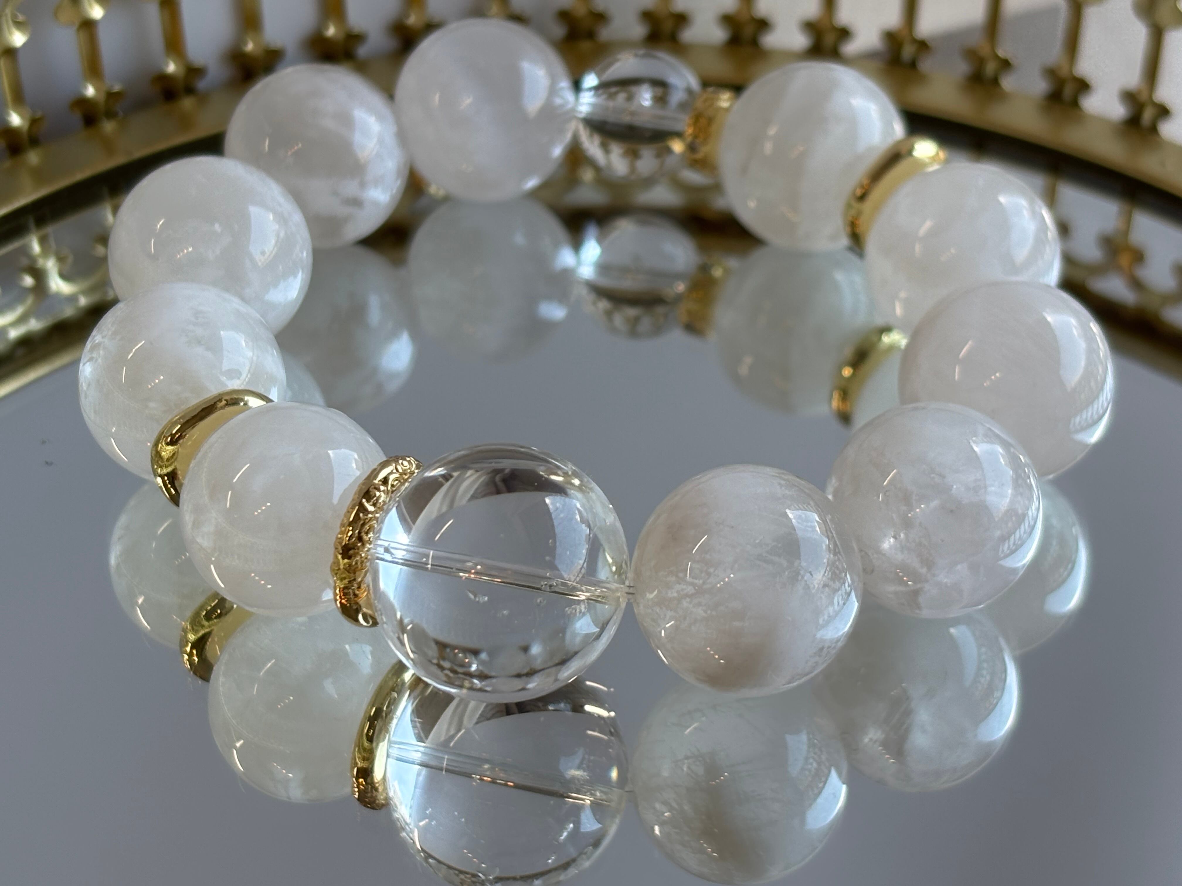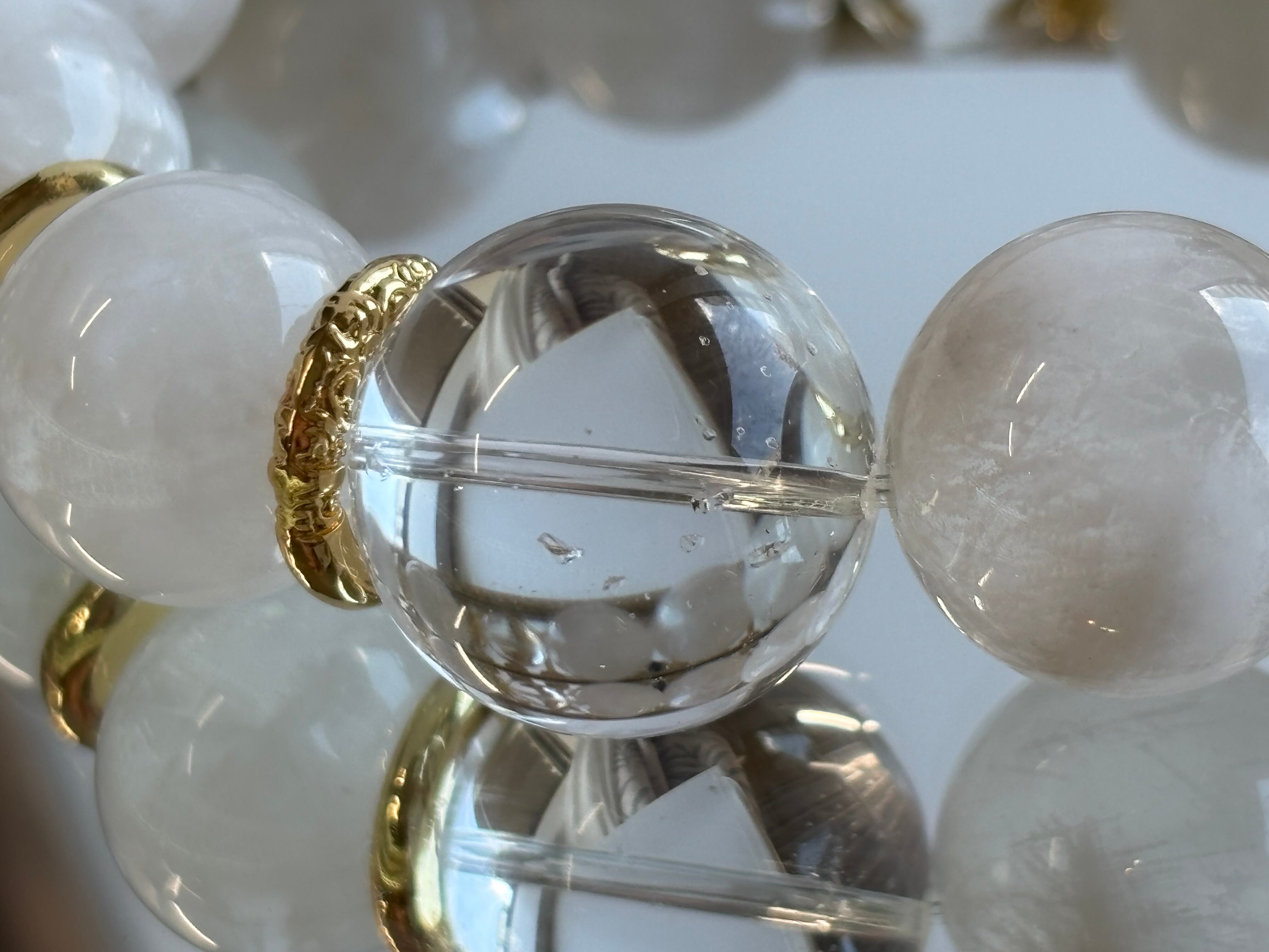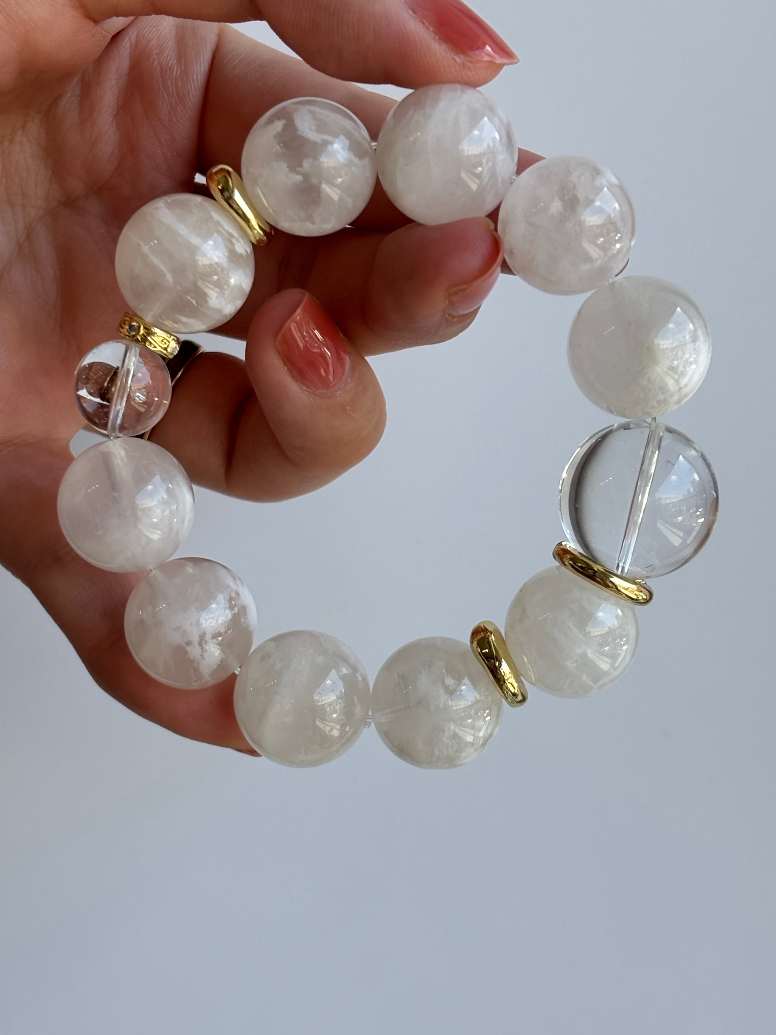 シュワシュワと炭酸水のような内包が美しいネガティブクォーツをトップに、ふんわりと雲のような表情を持つ大粒セリサイトインクォーツを合わせたデザインブレスレットです。