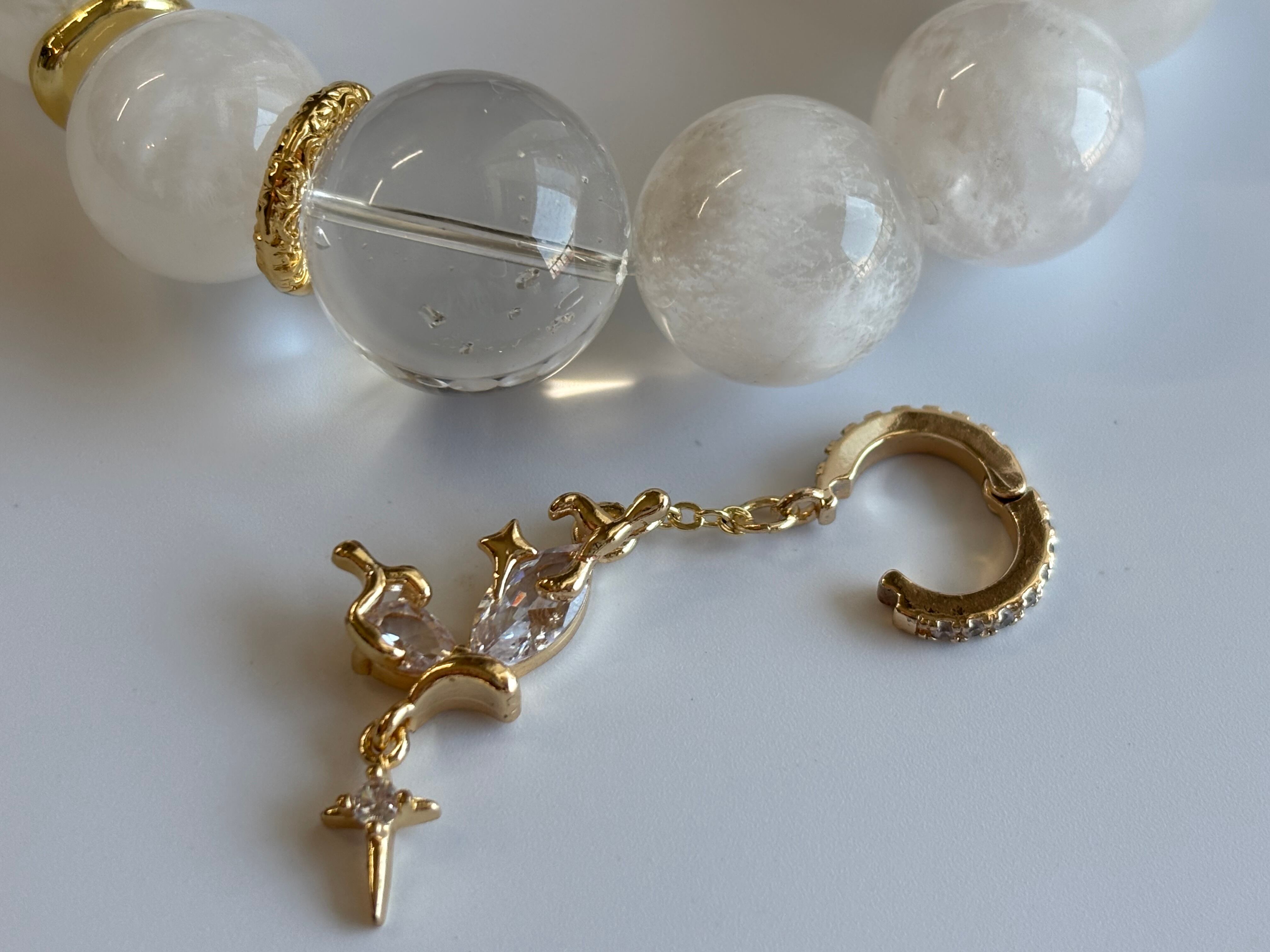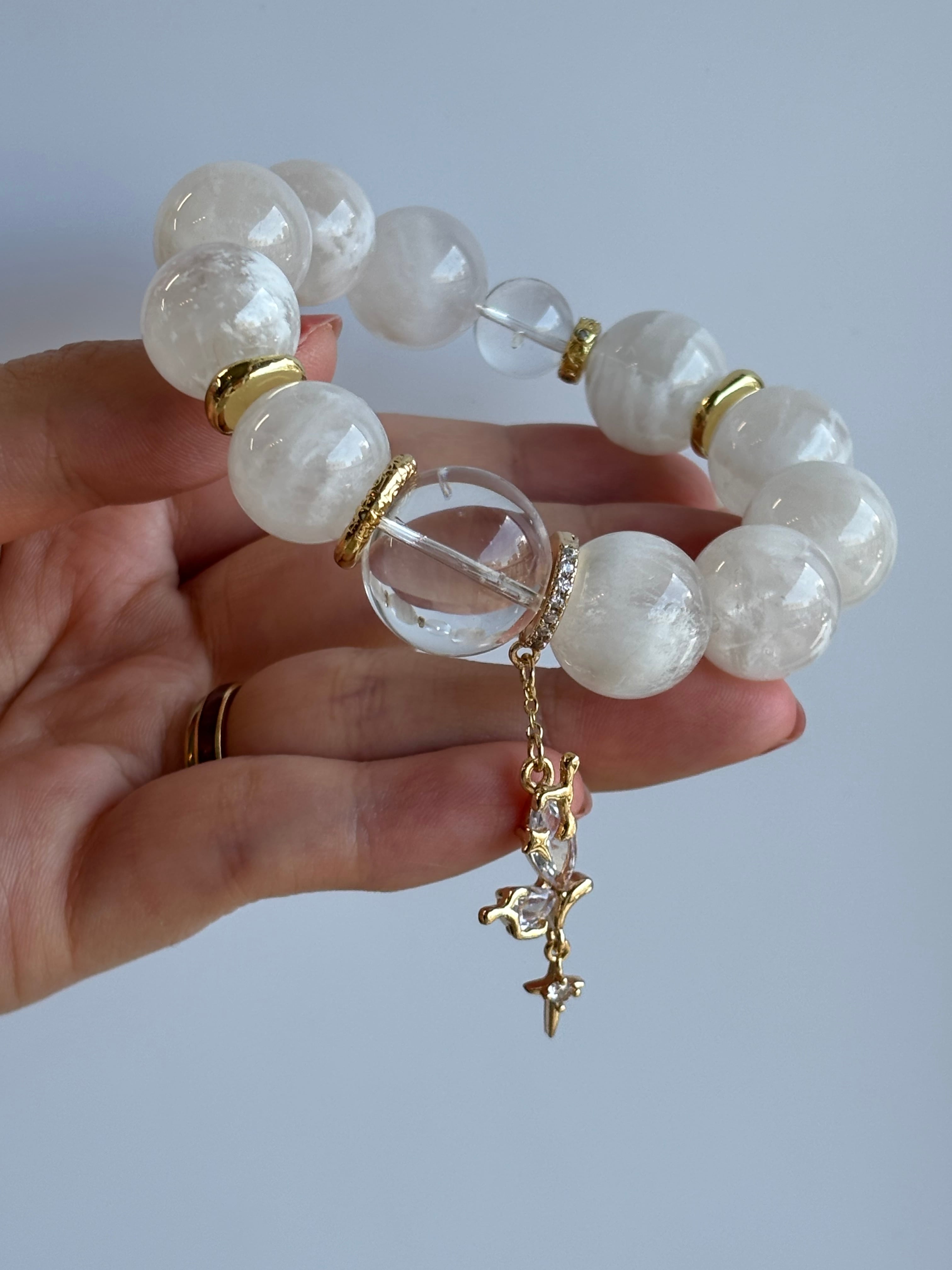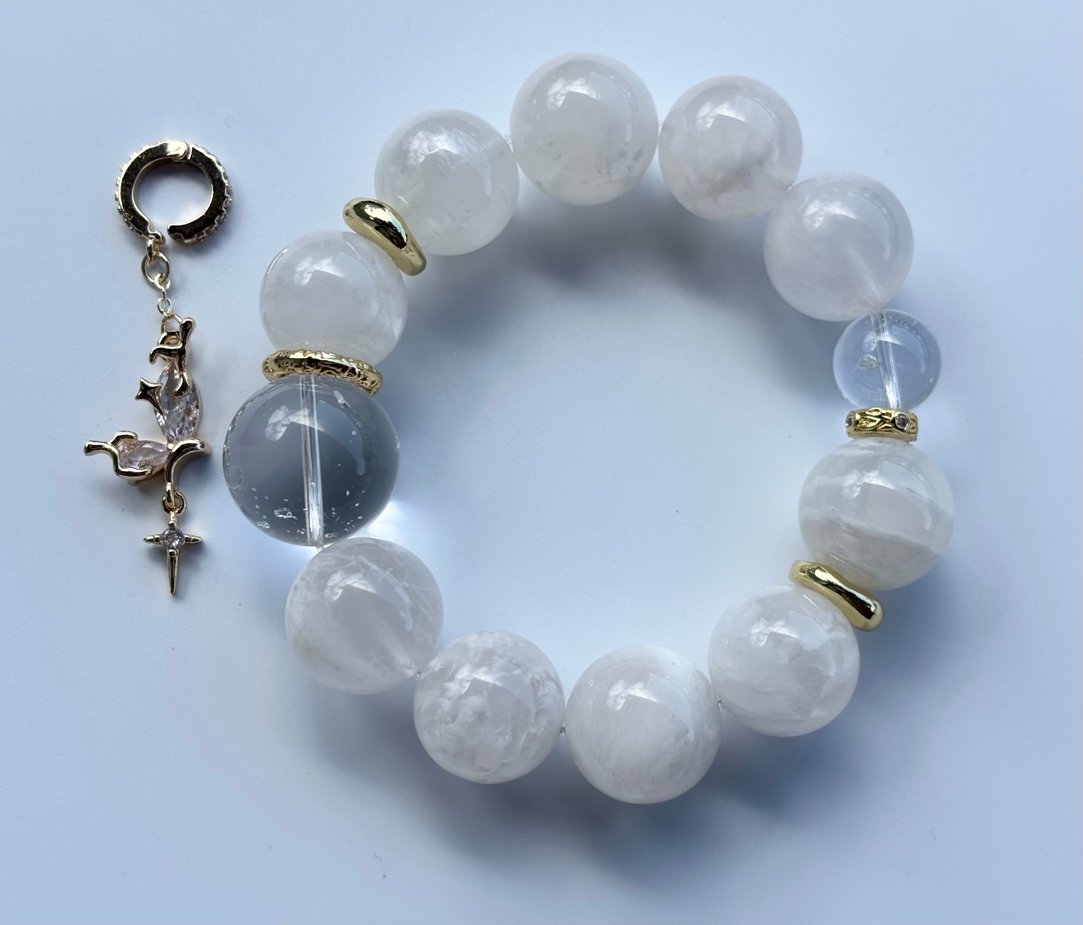 シュワシュワと炭酸水のような内包が美しいネガティブクォーツをトップに、ふんわりと雲のような表情を持つ大粒セリサイトインクォーツを合わせたデザインブレスレットです。