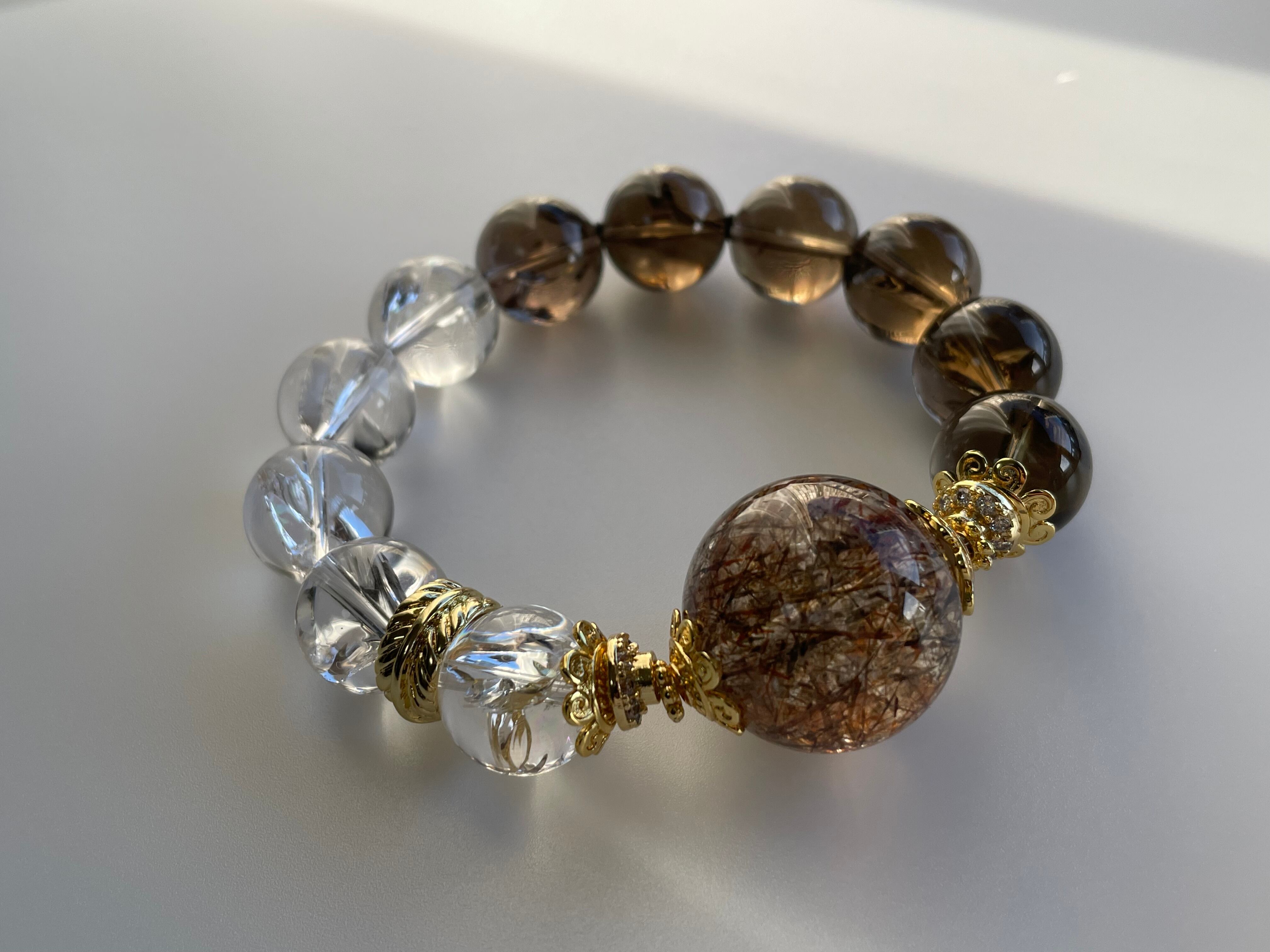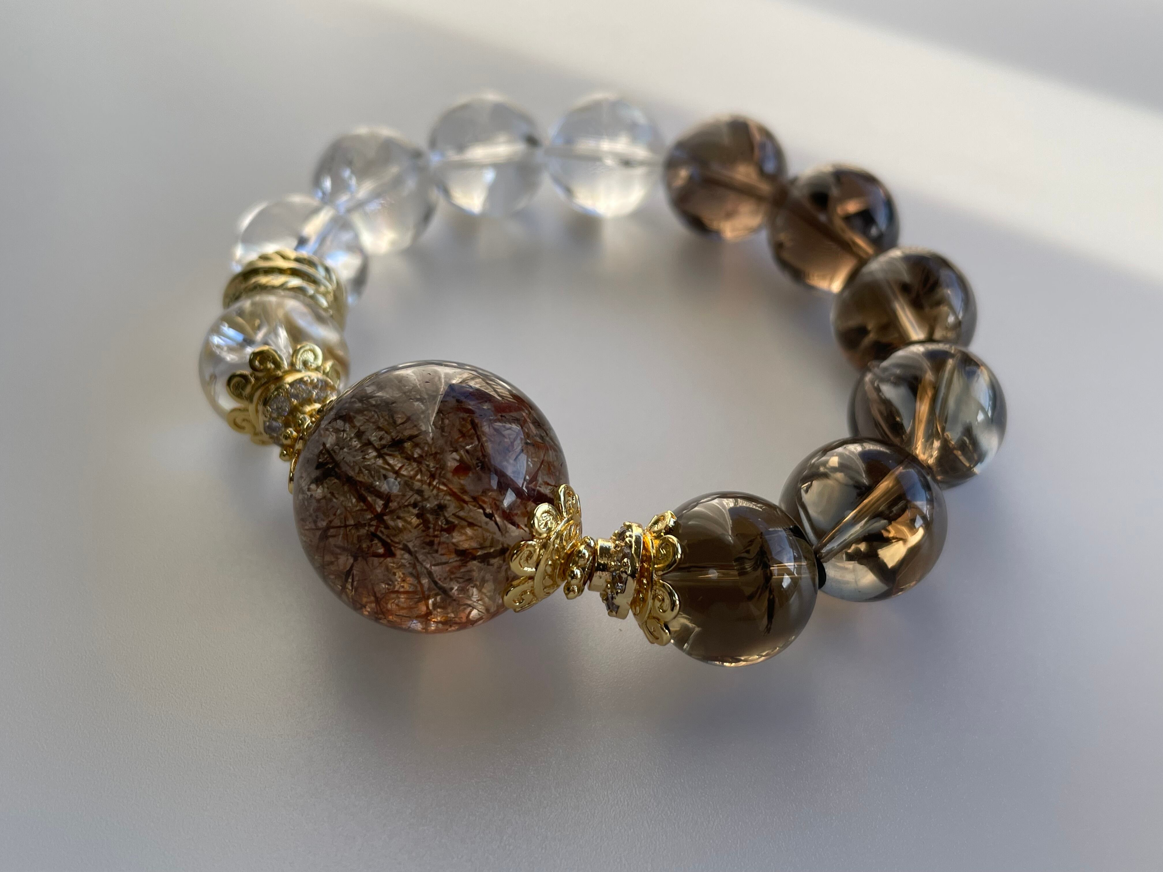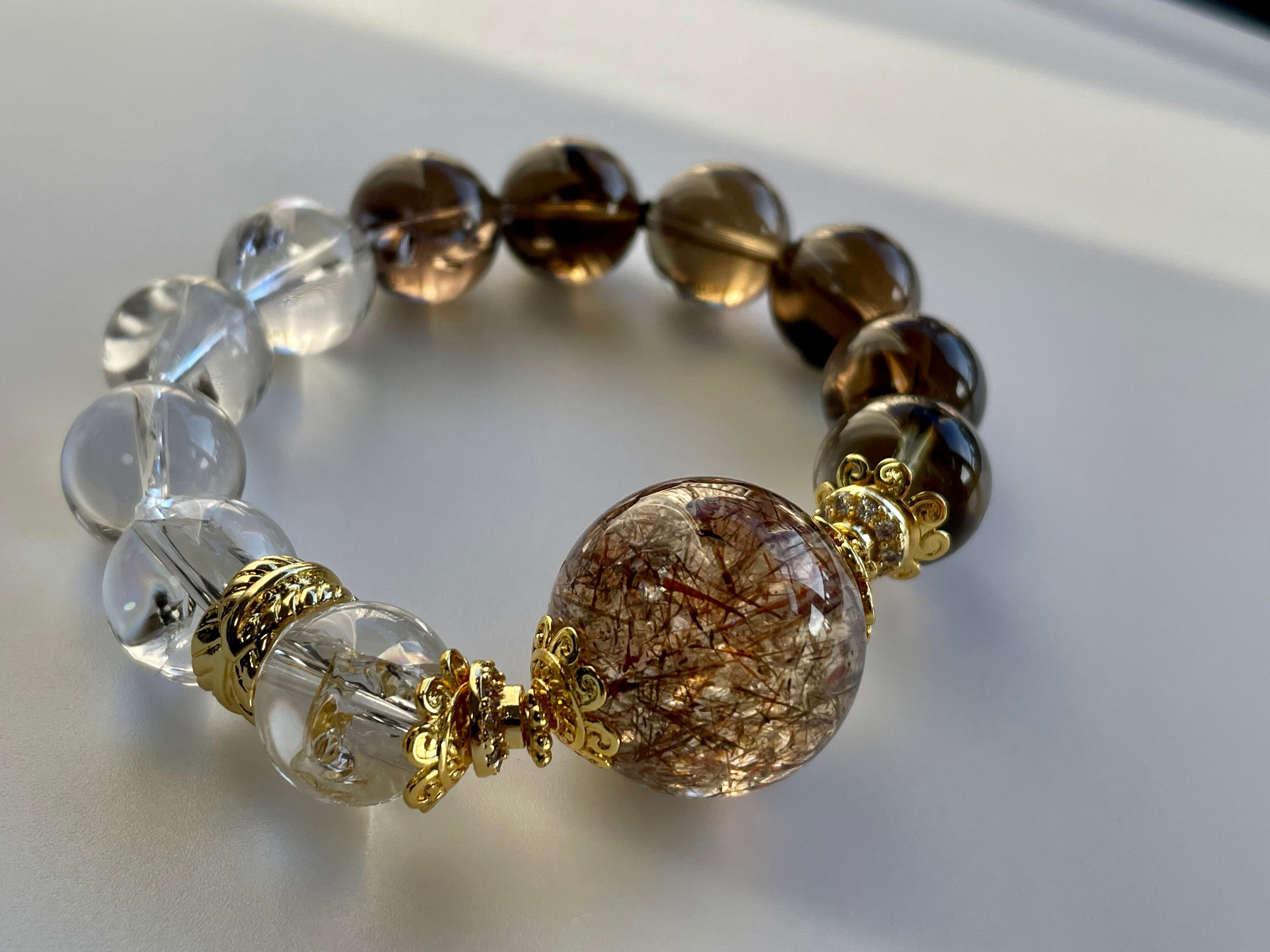 大粒のスーパーセブンはゴールド、ブラウン、オレンジの針が沢山あり、シラーが見える部分や、煌めきもあり、見ていて飽きないです。