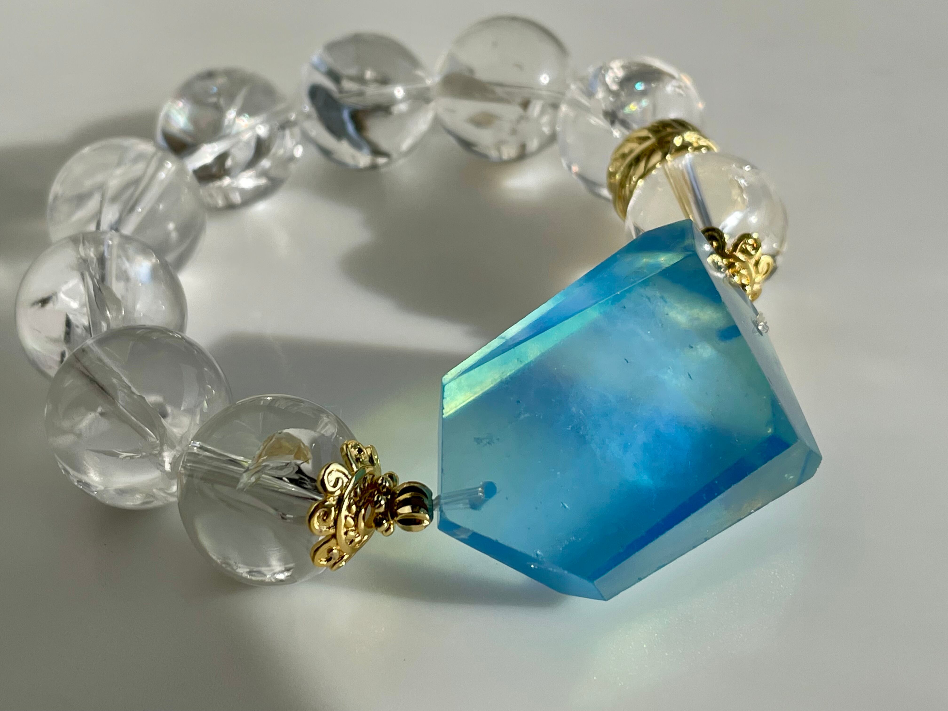 トップのディープアクアマリンは光に当たると海が太陽に照らされてキラキラ光るようなカラーで、虹たっぷりなアイリスクォーツと組み合わせると空や海や太陽を詰め込んだようなブレスレットに仕上がりました。