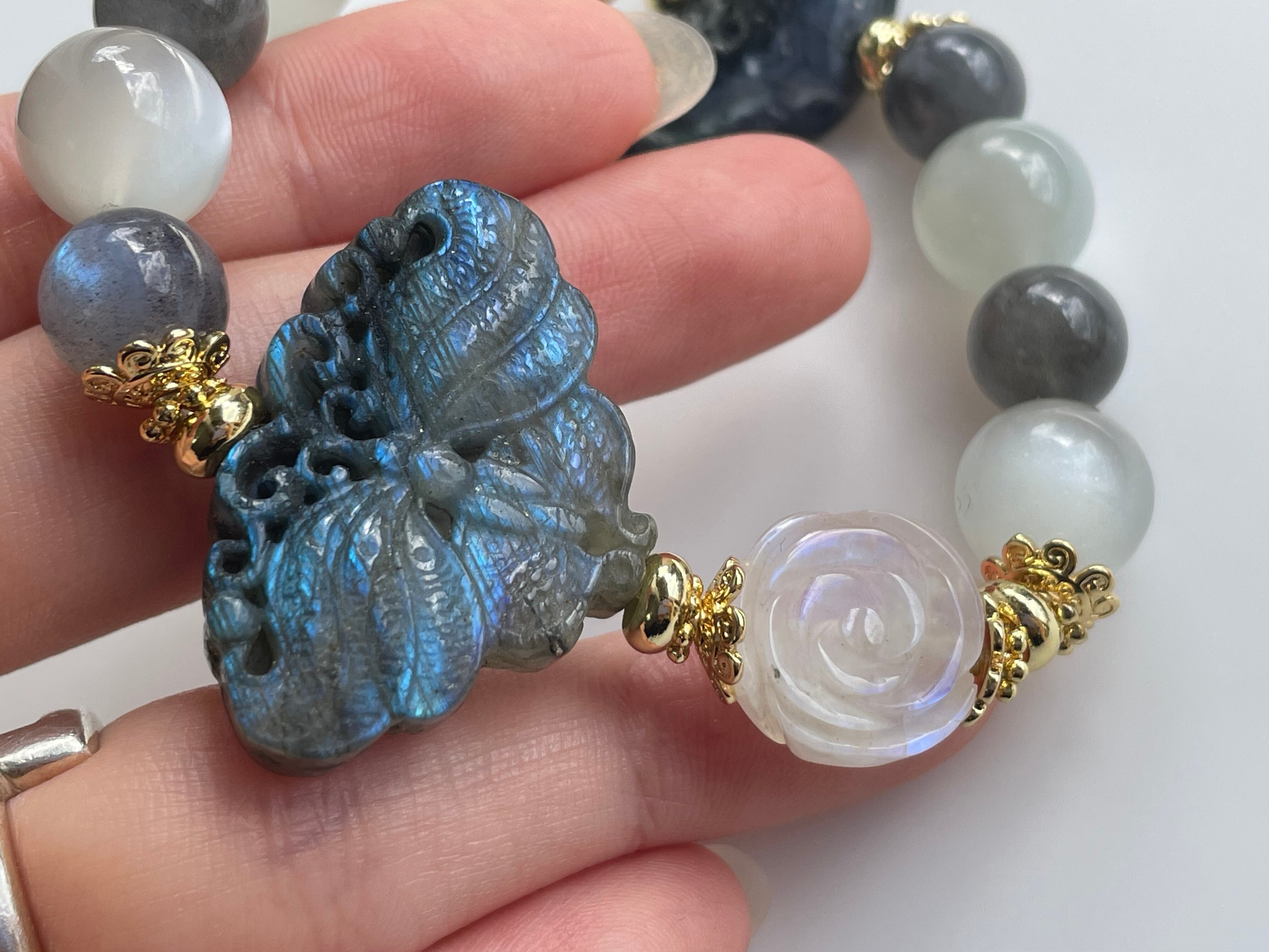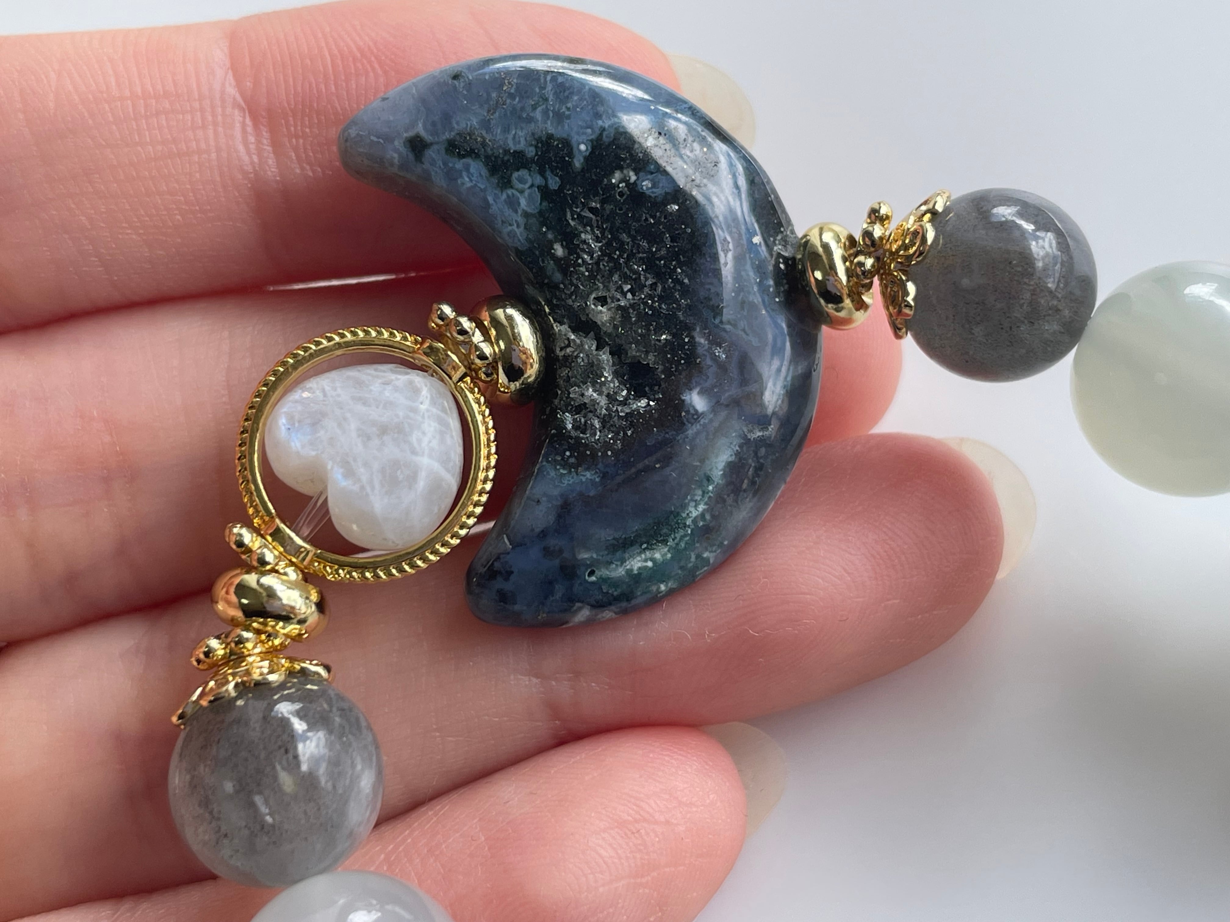シラーの美しいラブラドライトの蝶やムーンストーンのハート薔薇で、オーシャンジャスパーの月はキラキラのジオード付きです(><)