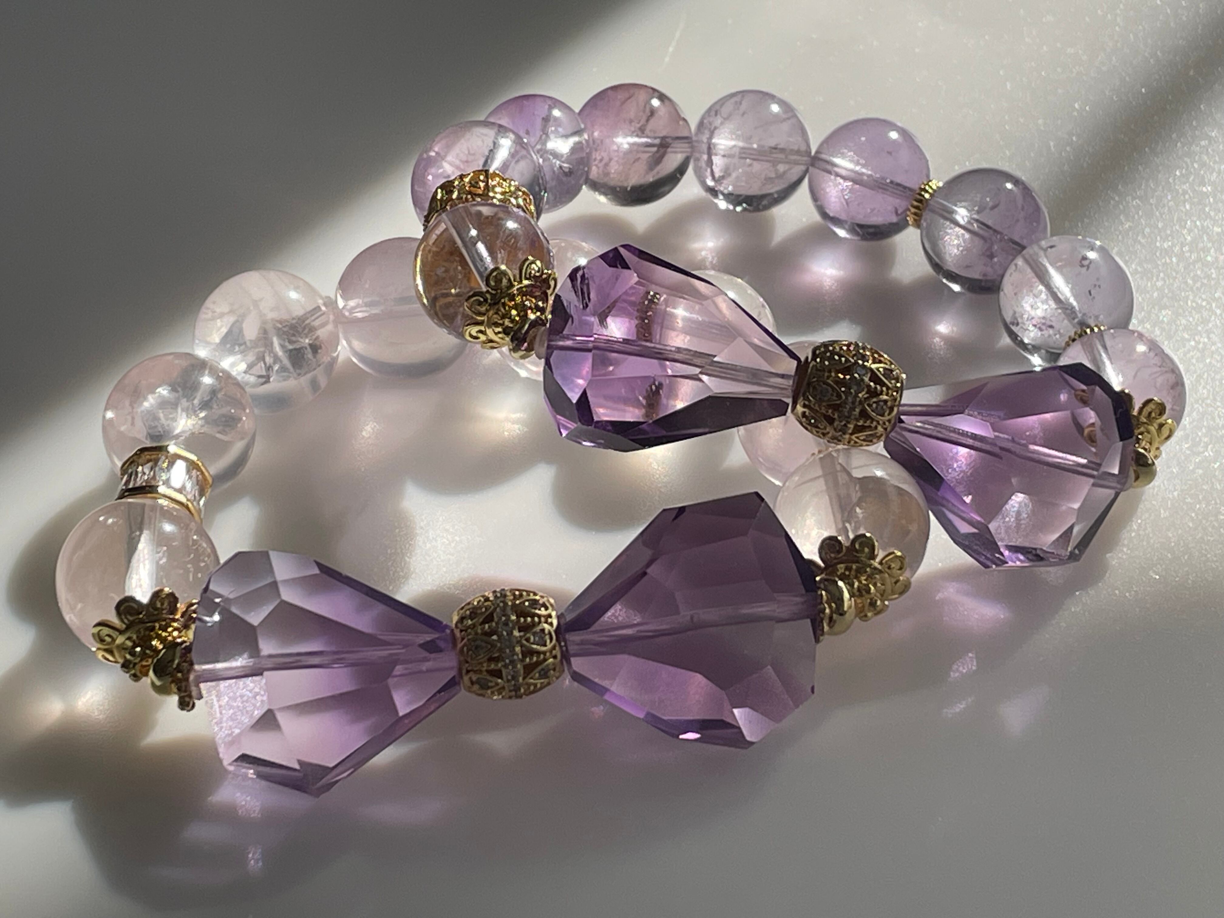 高品質のアメジストをリボン風に組んでアイリスの見える綺麗なピンクラベンダー組んでキュートに作成しました。