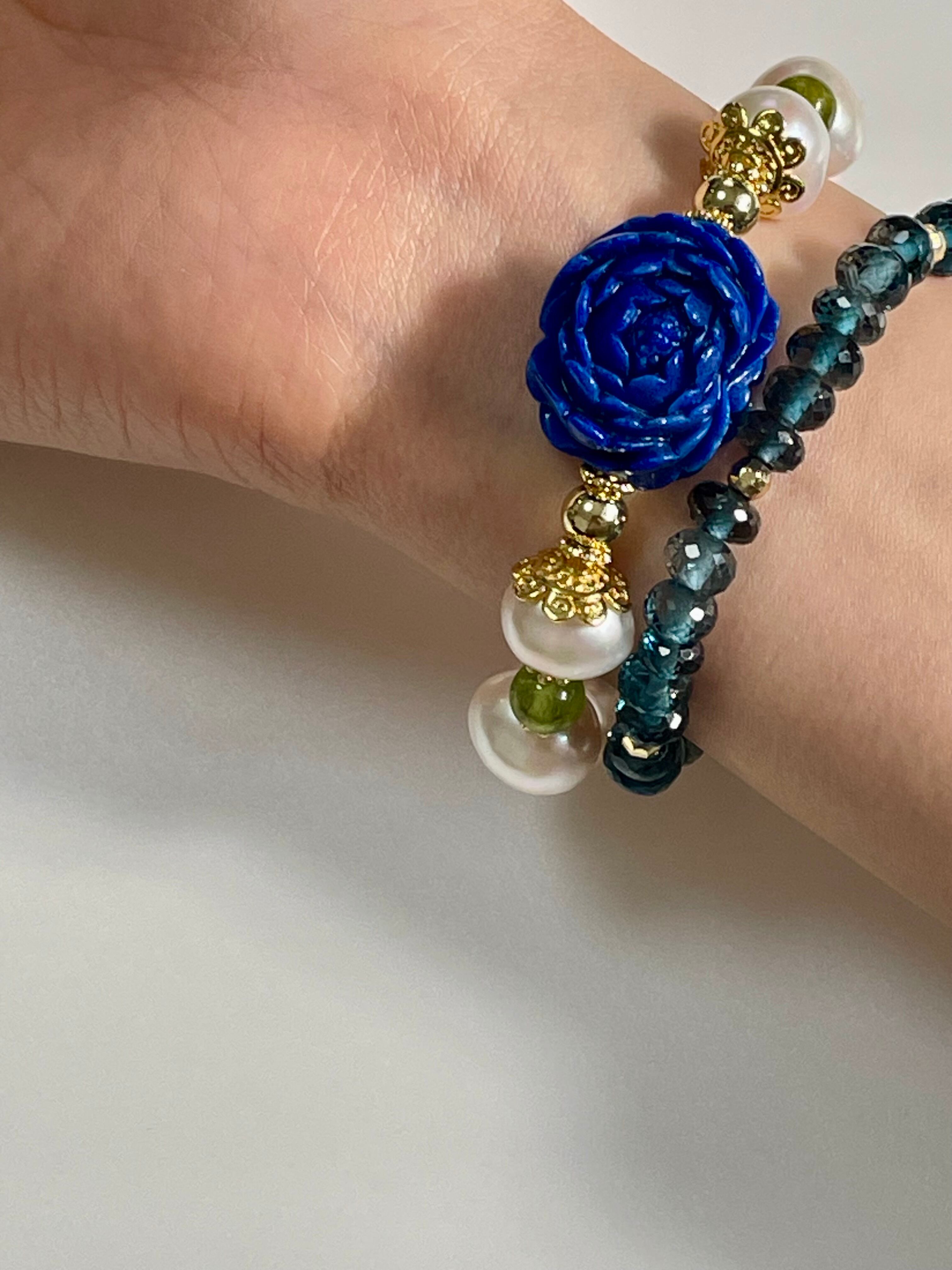 天然淡水パール ラピスラズリ薔薇 ペリドットデザインブレスレット