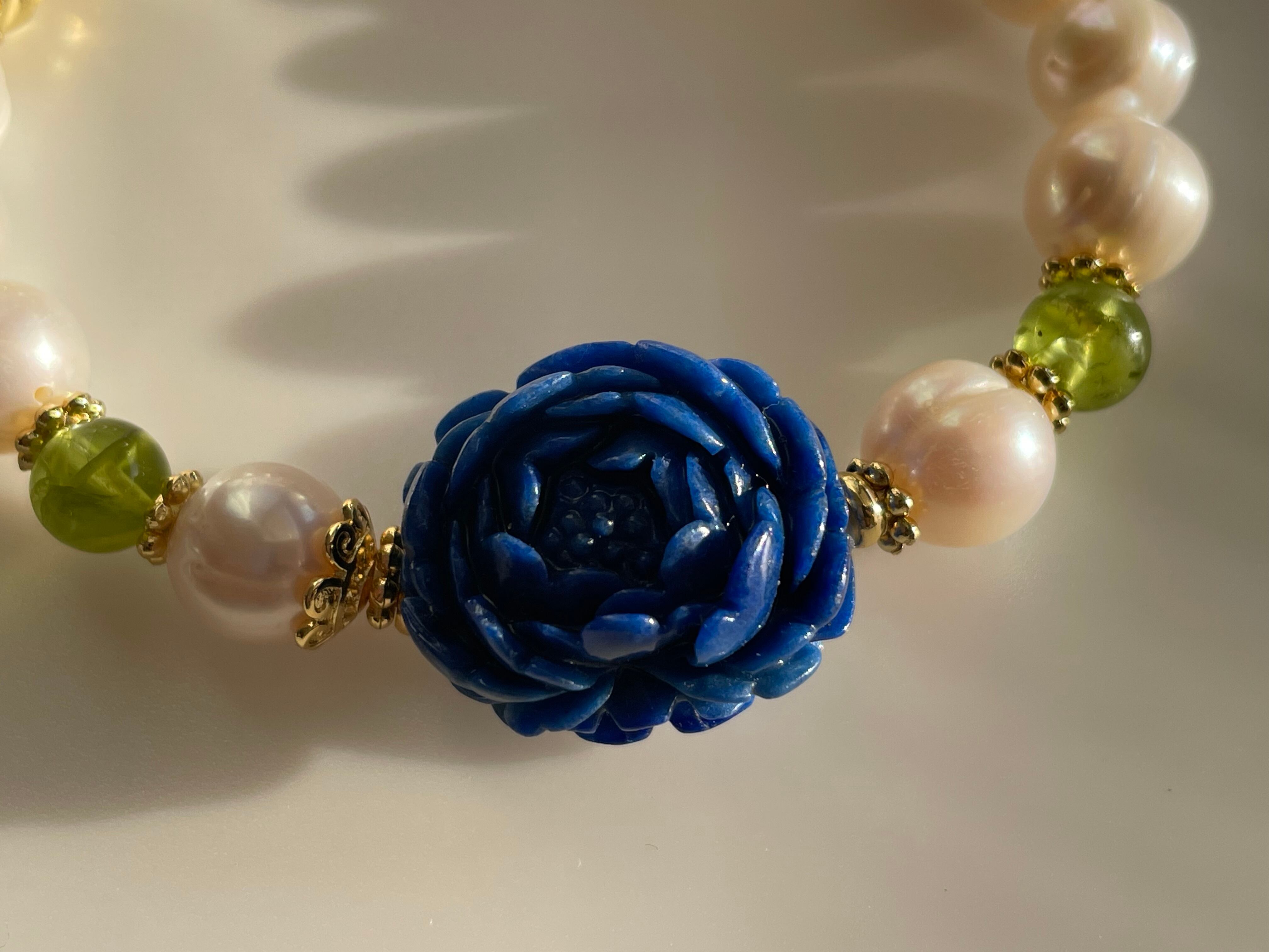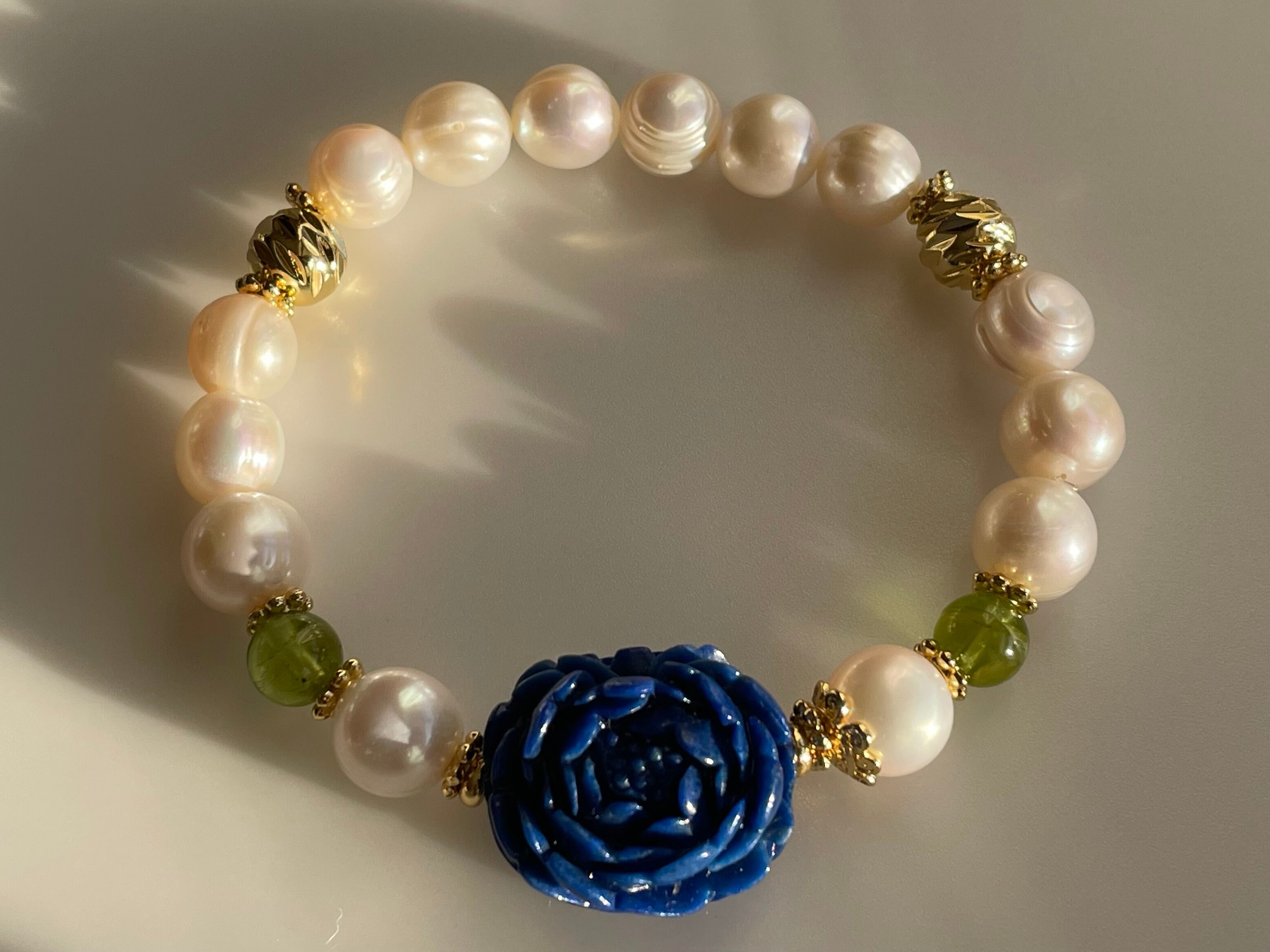 天然淡水パール ラピスラズリ薔薇 ペリドットデザインブレスレット