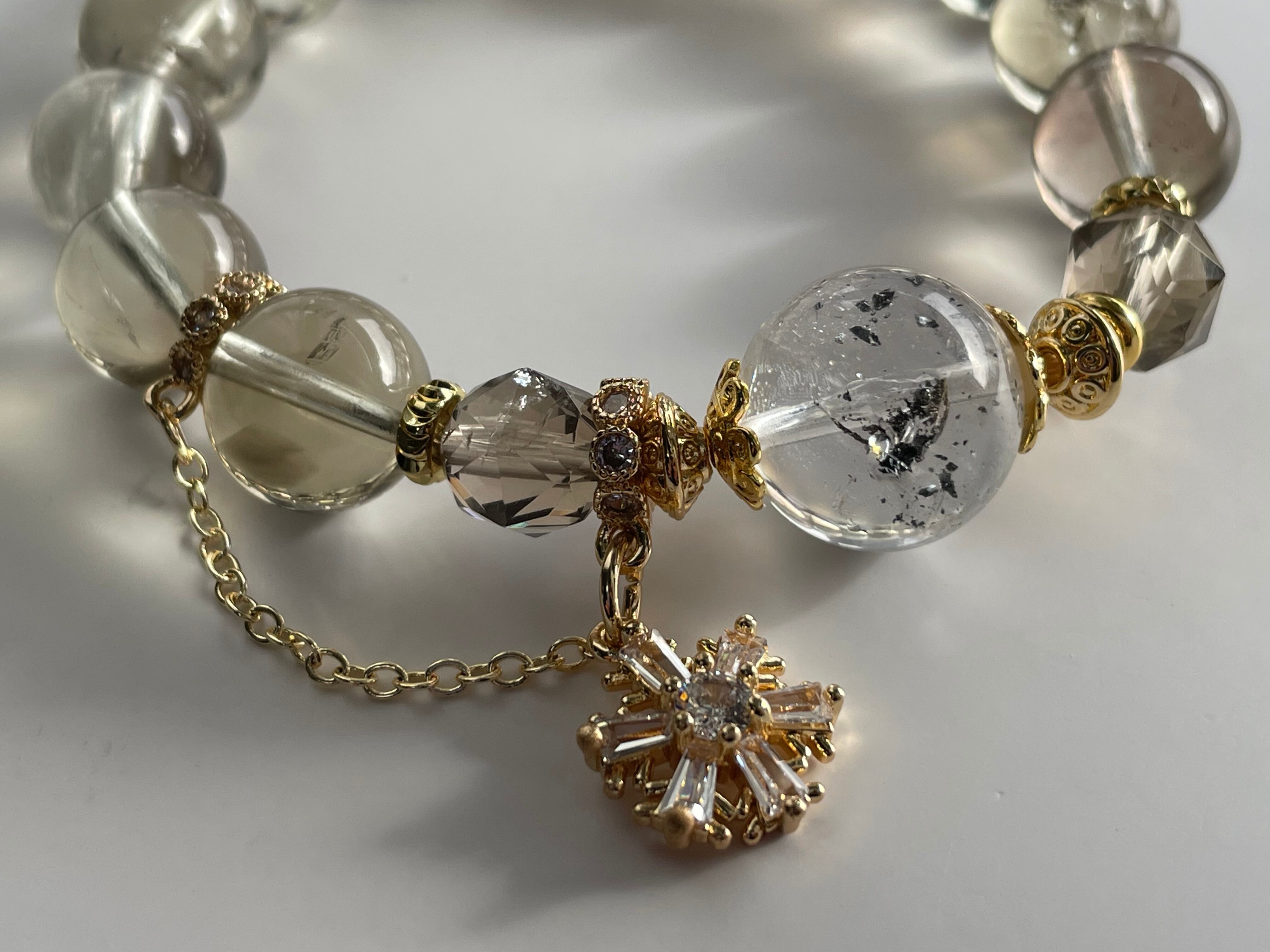 ゆっくり流砂が流れる虹入り大玉水入り水晶珠をトップにスモーキーなファントム山の見える部分や虹が見えるグリーンアメジストと組み ポイントにスモーキーカットと雪の結晶のチャームと組みました