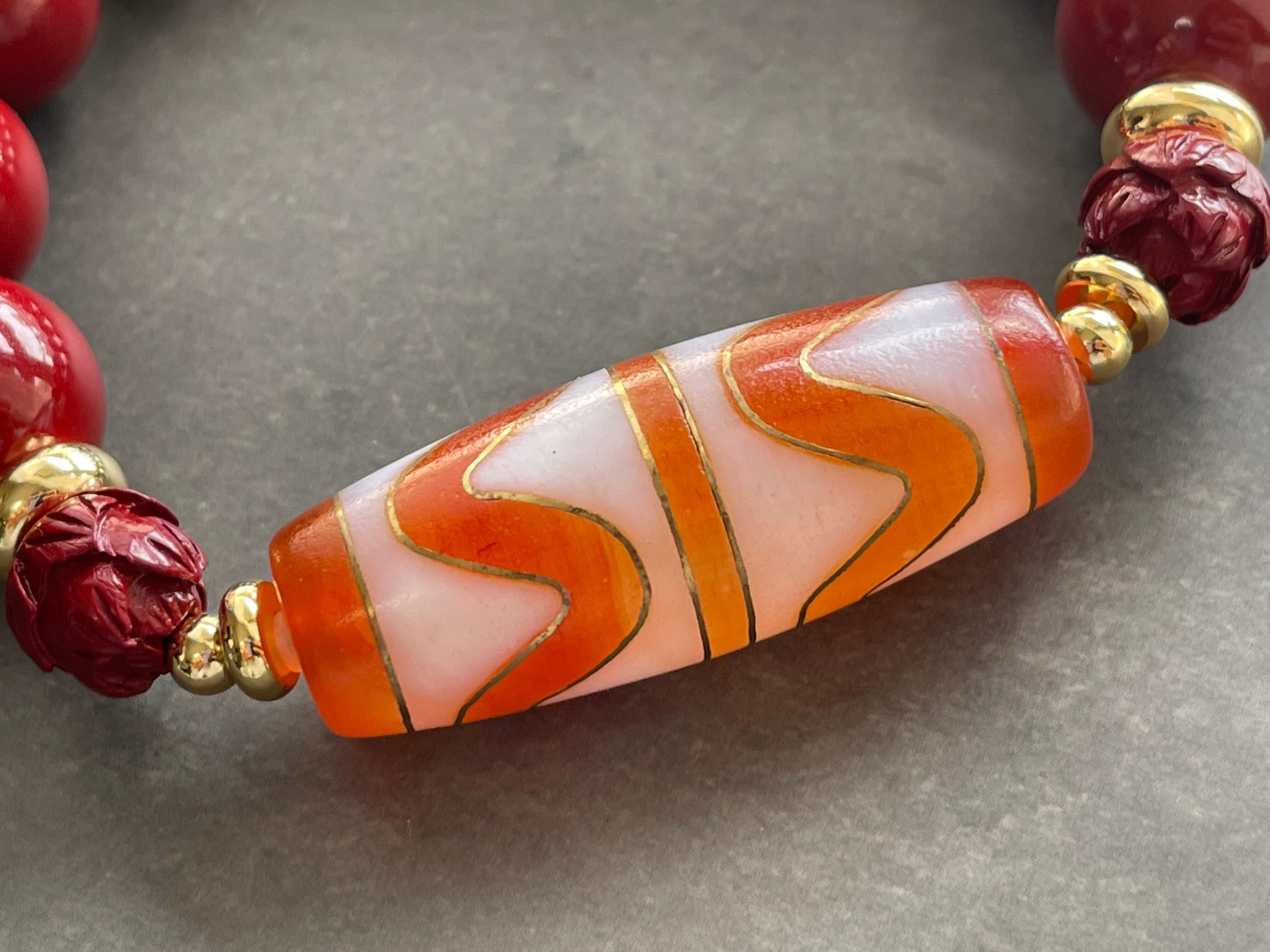 オレンジと朱色の綺麗なグラデーションに美しい金線が描かれた双虎牙天珠は虎牙天珠よりパワーが強いそうです(*^^*)
