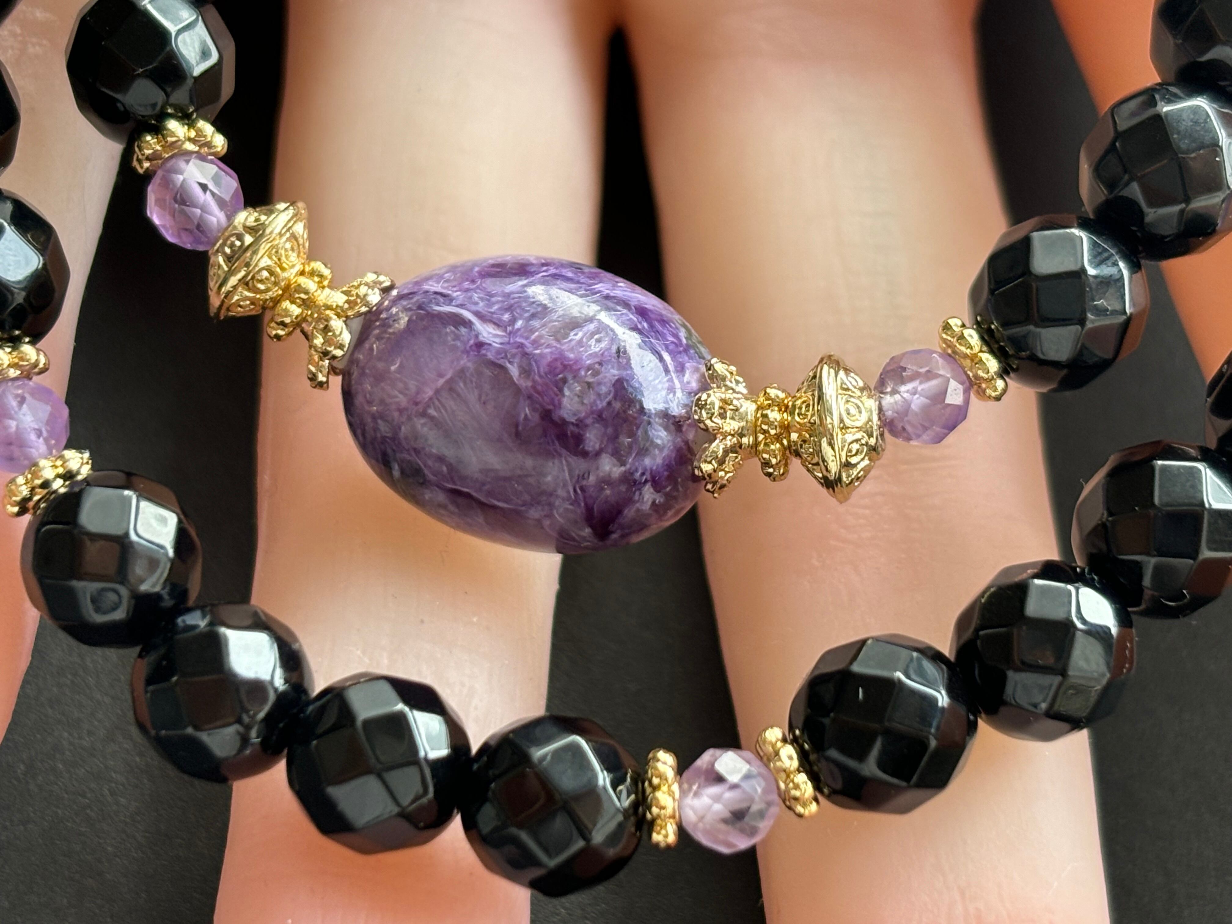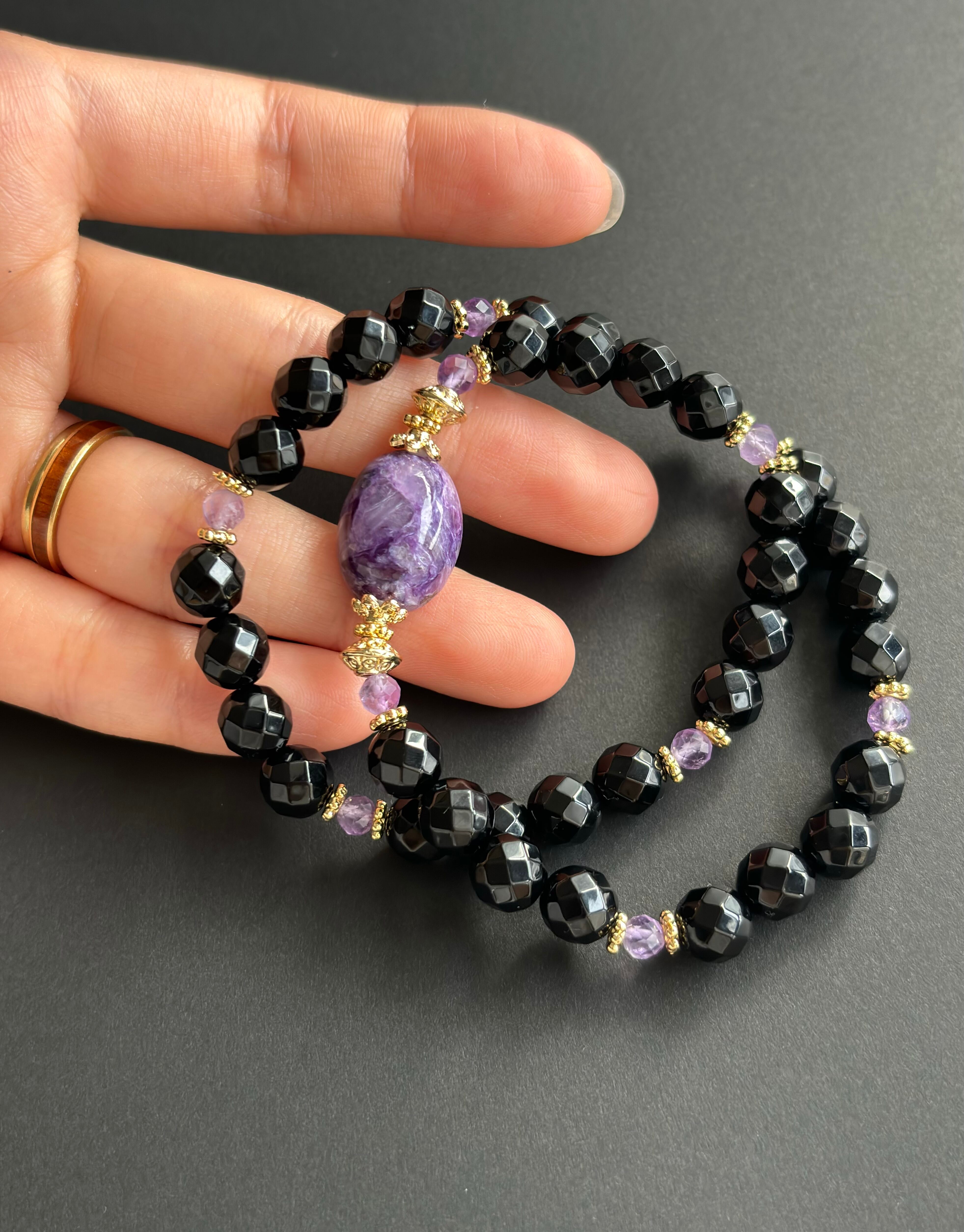 シリカ部分が見えるチャロアイトのオーバルトップに照り艶の綺麗なカットモリオンと透明感の美しいカットのラベンダーアメジストと組みました(*^^*)