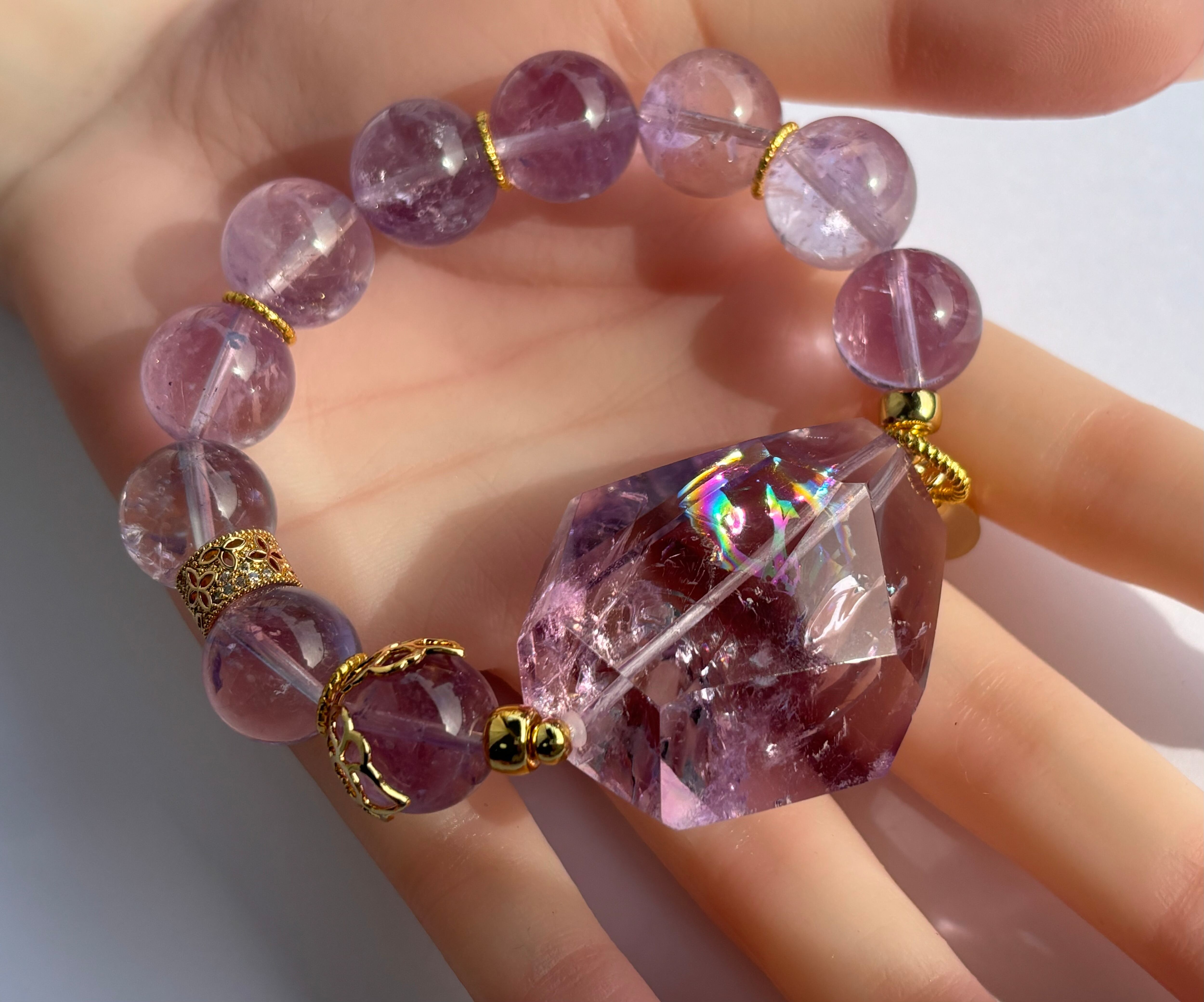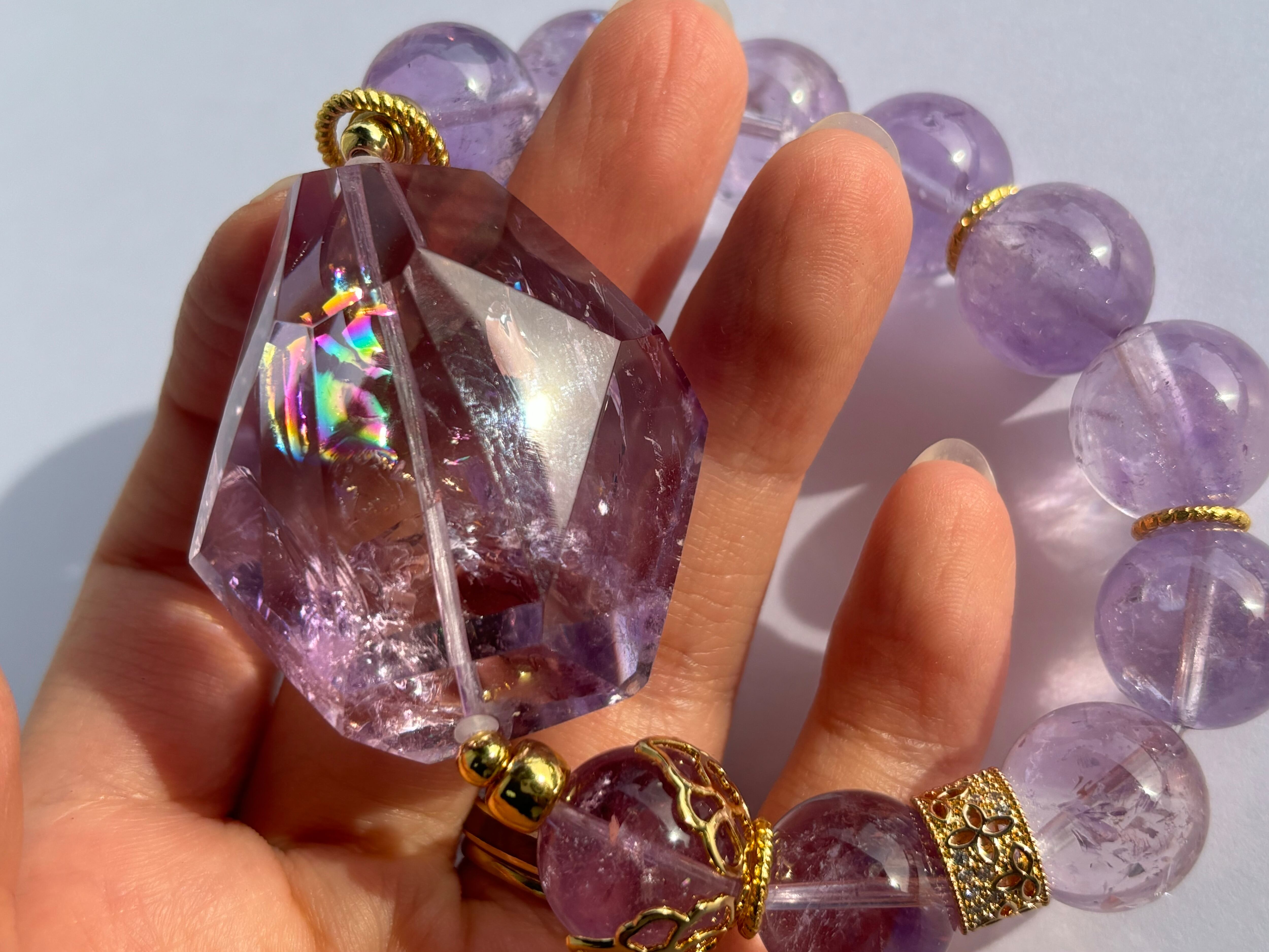 沢山のアイリス虹シラーが沢山の大振りなフリーフォームカットのアメジストのトップに高品質ピンクラベンダーのアメジストの粒と組みました!
