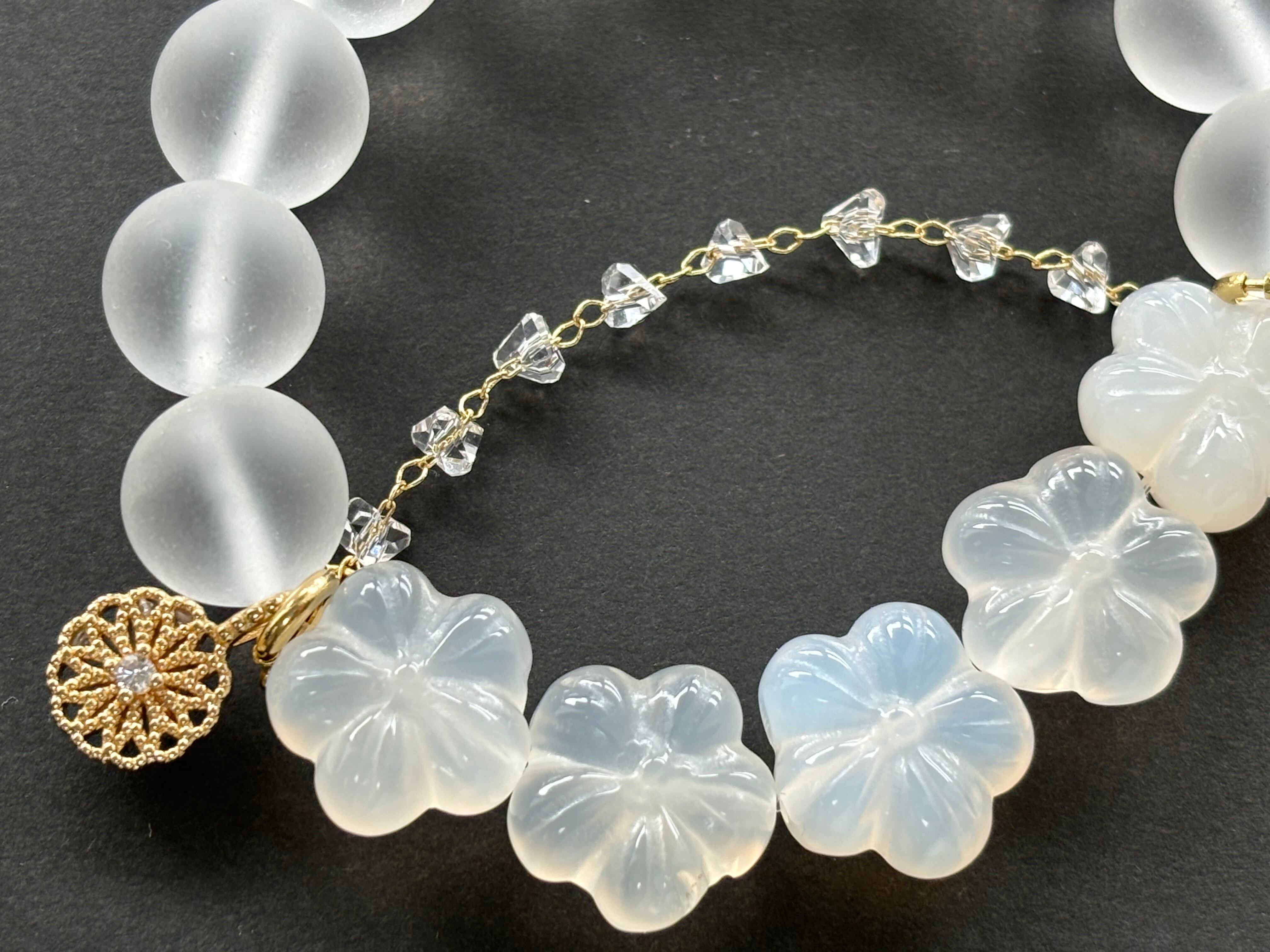 フロスト加工水晶とミルキークォーツのお花をハーフで組みました(*´∀`*)