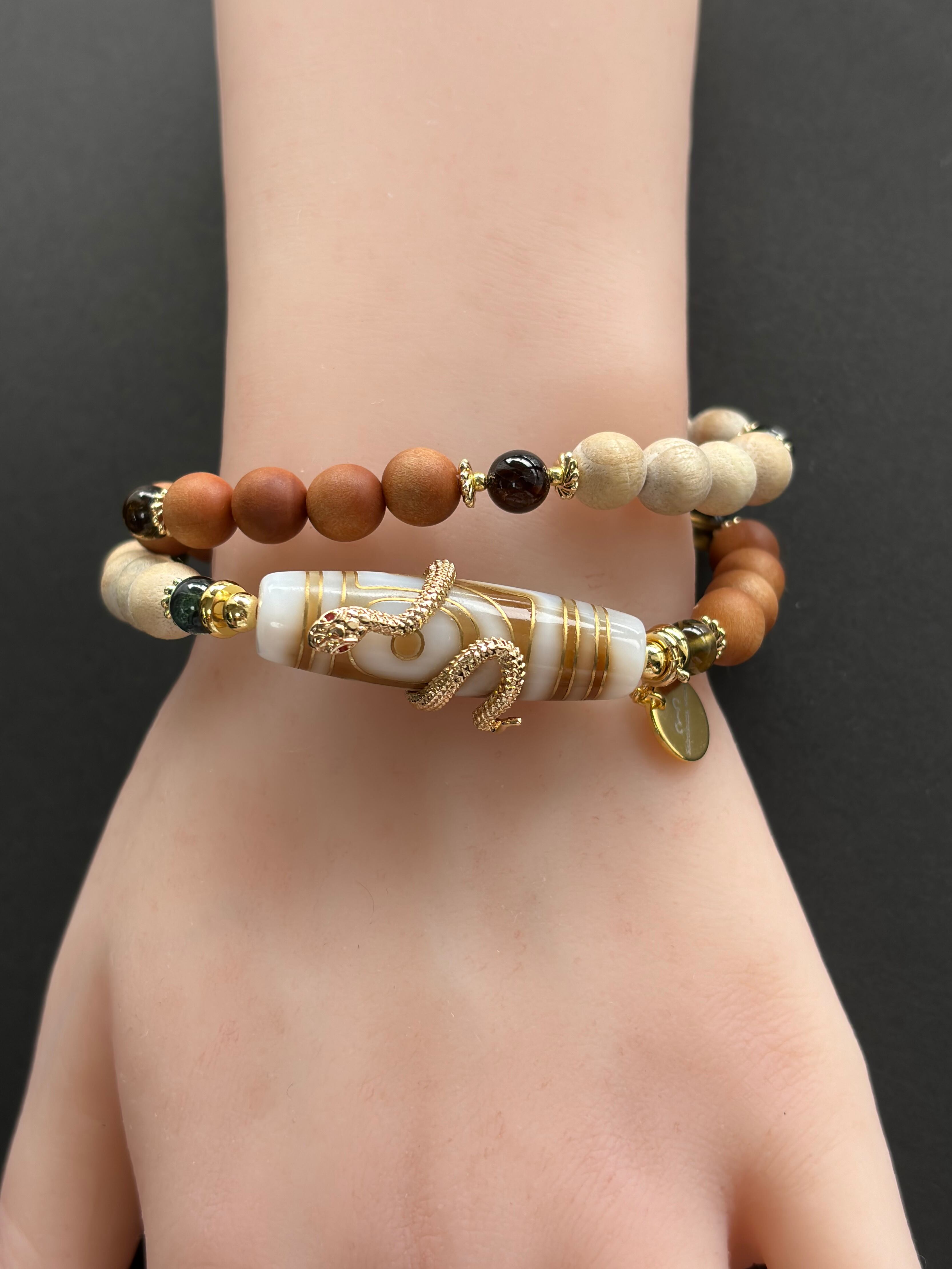 金線 二眼天珠 香木 トルマリン 2連デザインブレスレット