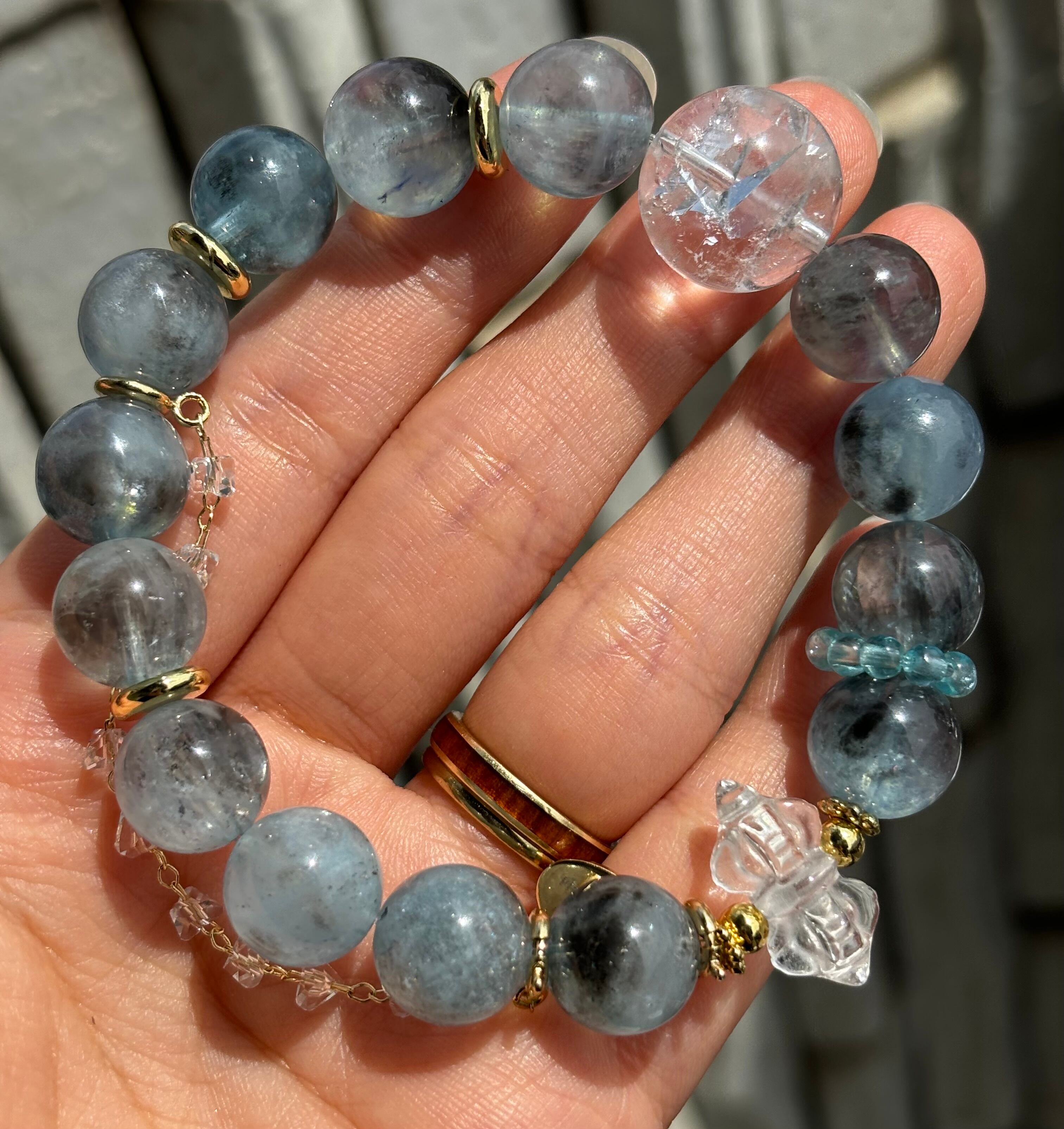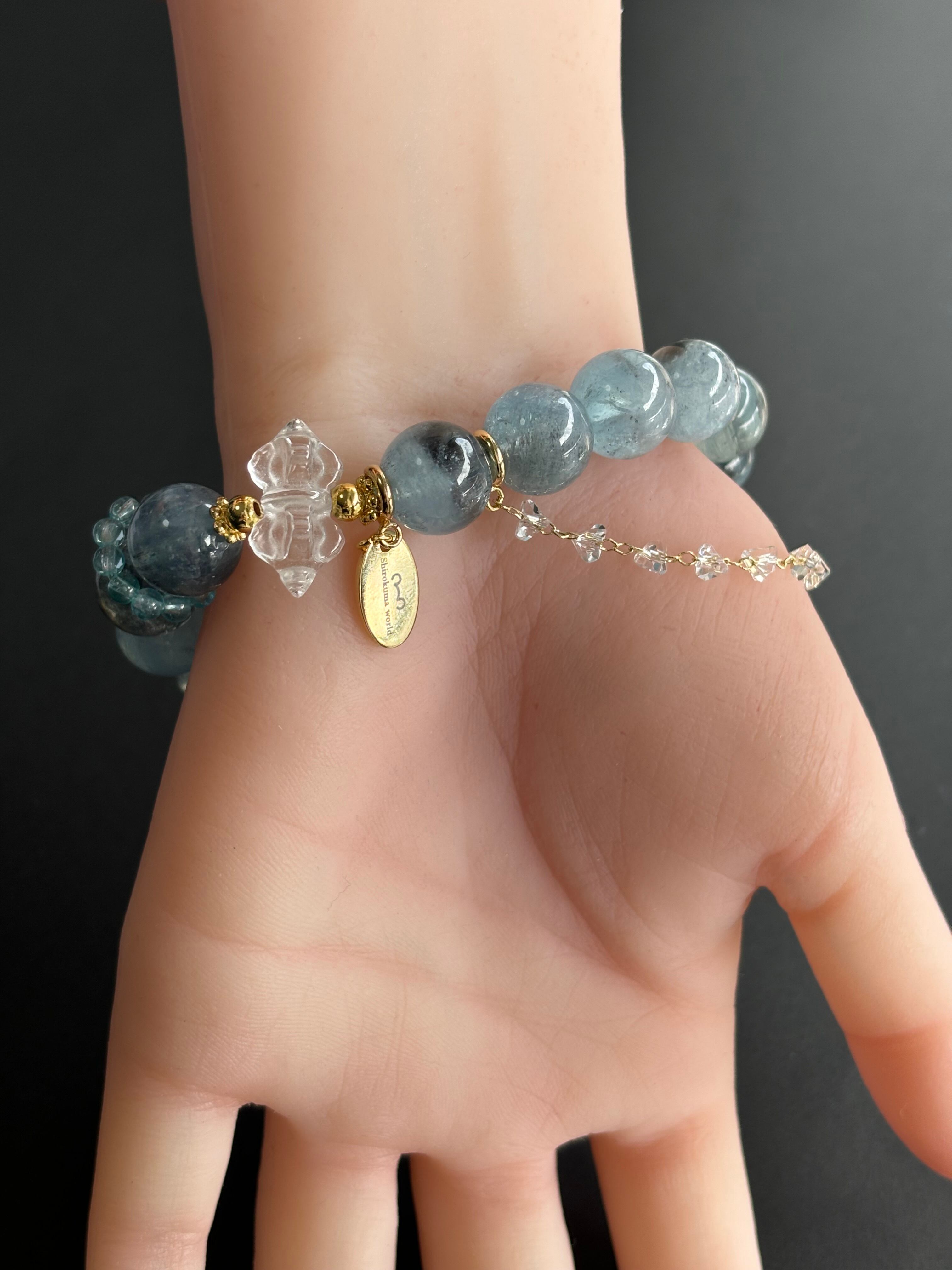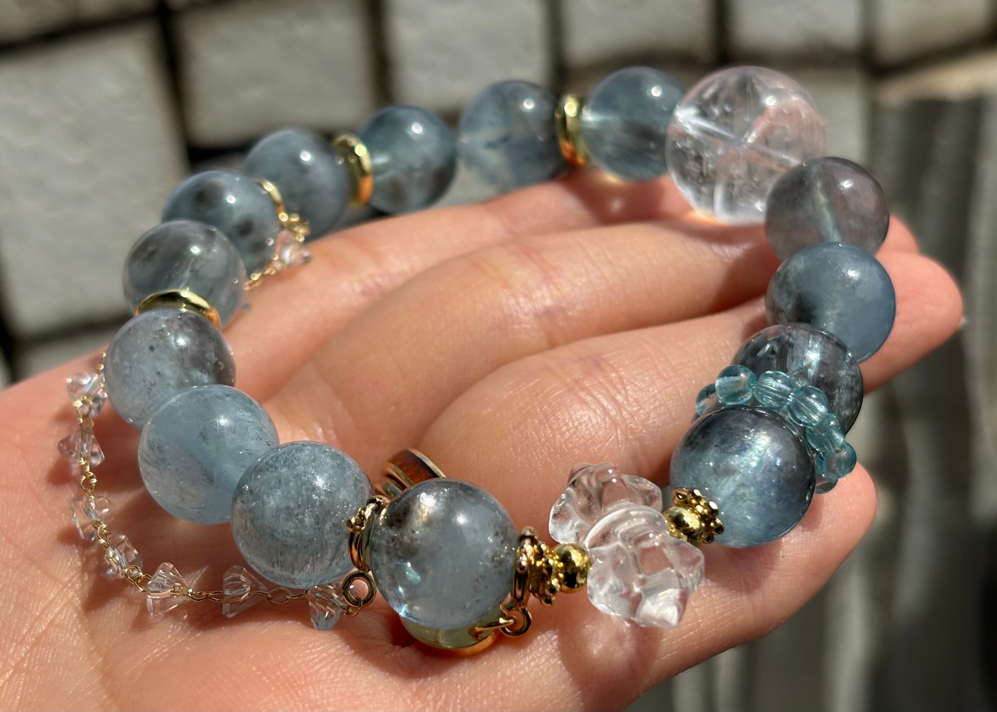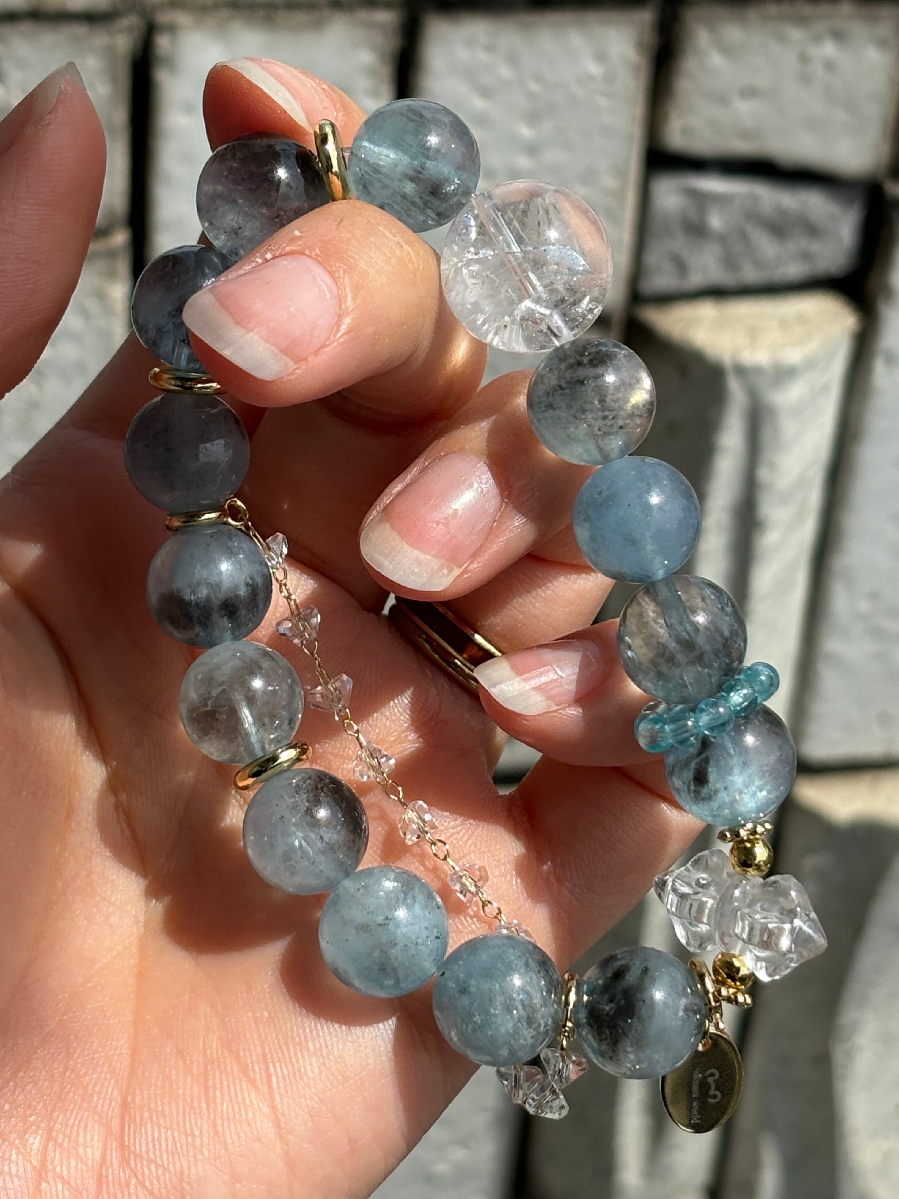 モスアクアマリン 貫入水晶クォーツインクォーツ 水晶 バジュラ スカイブルーアパタイト デザインブレスレット