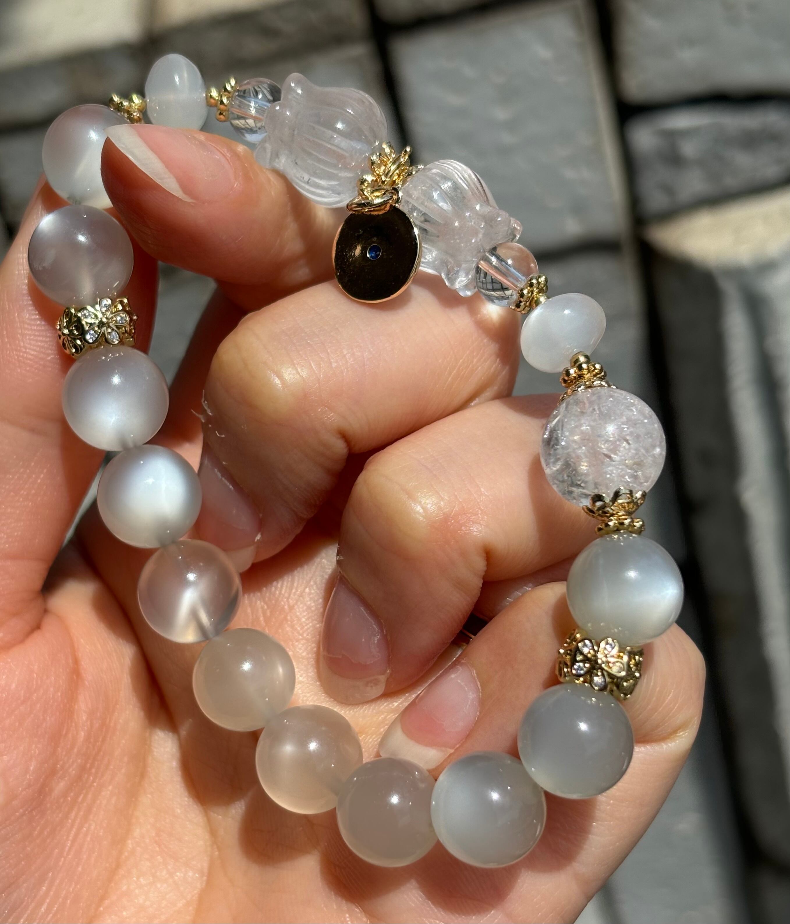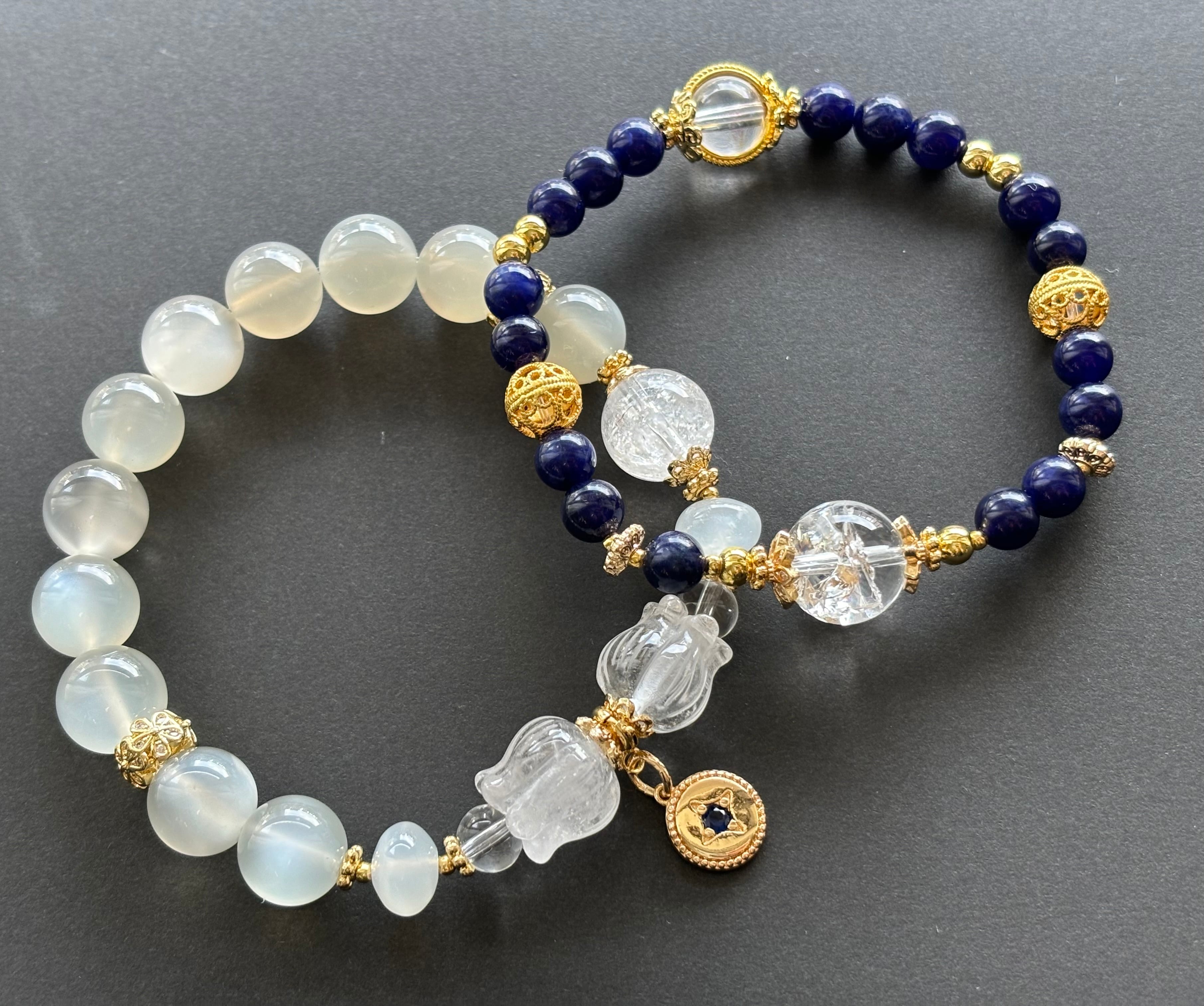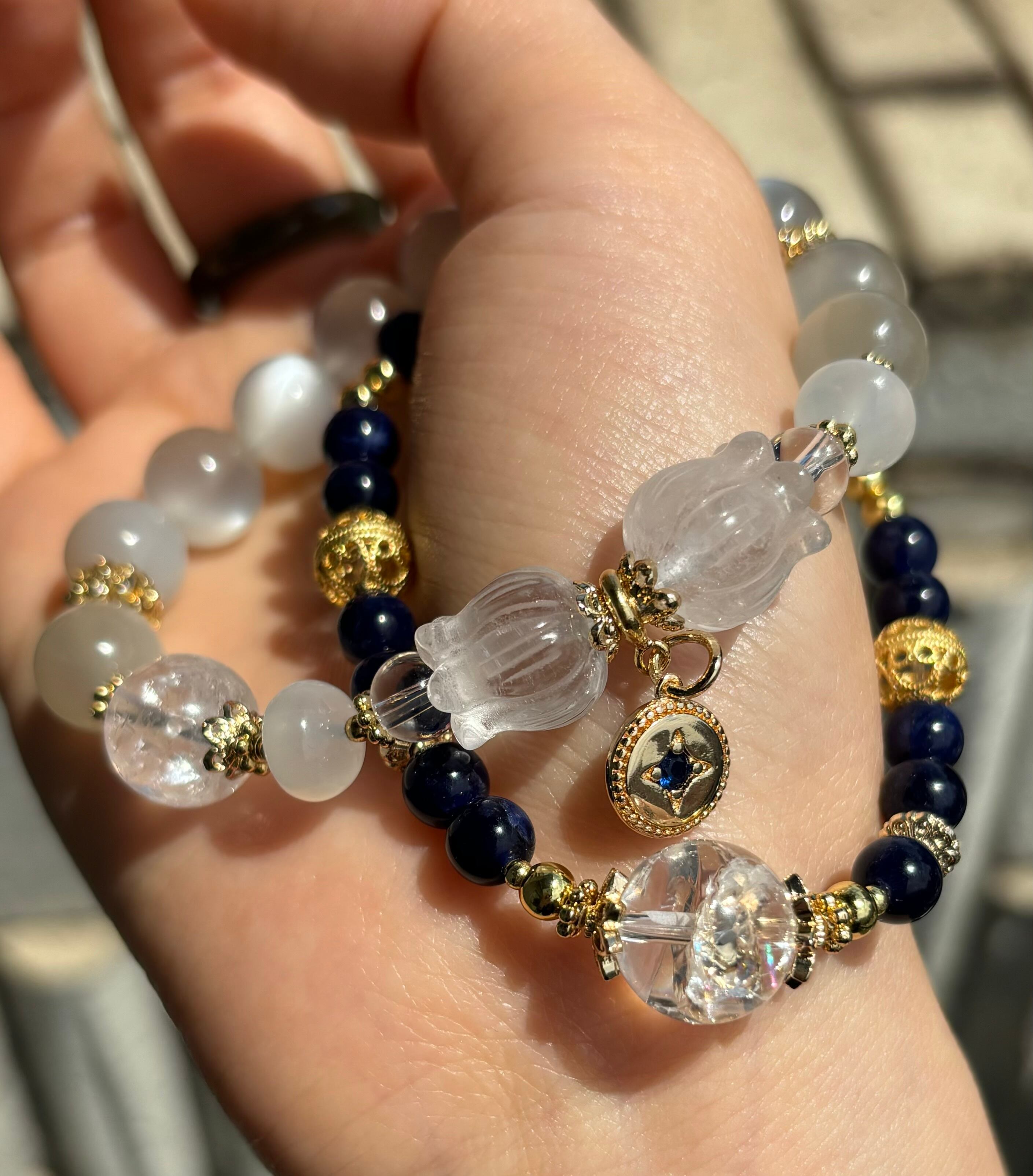 水晶鈴蘭をトップにしたシラーの綺麗なムーンストーンのブレスレットとキラキラ虹の綺麗なアイリスクォーツがトップのソーダライトとオーラライトの重ね付け2連ブレスレットです