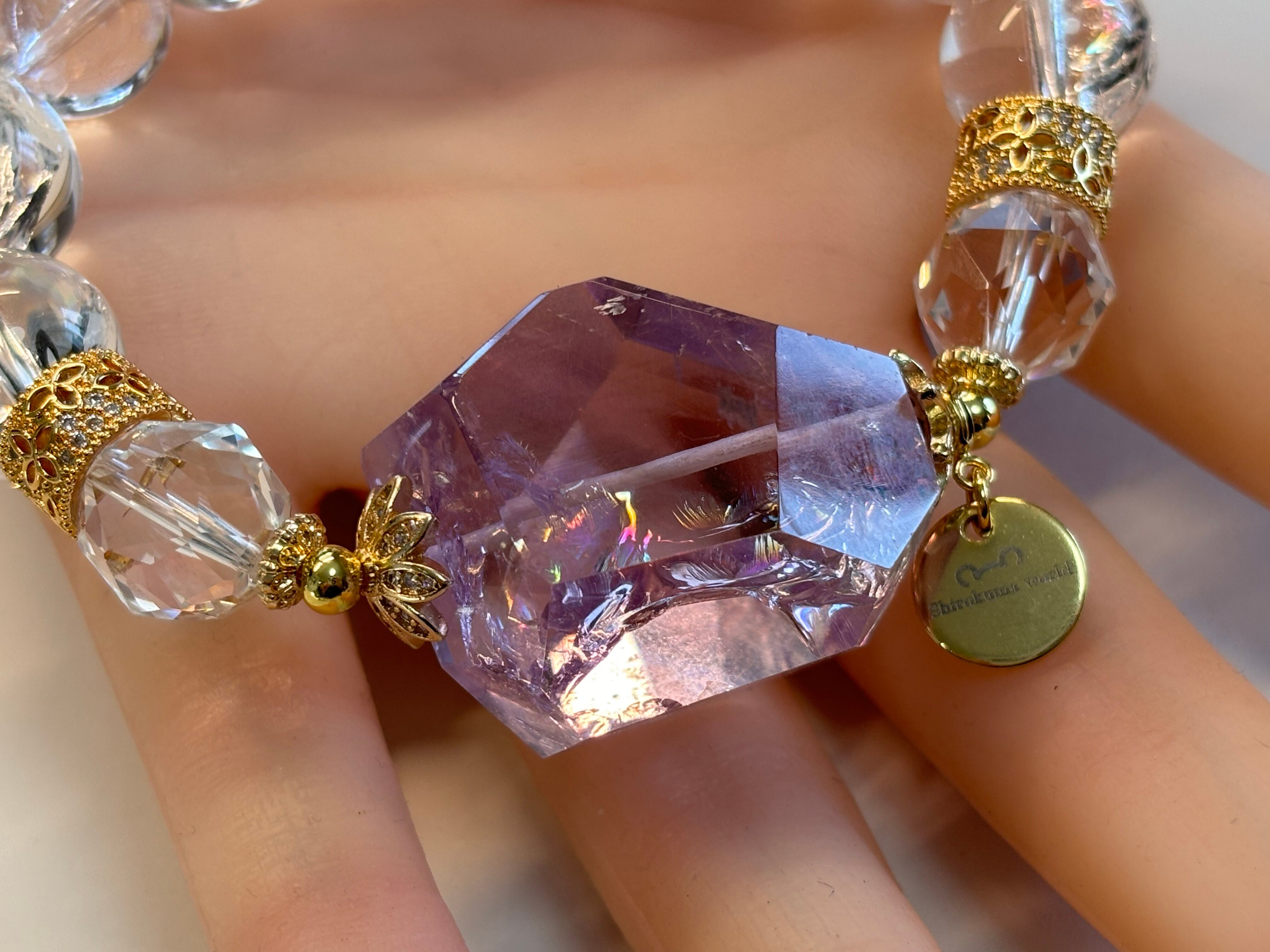 キラキラアイリスアメジストのラフカットのトップとアイリスクォーツとポイントでカット水晶と組みました