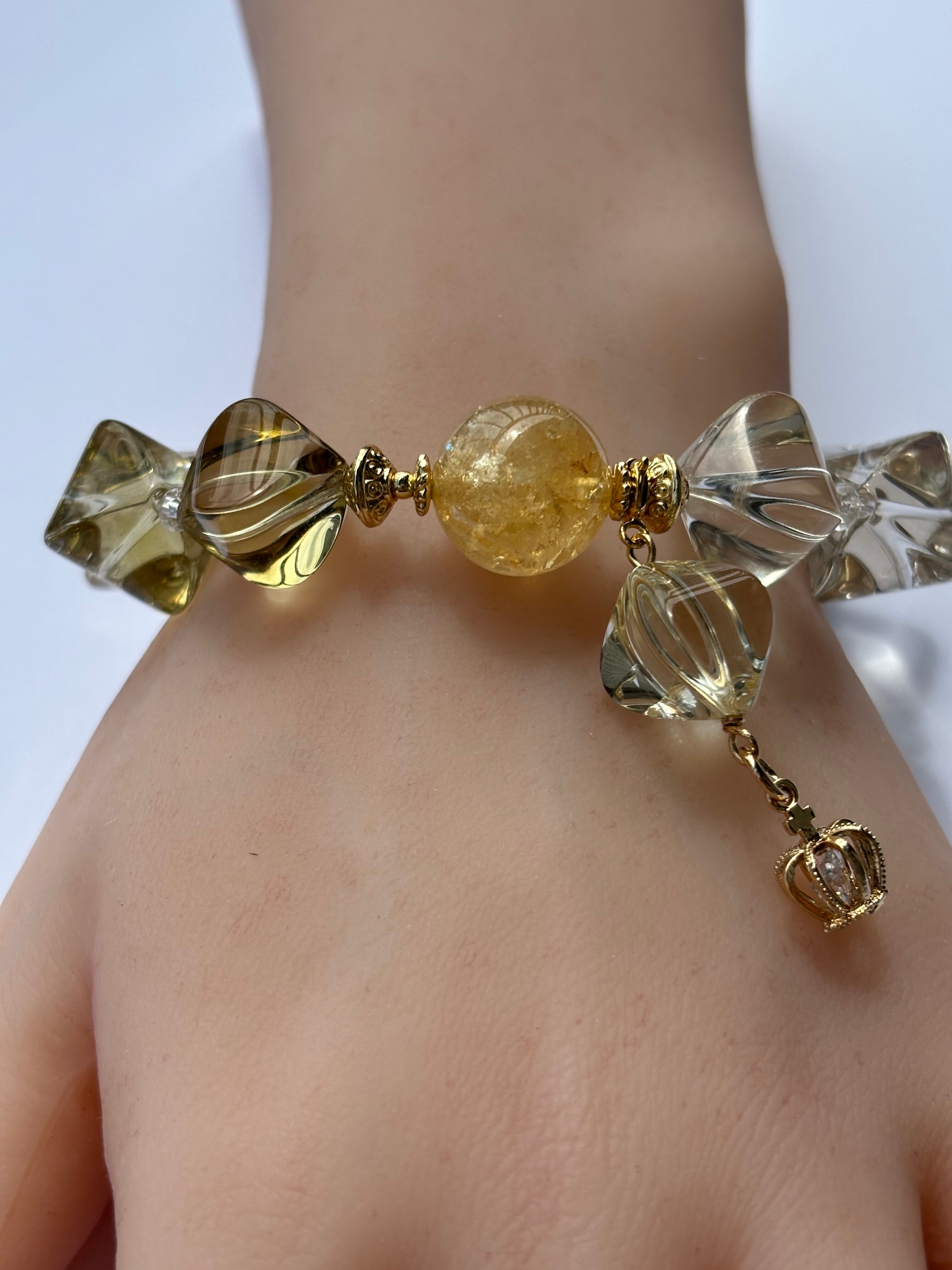 宝石品質カットの非加熱シトリンと天然アイリス虹入り非加熱シトリンビーズのデザインブレスレットです。