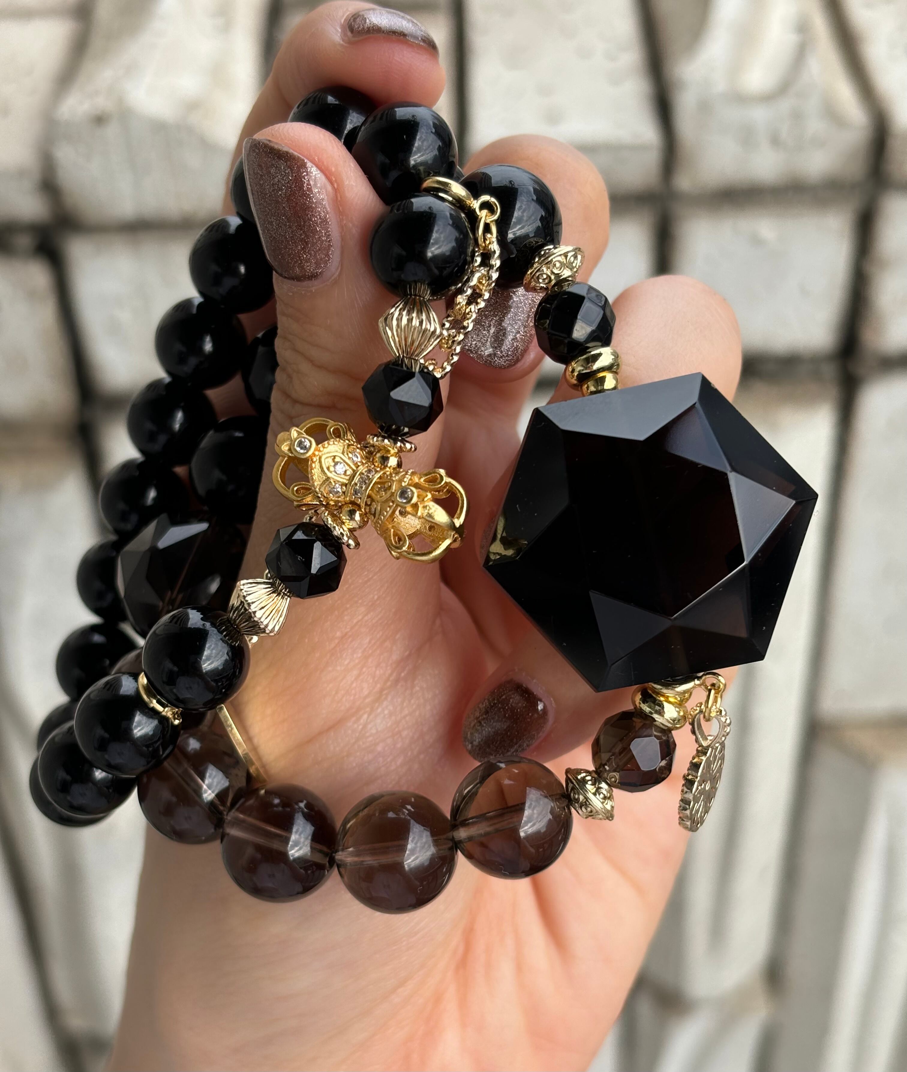 スモーキークォーツ×モリオンアシメントリー バジュラ×モリオン 2連セットデザインブレスレット