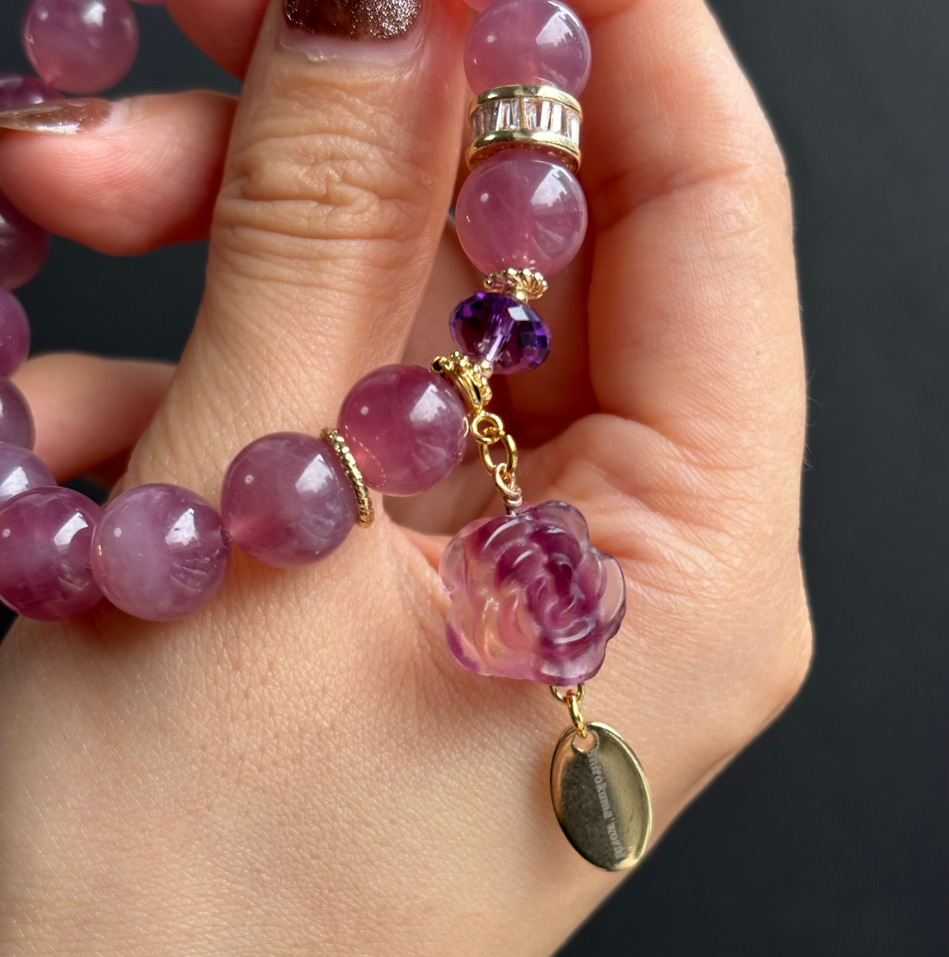 ディープピンクのとっても綺麗なマダガスカル産地のローズクォーツでライトに照らすと6条スターが見えるローズクォーツに宝石品質のアメジストとバイカラーのフローライトの薔薇チャームをポイントに組みました(*´∀`*)