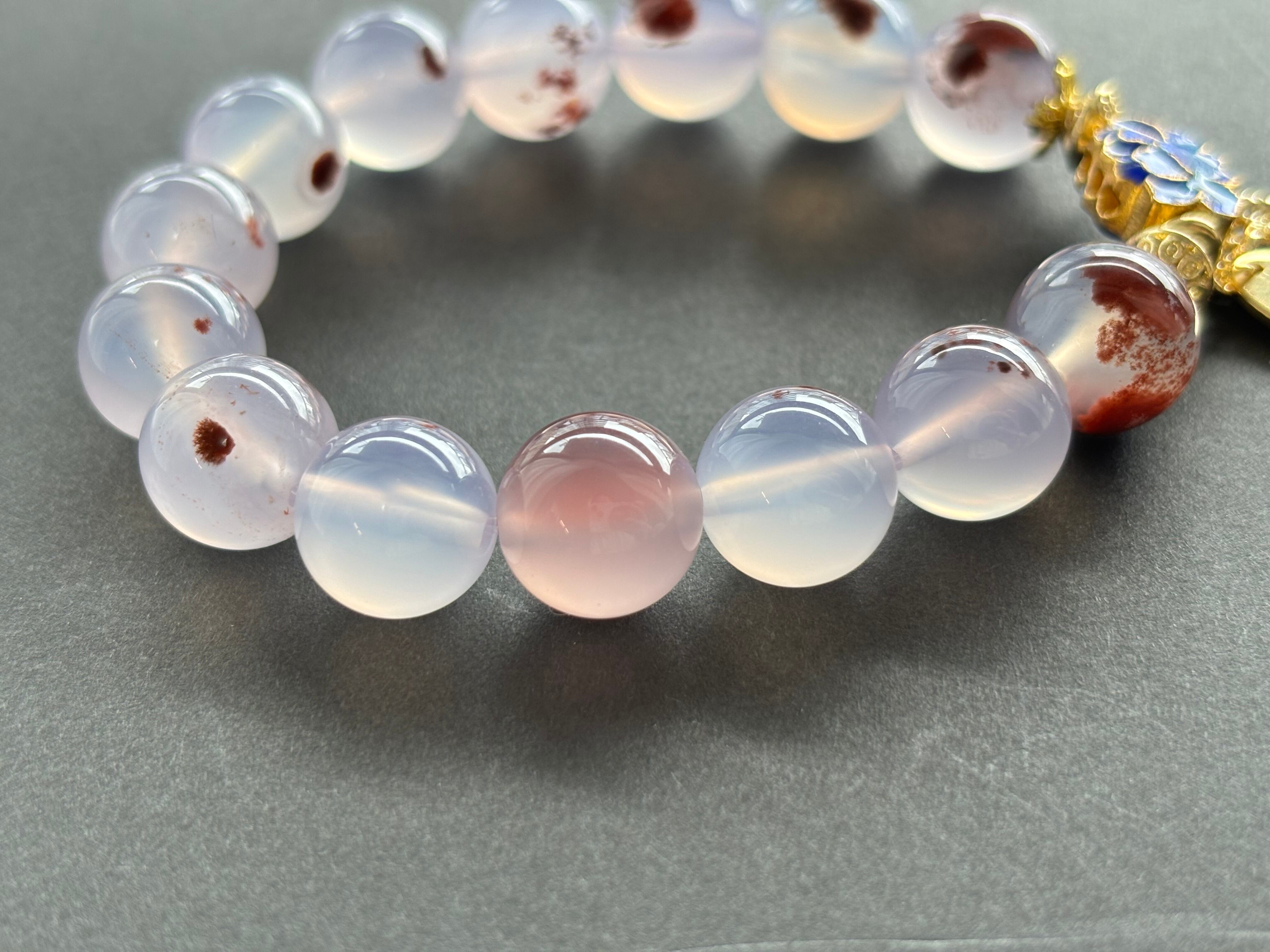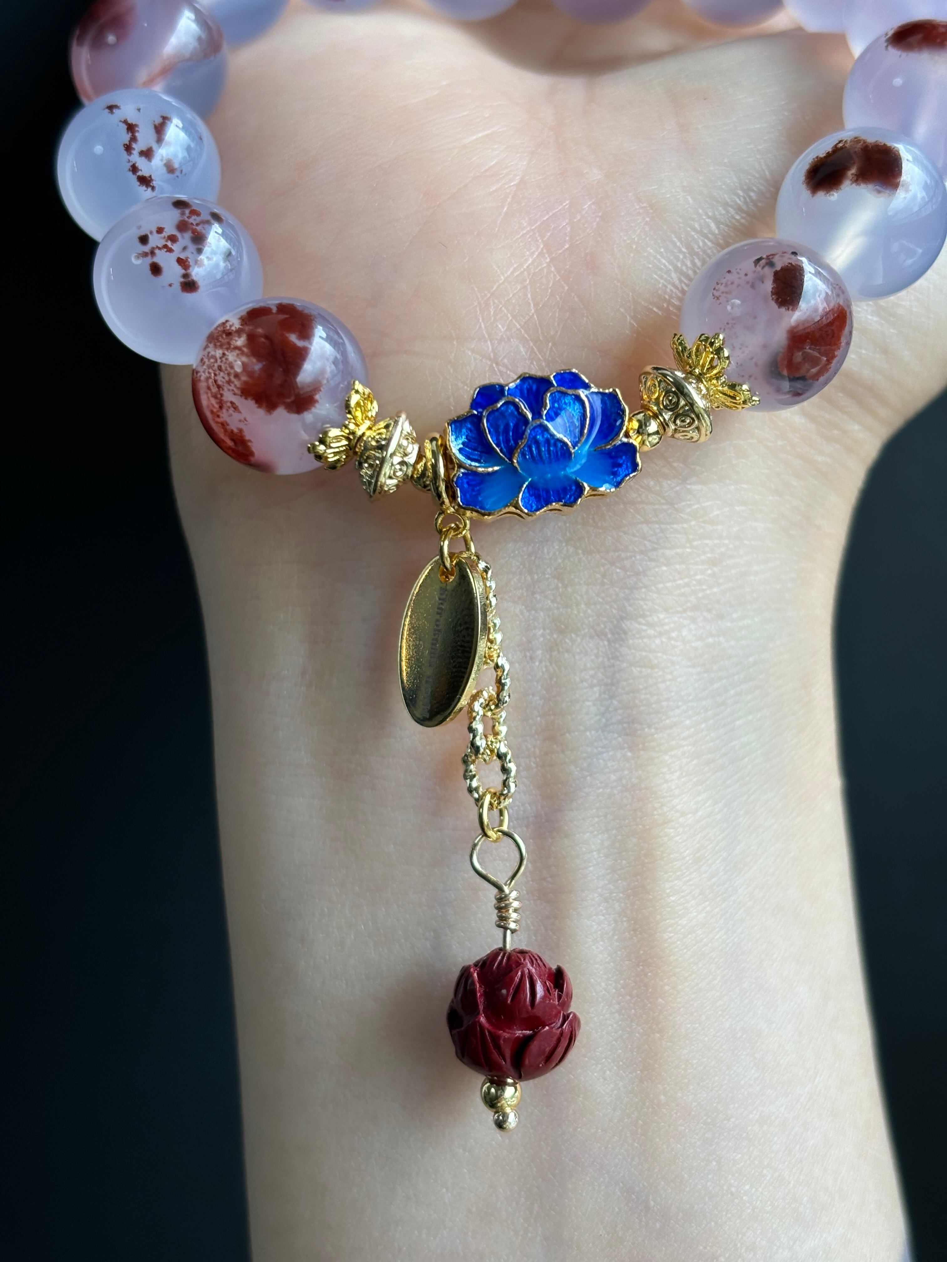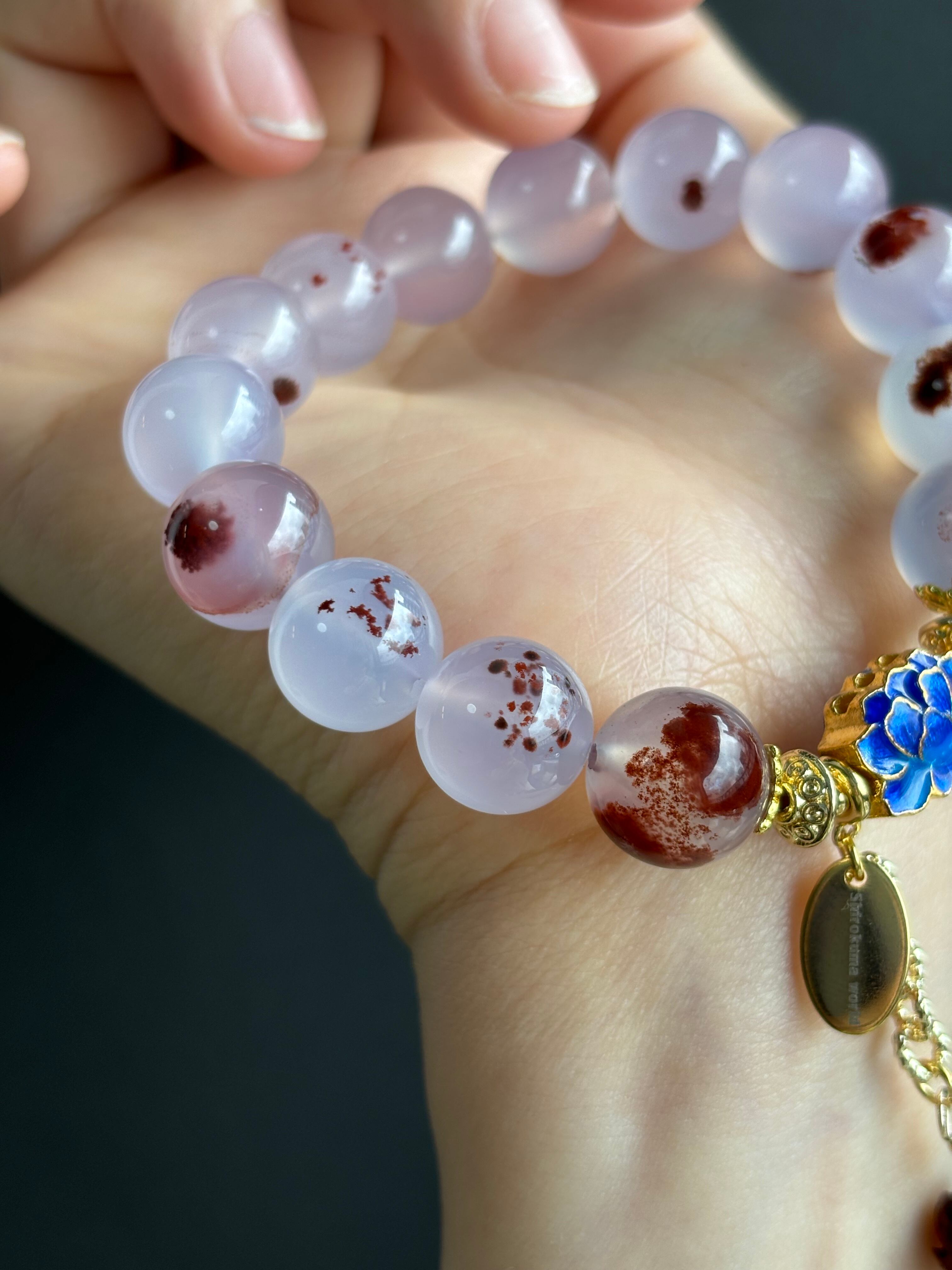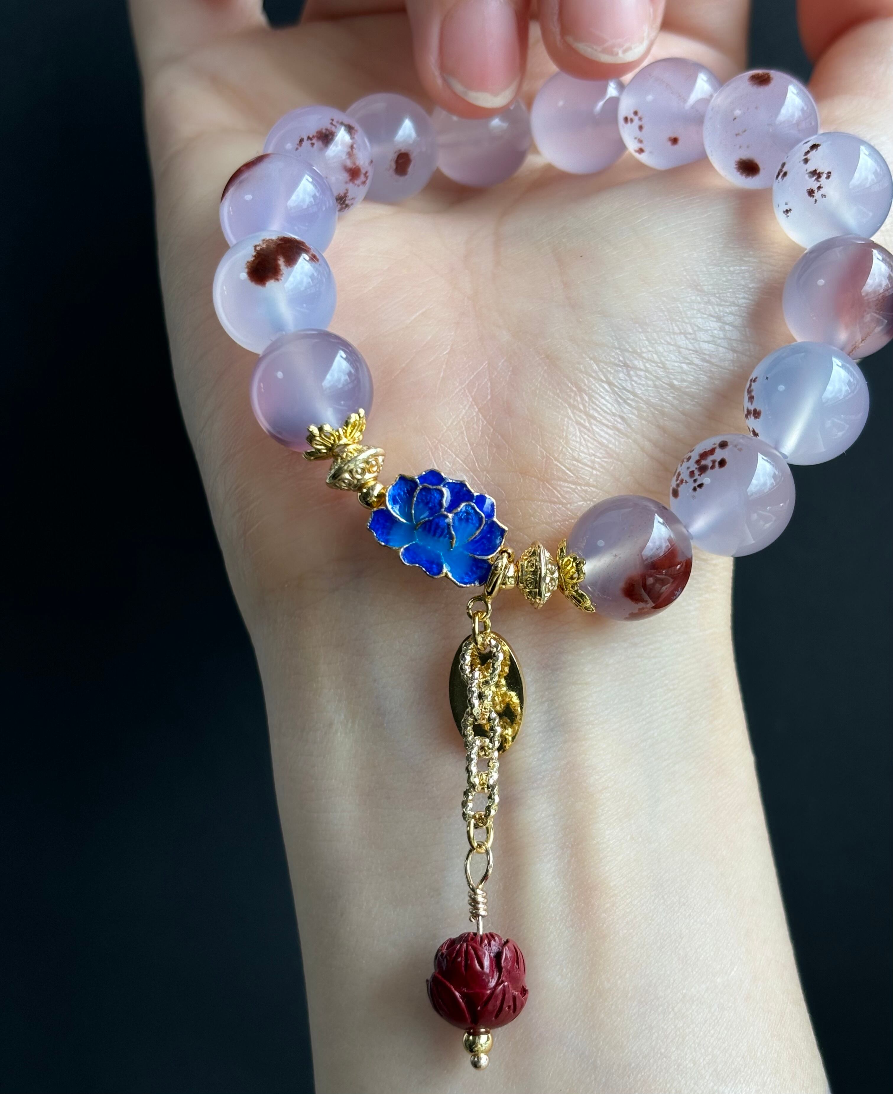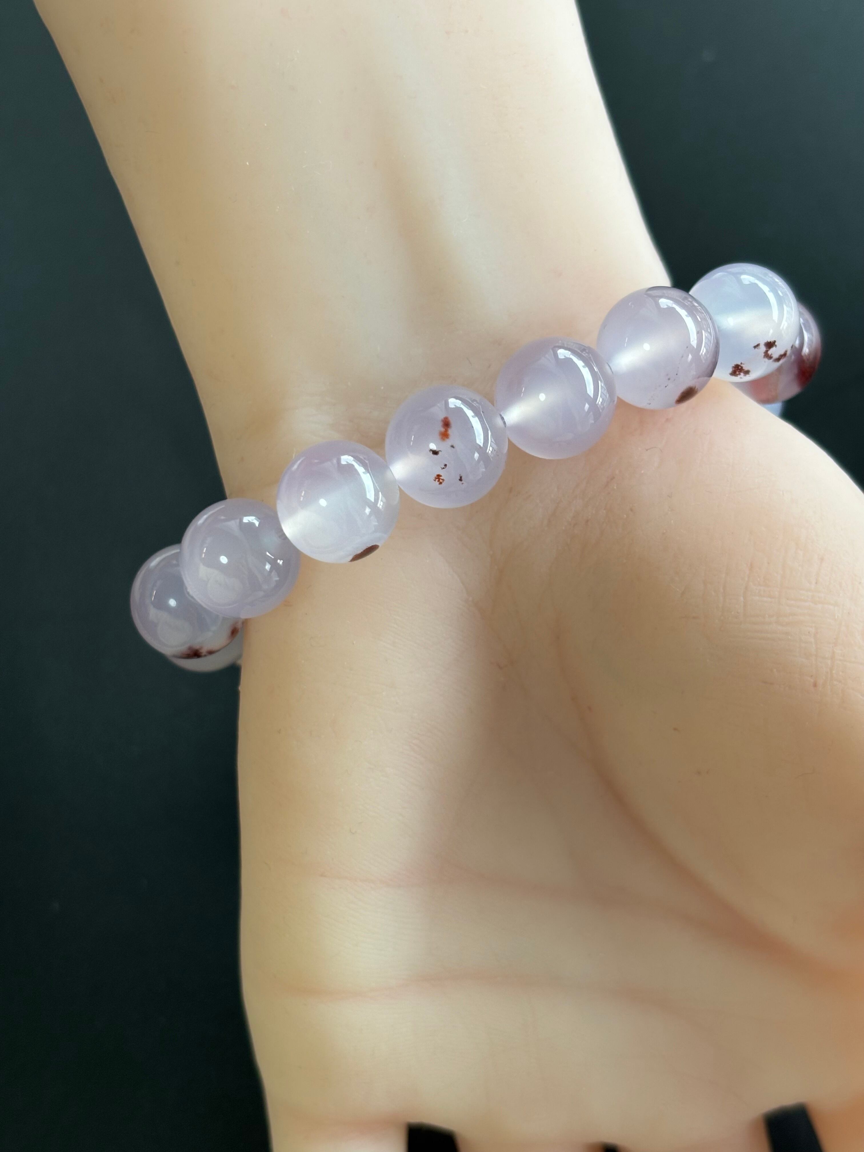 透明感の美しいぷるぷるなピンクパープルカルセドニーに花びらのようにシナバーが内包された希少で綺麗なブレスレットです(*^^*)
