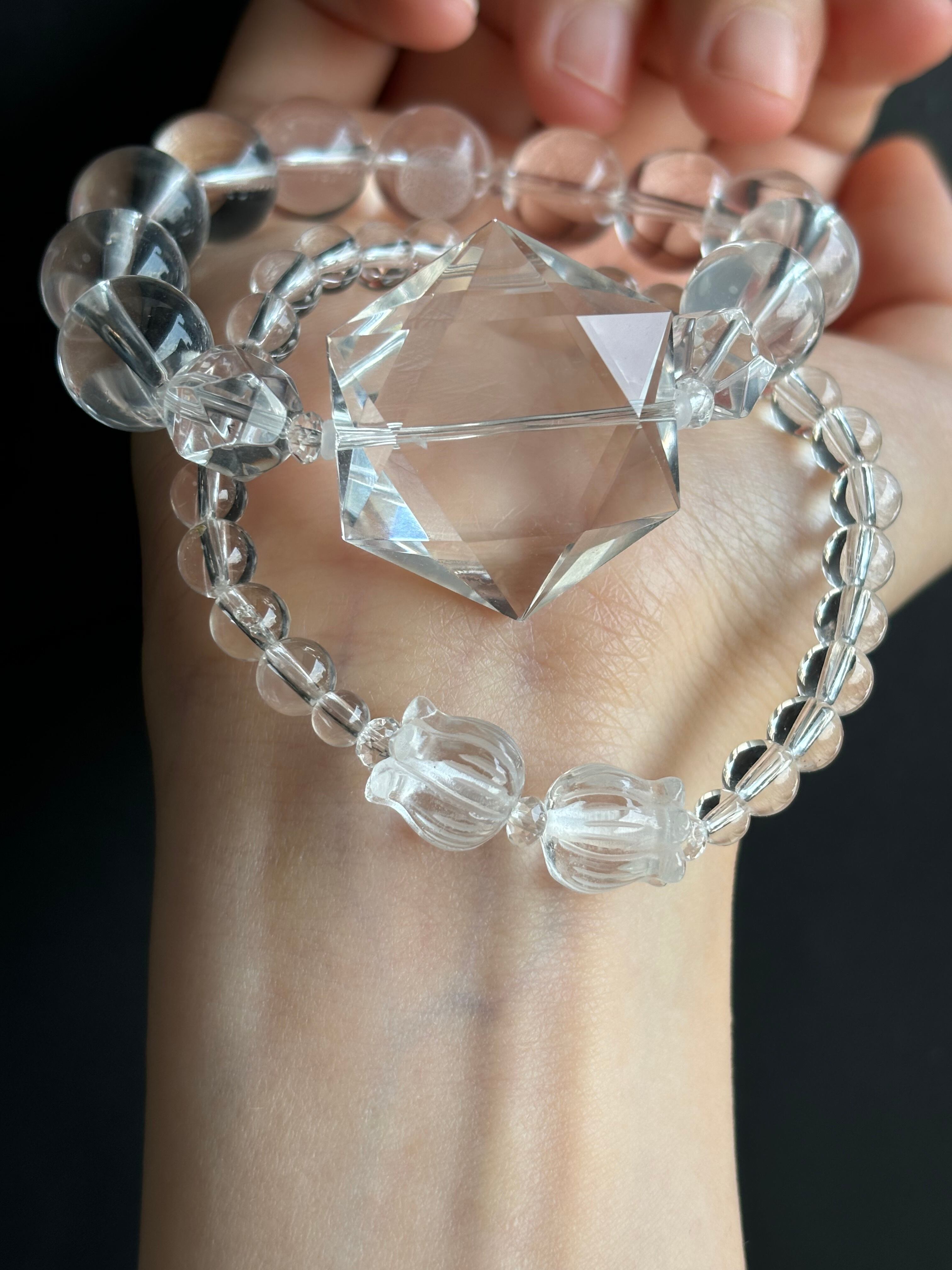 六芒星やフラワーオブライフ、鈴蘭のカット水晶も使いお守りブレスレットにも素敵です
