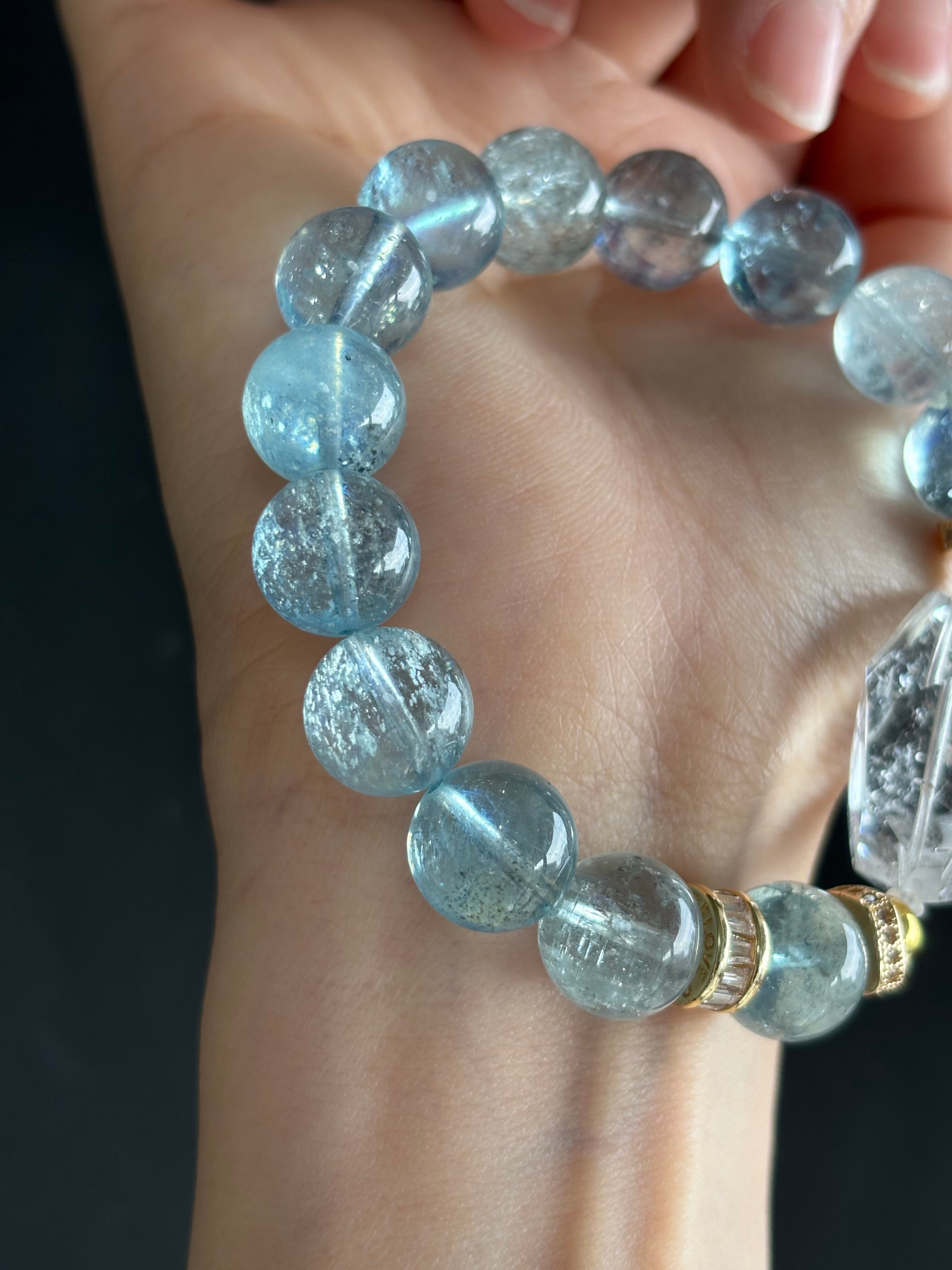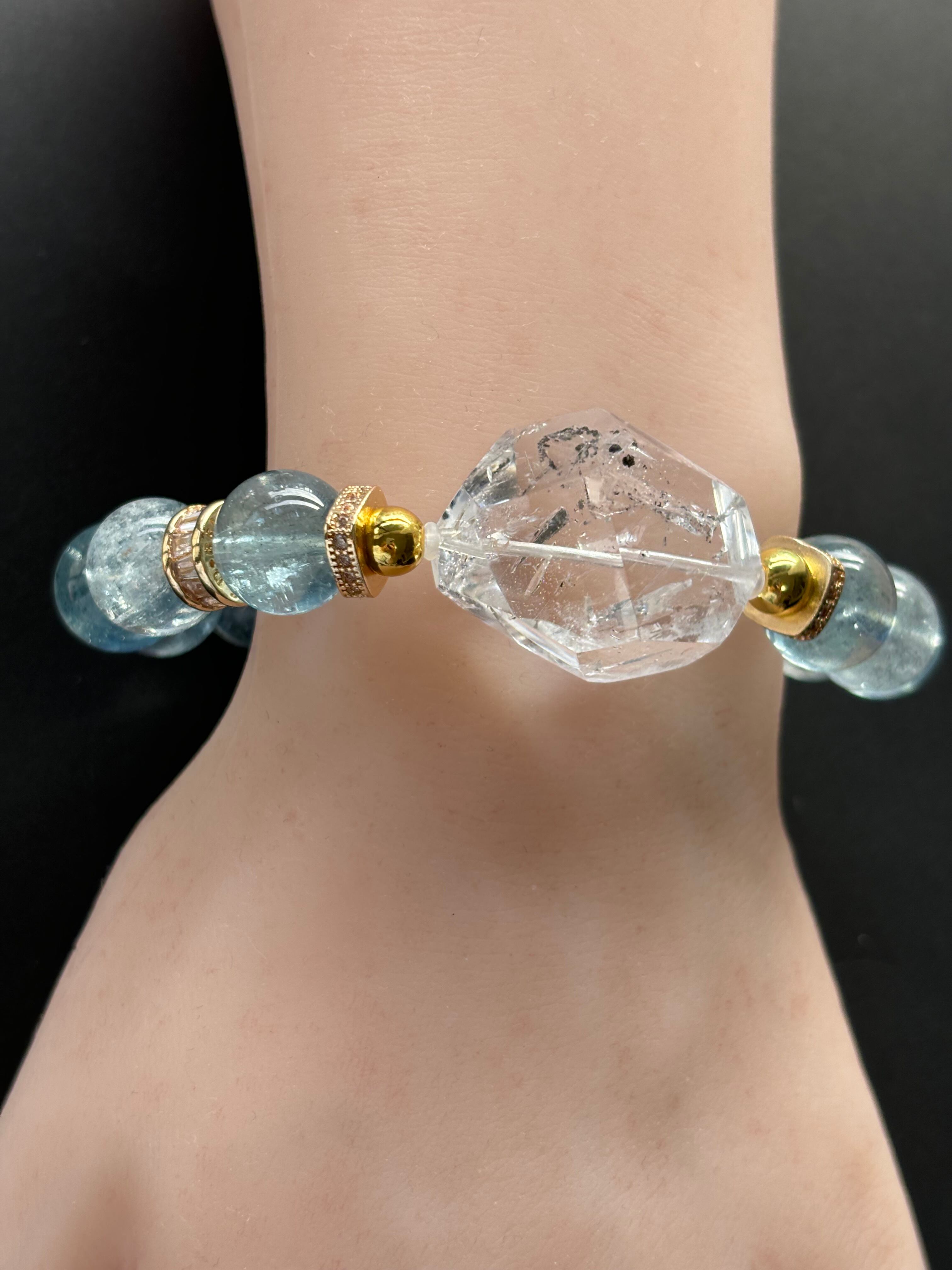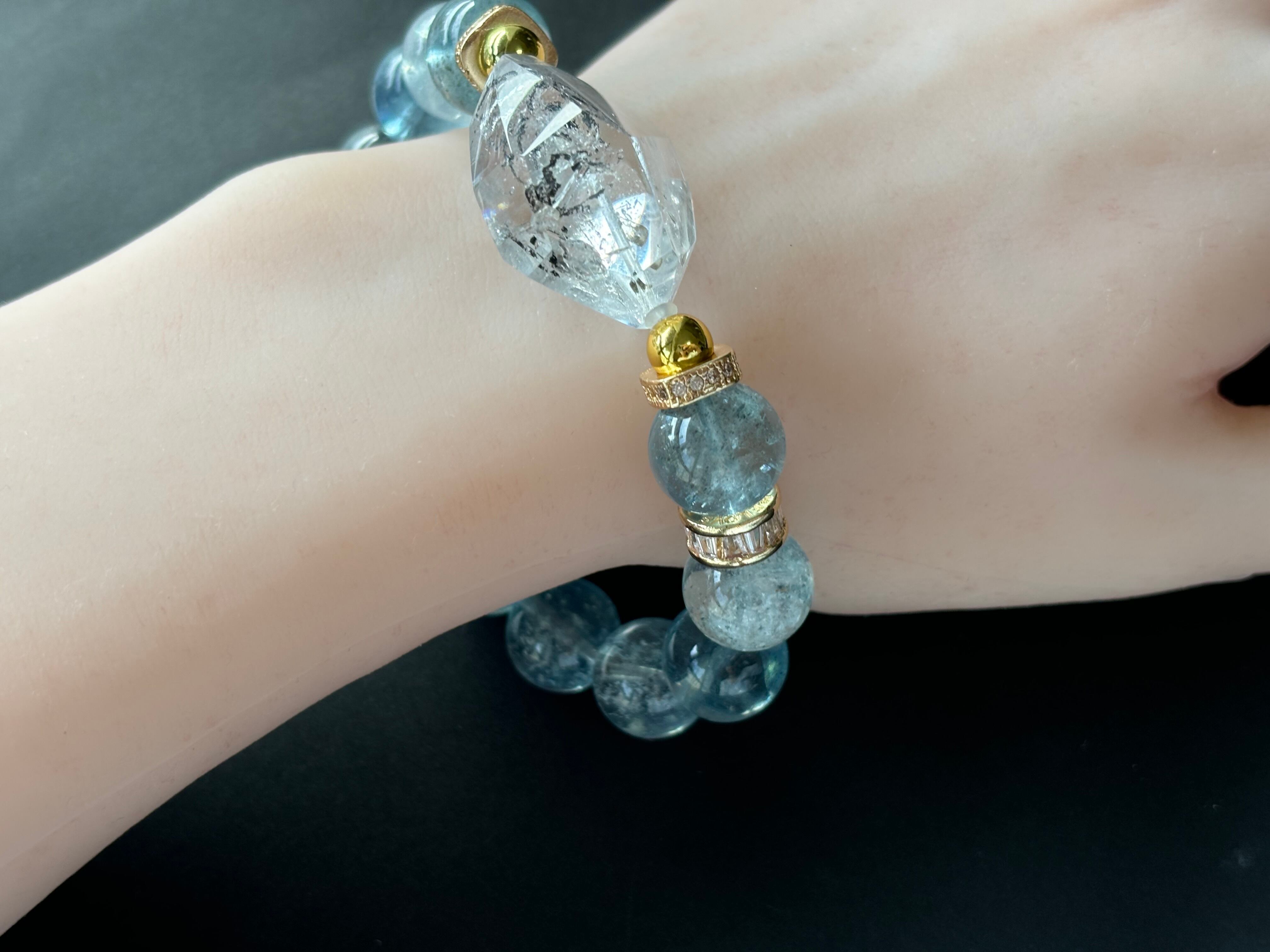 ラフカットの水入り水晶にとーっても綺麗なキラキラモスアクアマリンのブレスレットです♪