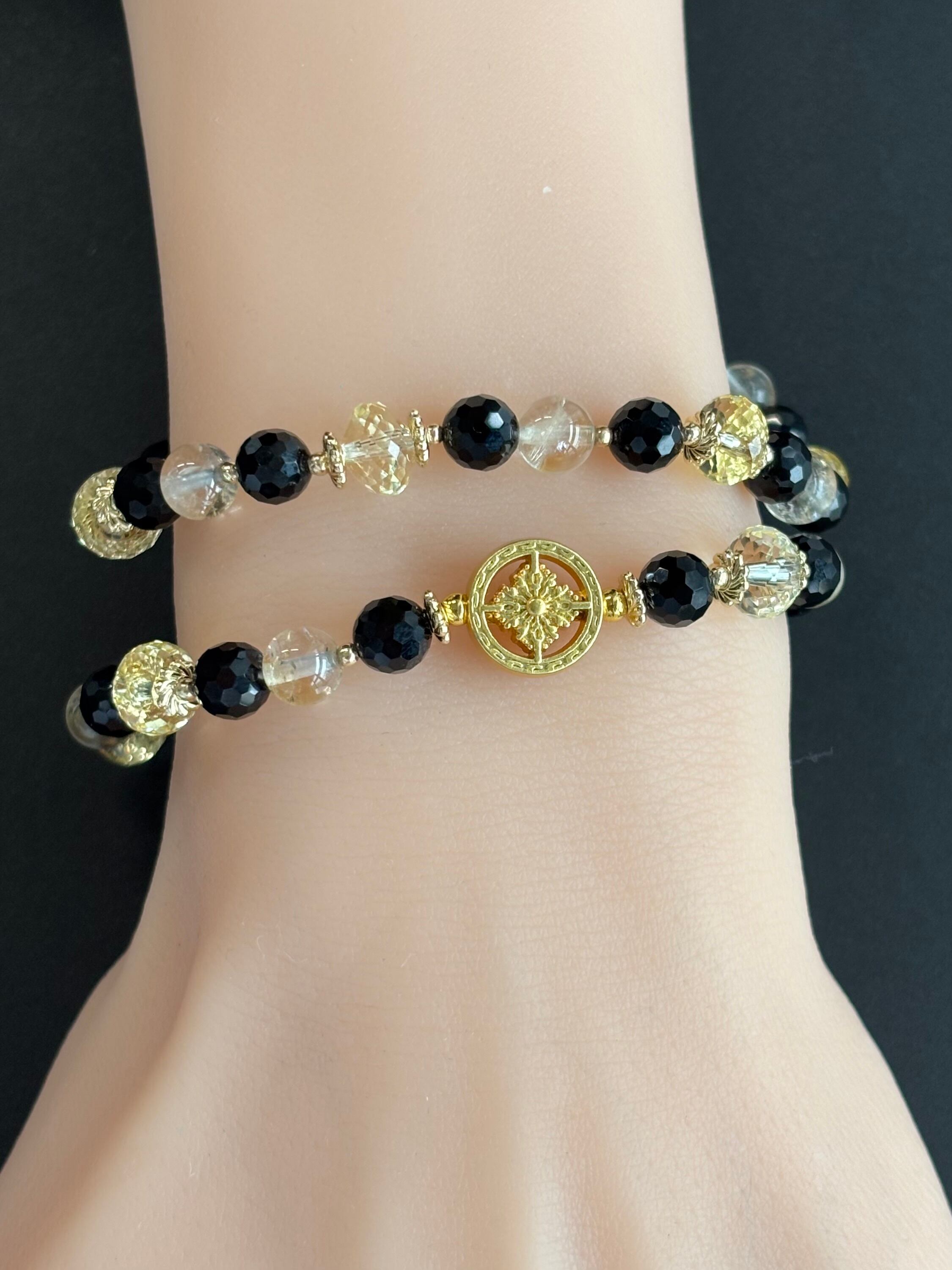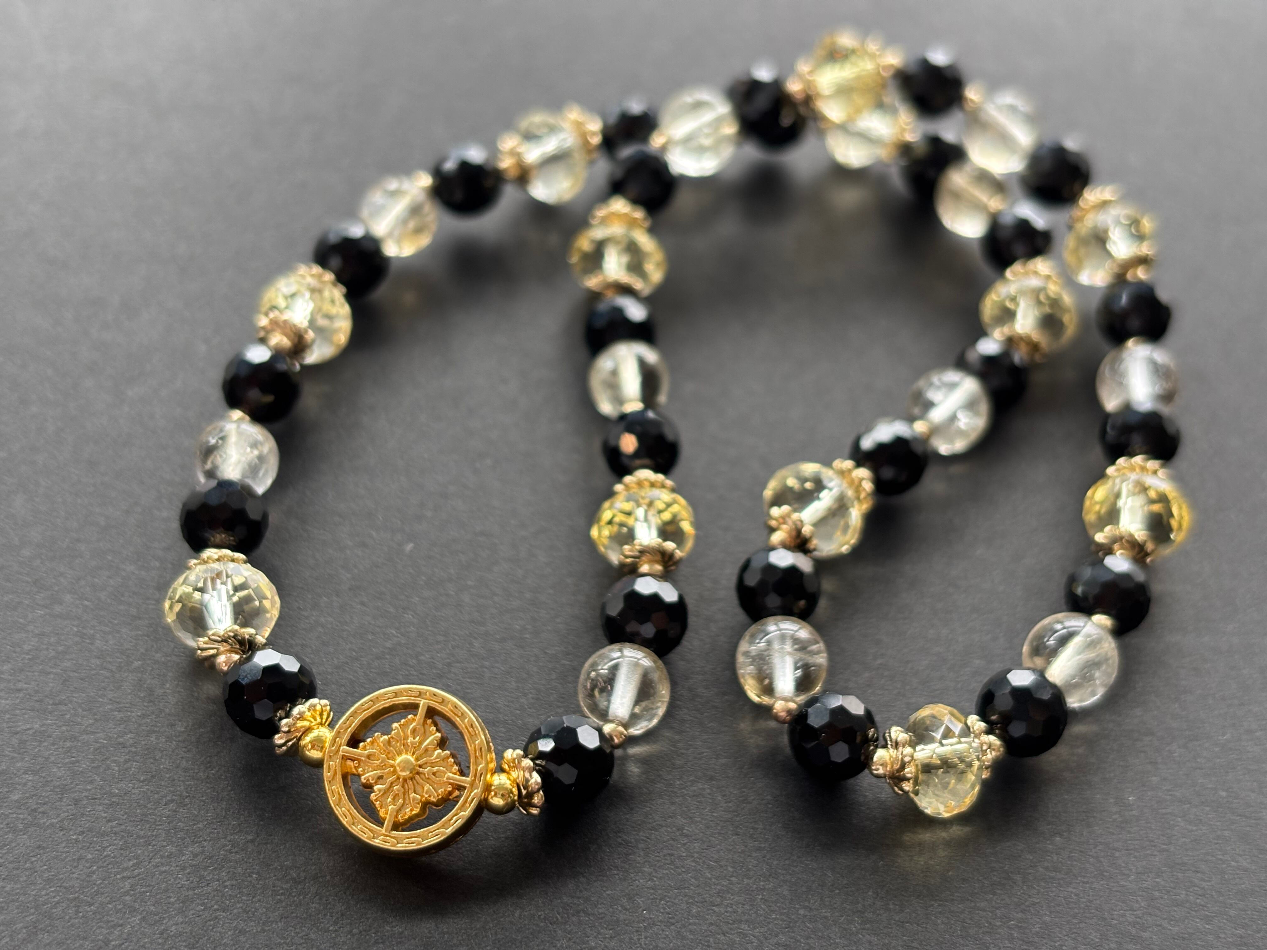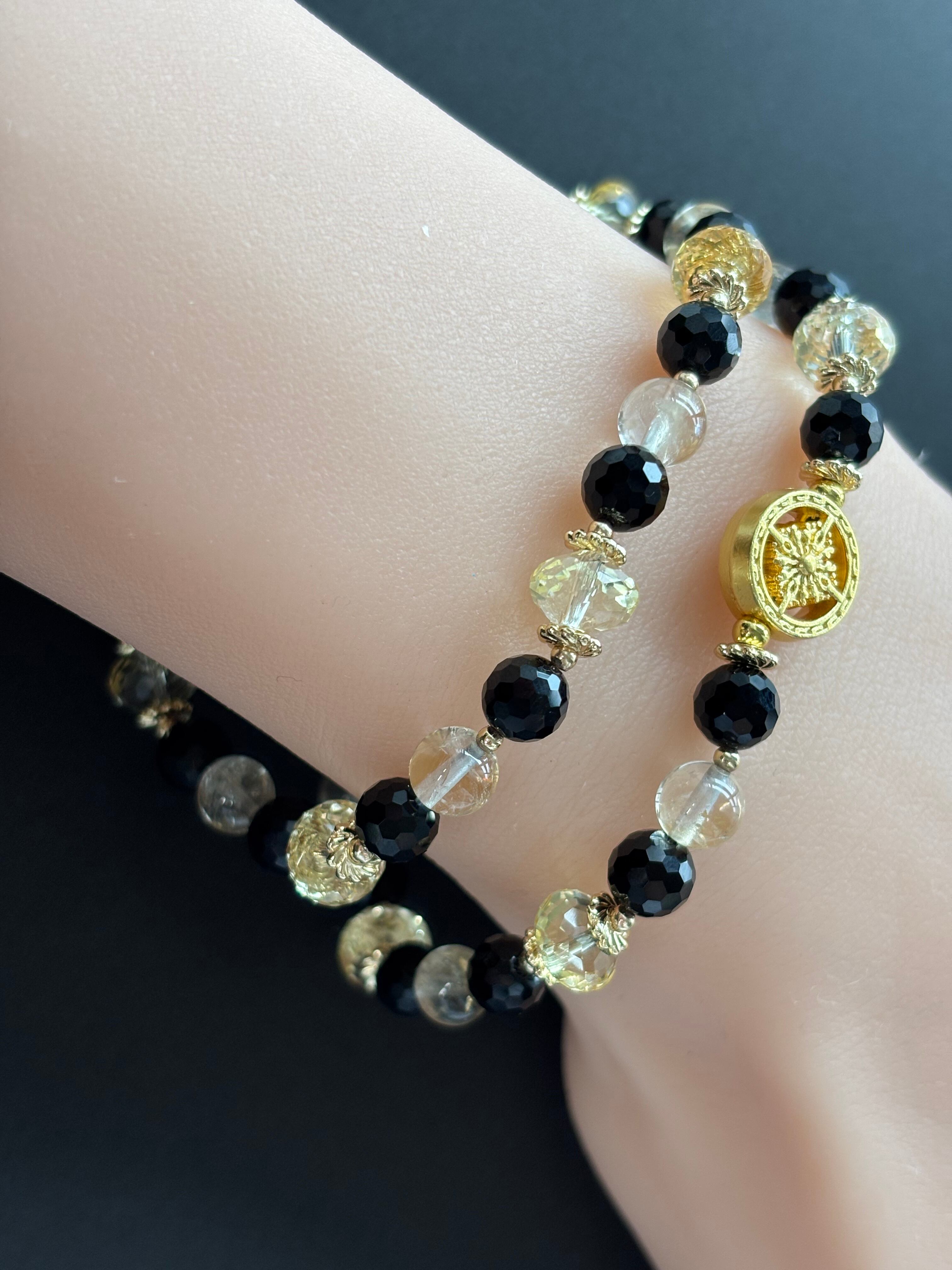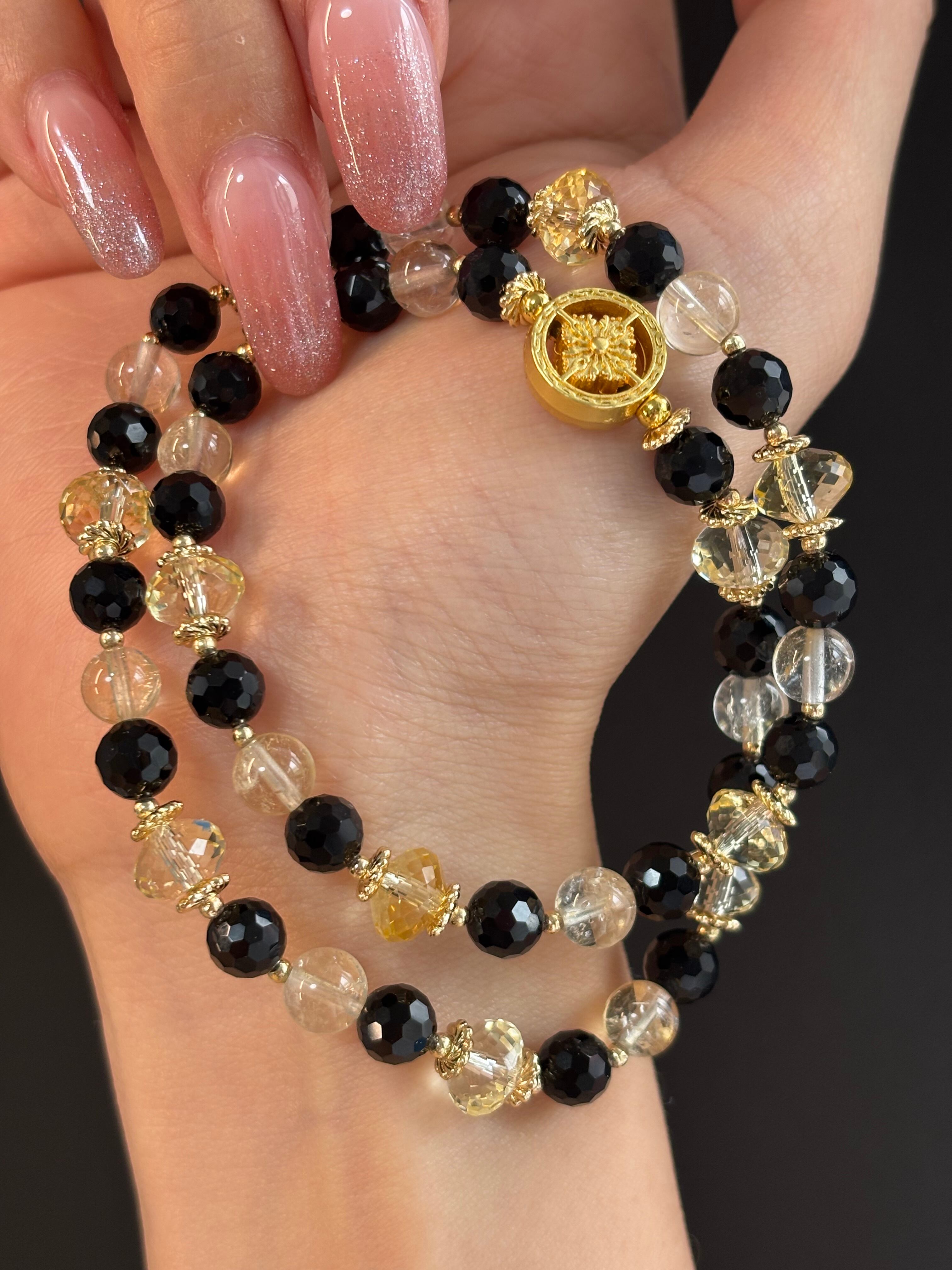 キラキラの宝石カットのシトリンとモリオンふんだんに使い控えめですがアイリスが見える天然非加熱のシトリン丸玉を使った2連デザインブレスレットです(*´∀`*)