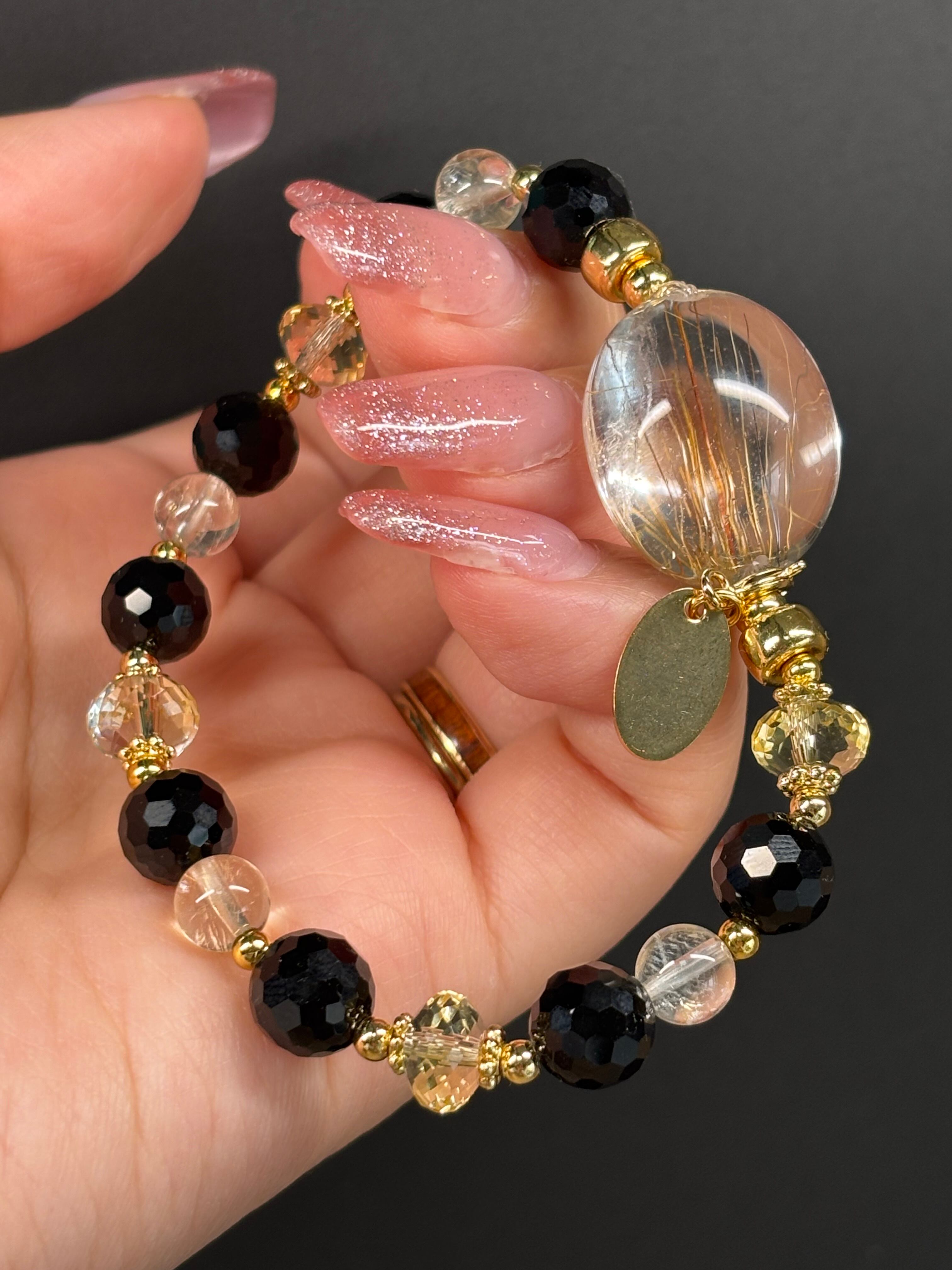 ブラック ブラウン ゴールドの針が見える透明感高いルチルをトップに、キラキラの宝石カットのシトリンとモリオンを使い控えめですがアイリスが見える天然非加熱のシトリン丸玉を使ったデザインブレスレットです(*´∀`*)