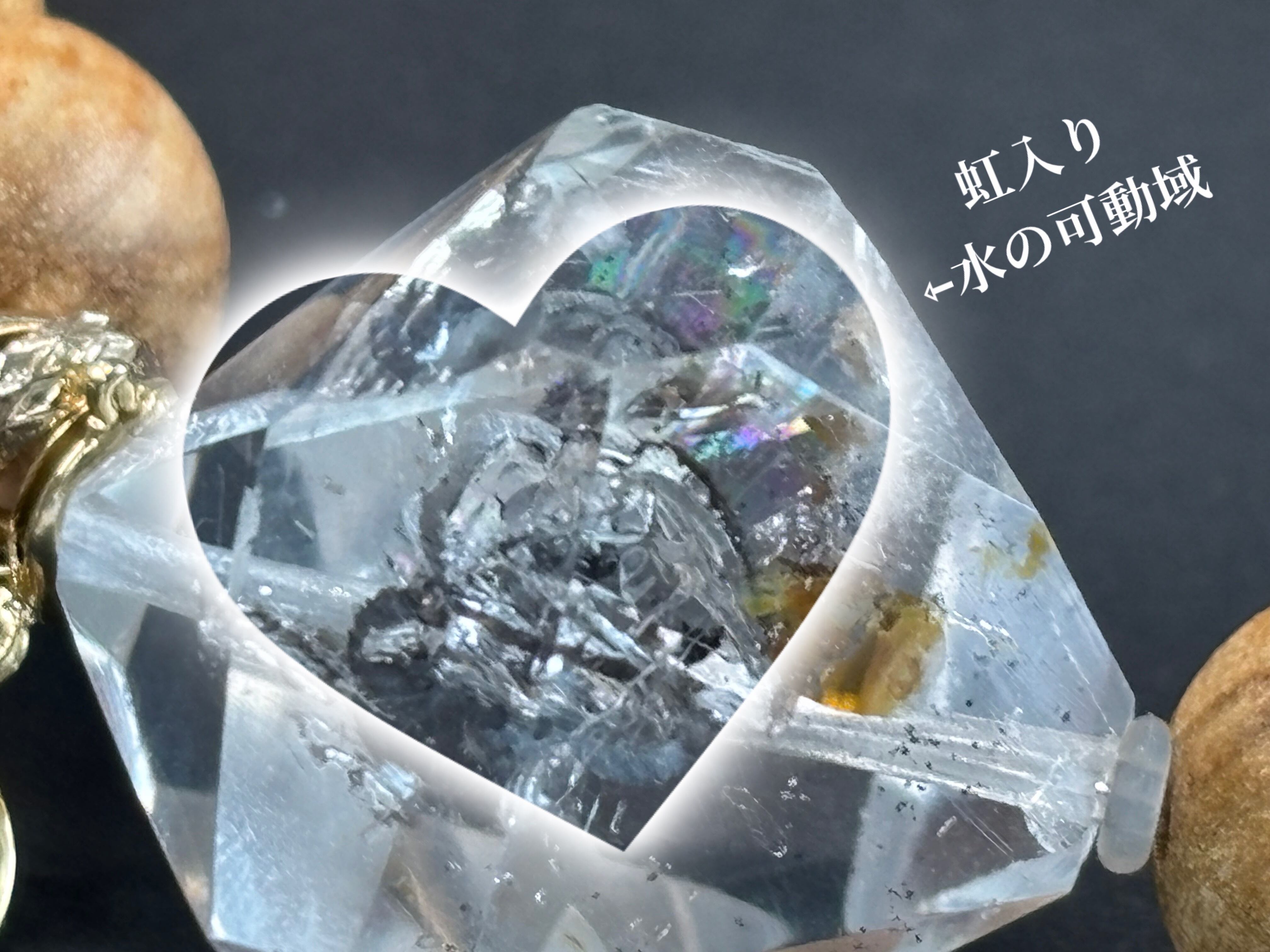 ラフカットの水入り水晶の水部分は元気よくタールが流れるのが確認出来ます♪ ライモナイトが内包されている部分もあり、虹も見えます。