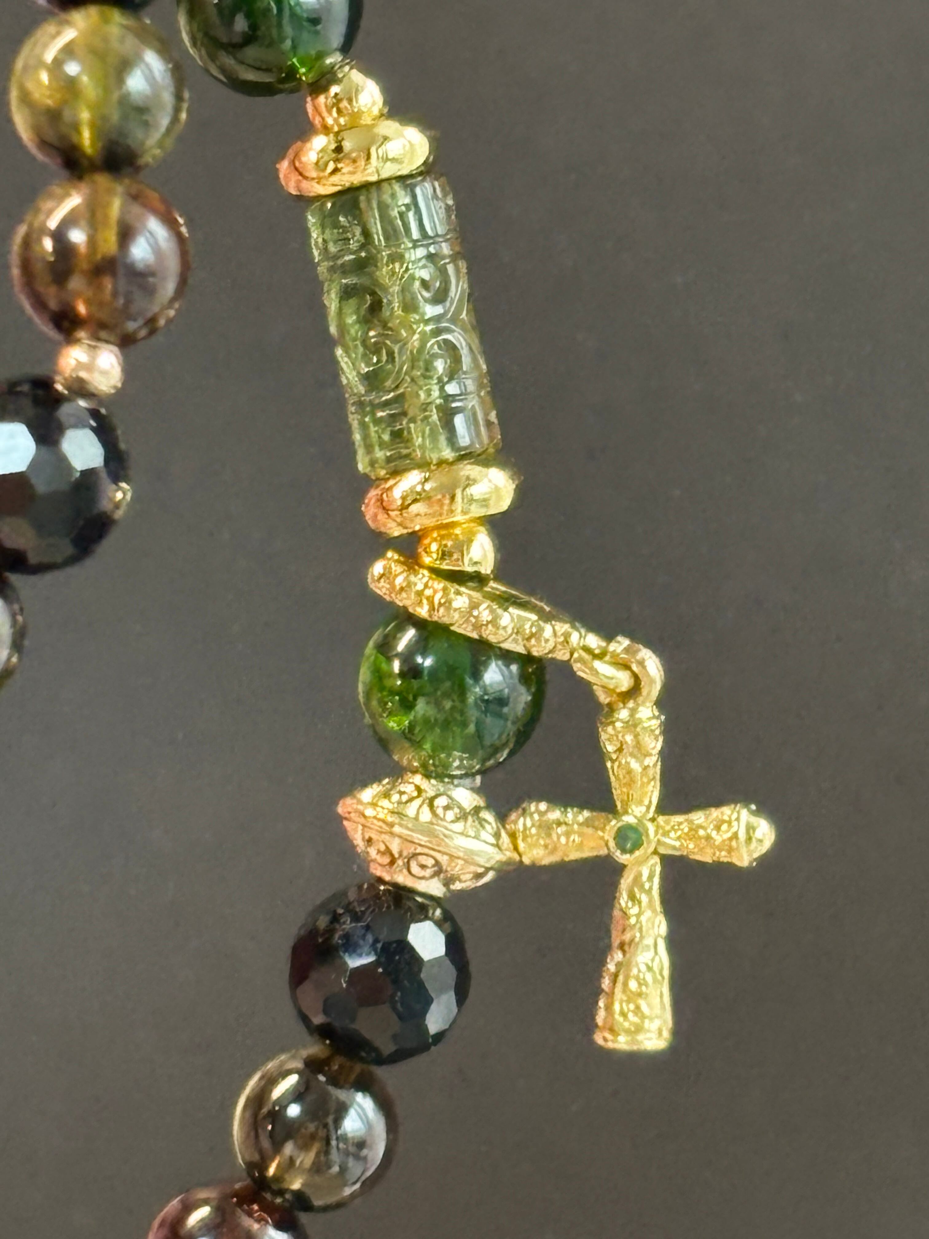透明感の良いグリーントルマリンの回文殊をトップにサイドには高品質クロムダイオプサイトを挟み ブレスレット部分はグリーントルマリンの粒と宝石カットのモリオンと組みました(*^^*)