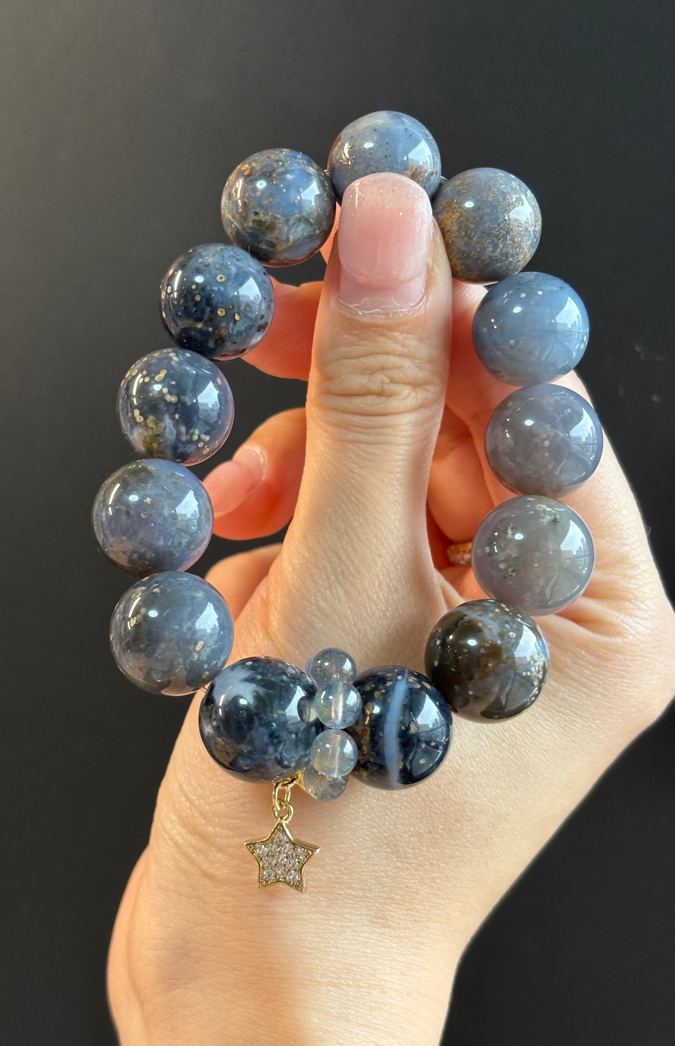 濃い瑪瑙とブルーの瑪瑙をグラデーションのように組み夜空の星空のようなブレスレットになりました♪