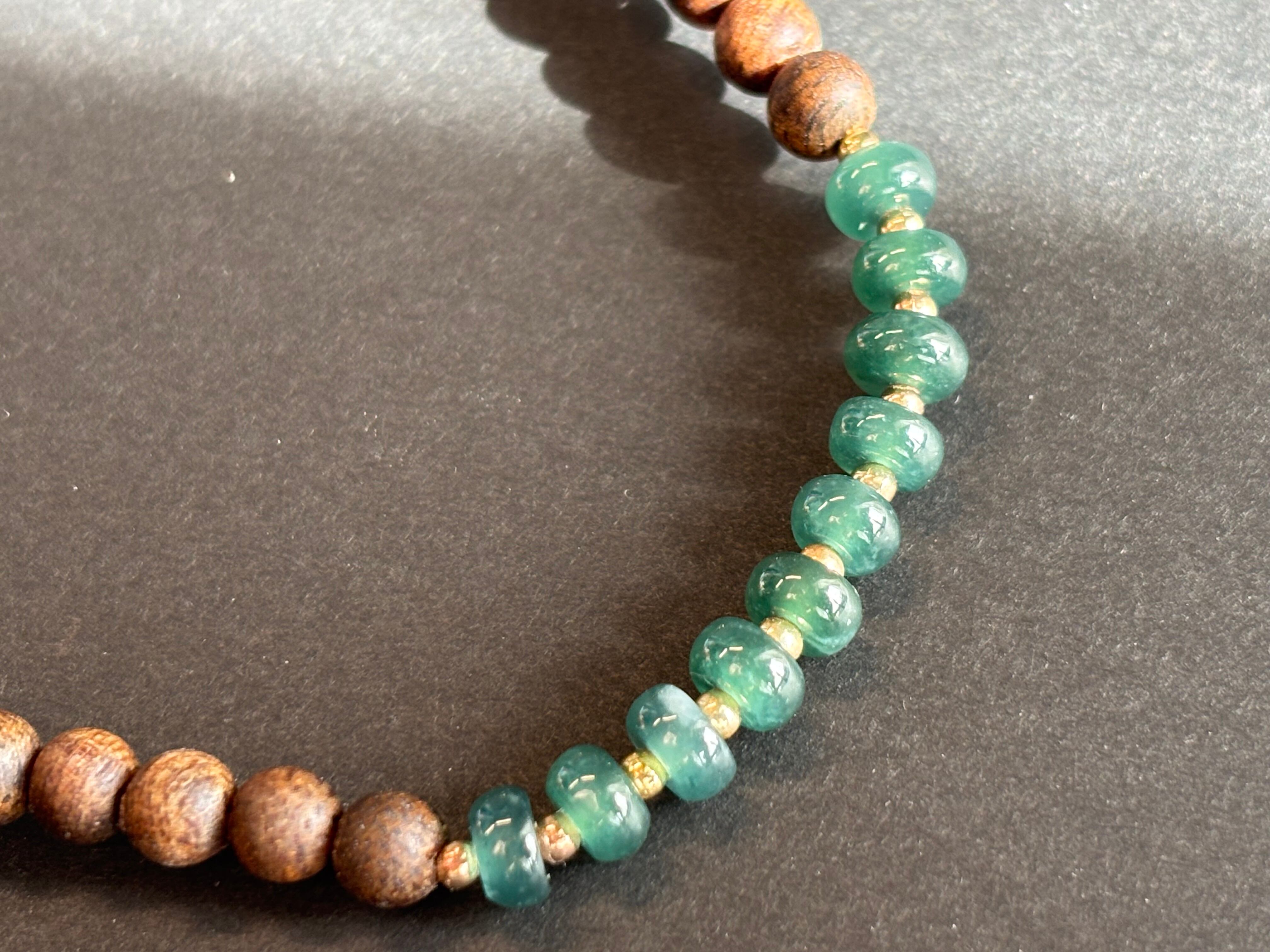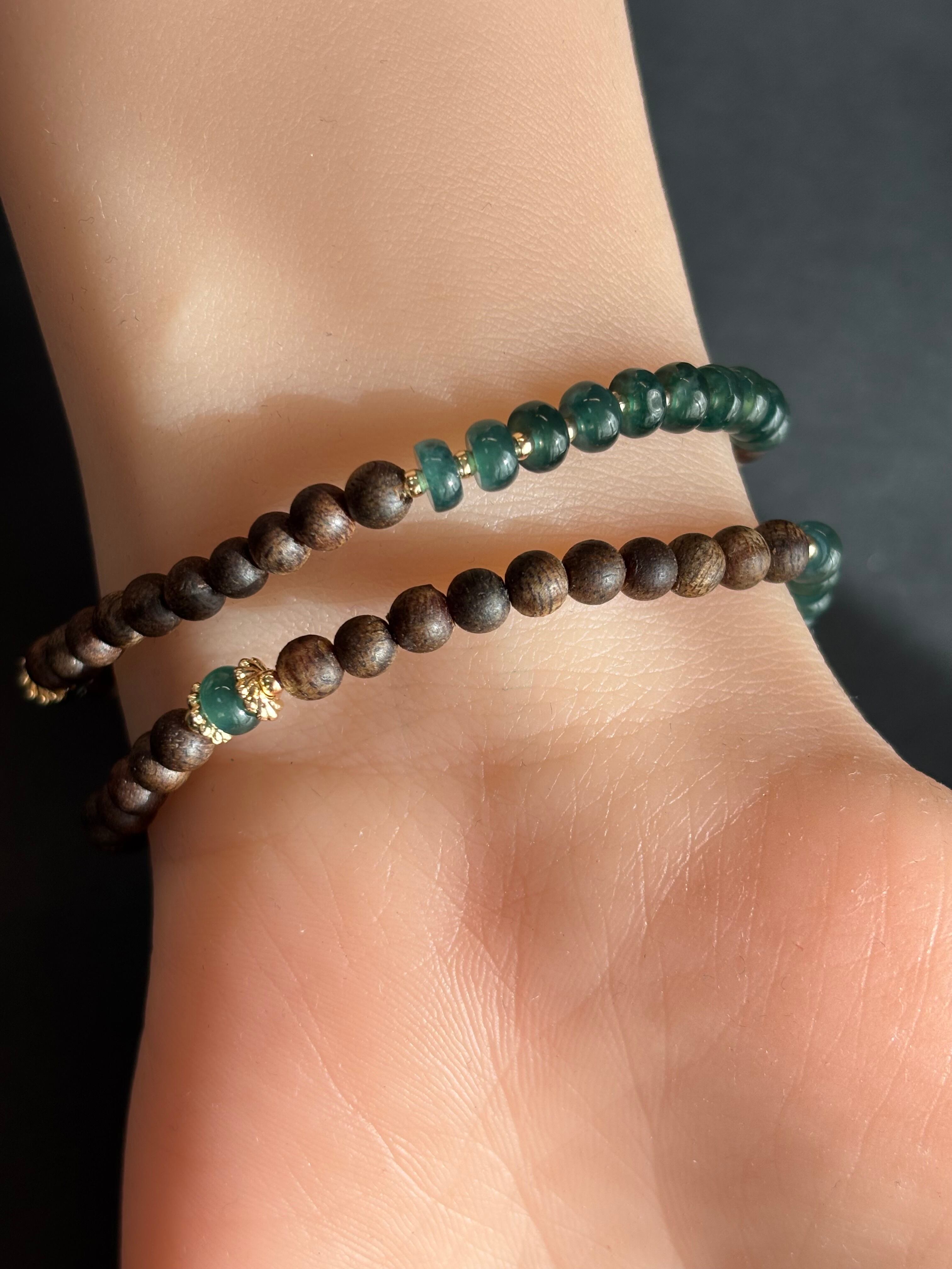 お香やお線香やリラクゼーションとしても使われるグレードの高い冨森紅土沈香木の回文殊とビーズを使い透け感の綺麗なグアテマラ翡翠のソロバンカットとの2連デザインブレスレットです。