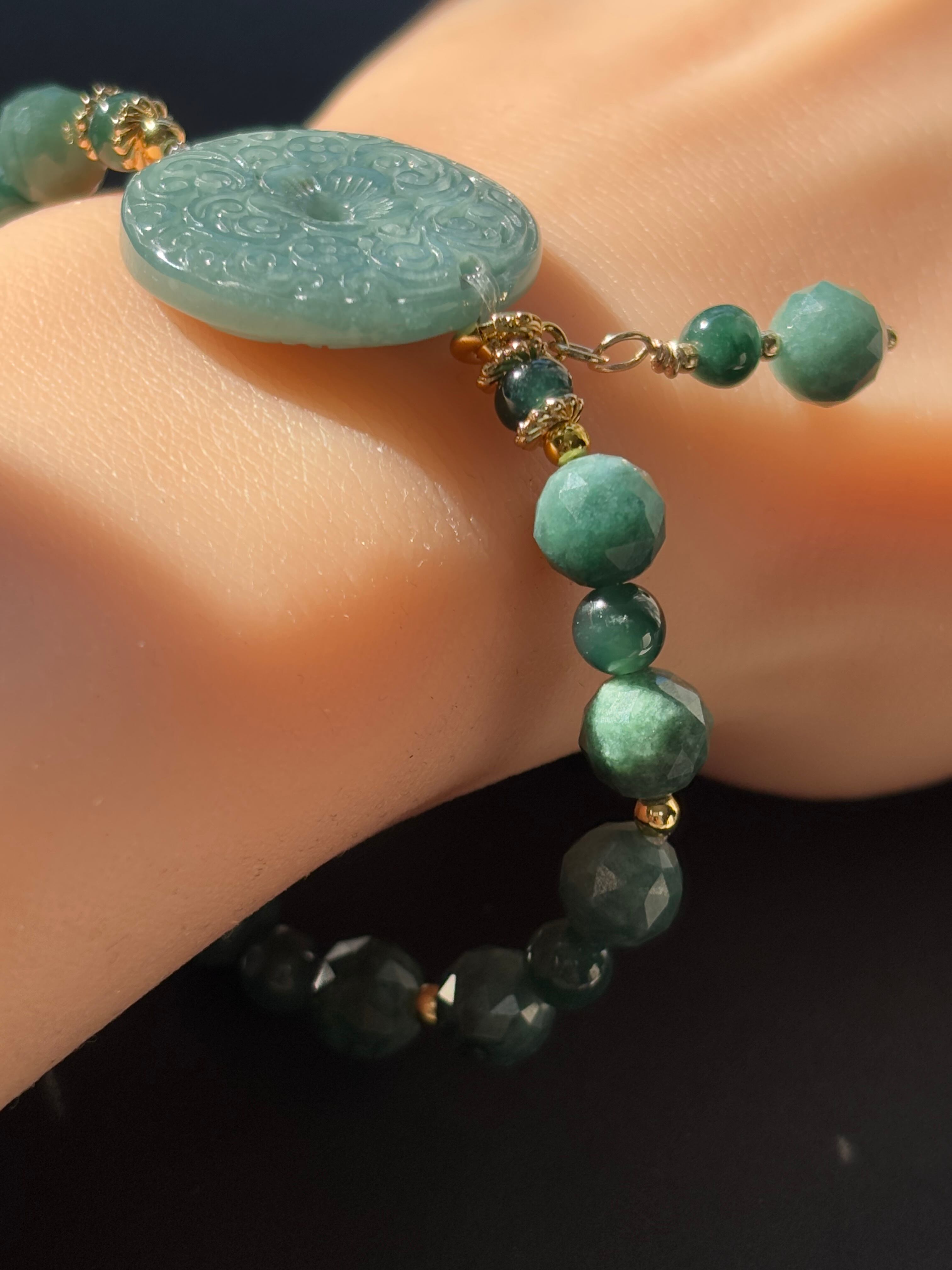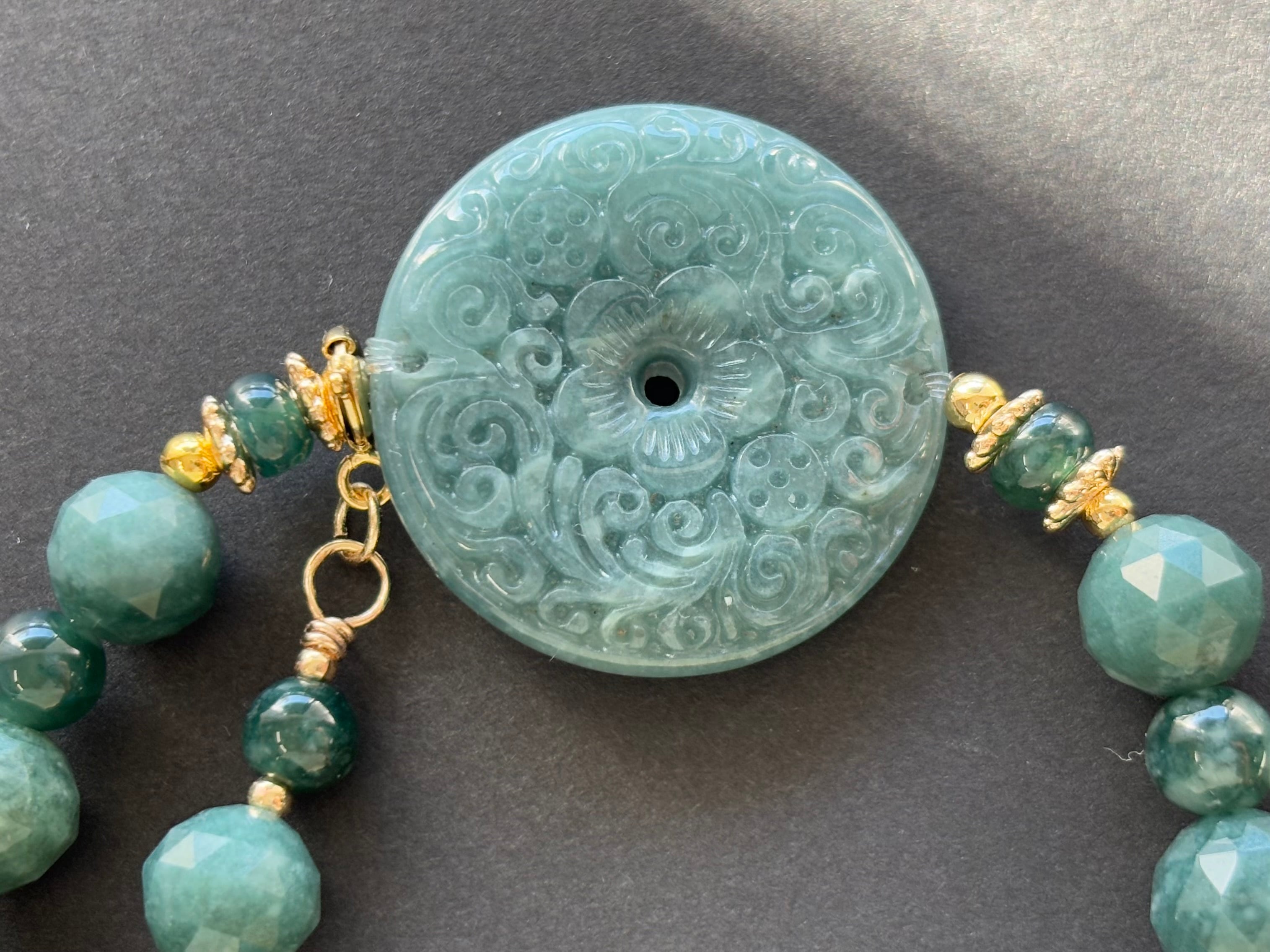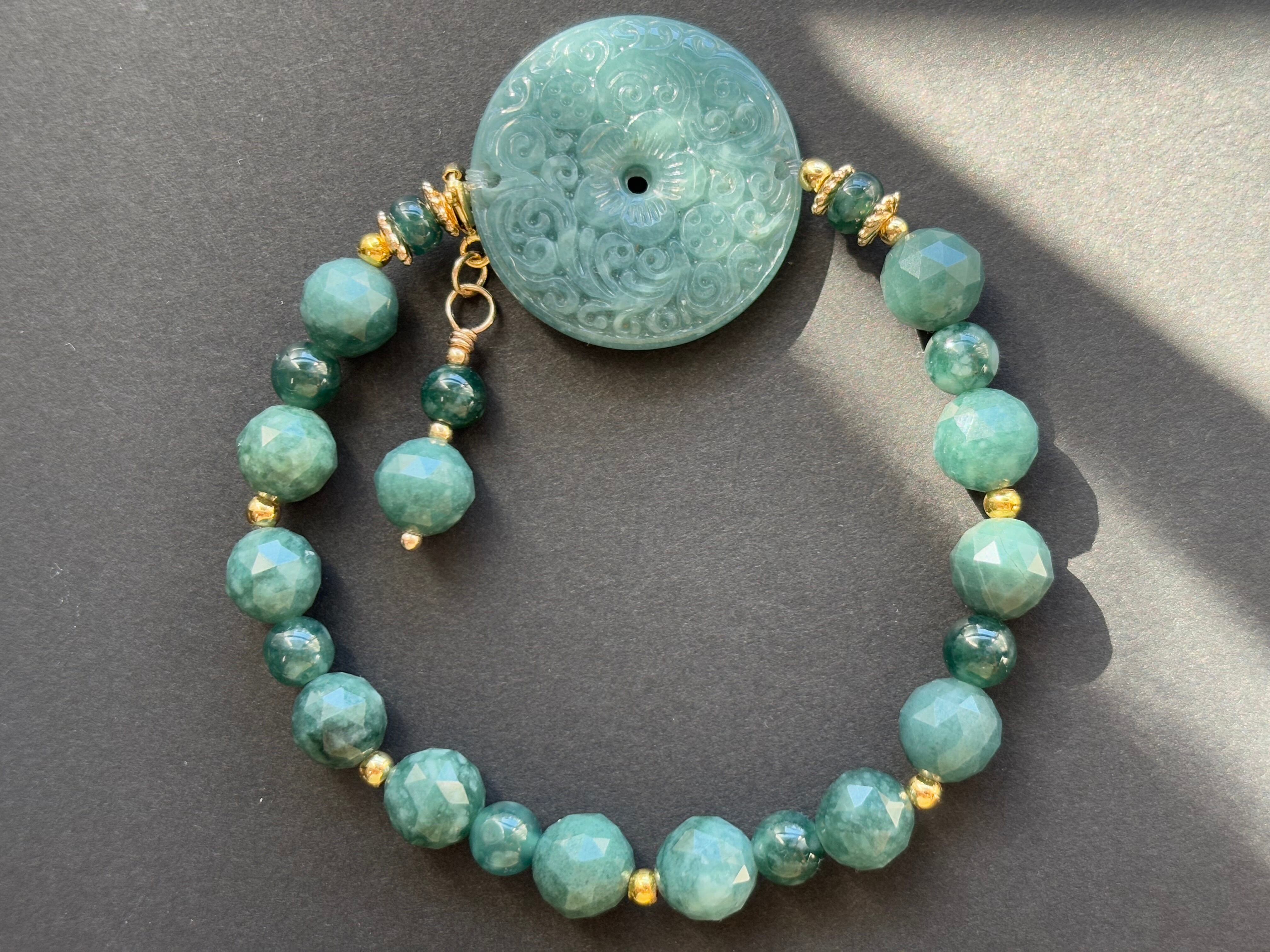 花彫刻の翡翠をトップに丸玉、カット珠、そろばんカットで組みました!