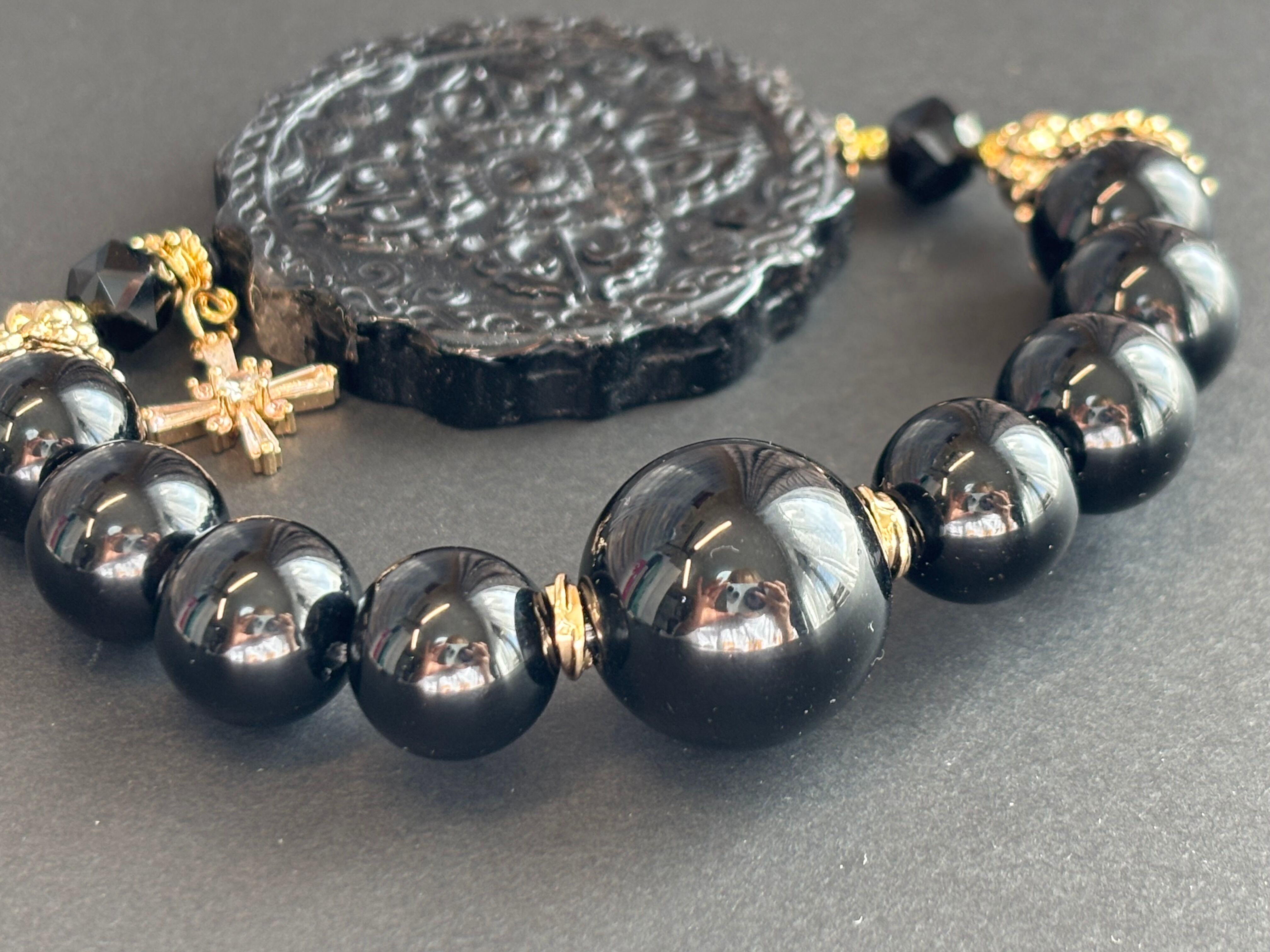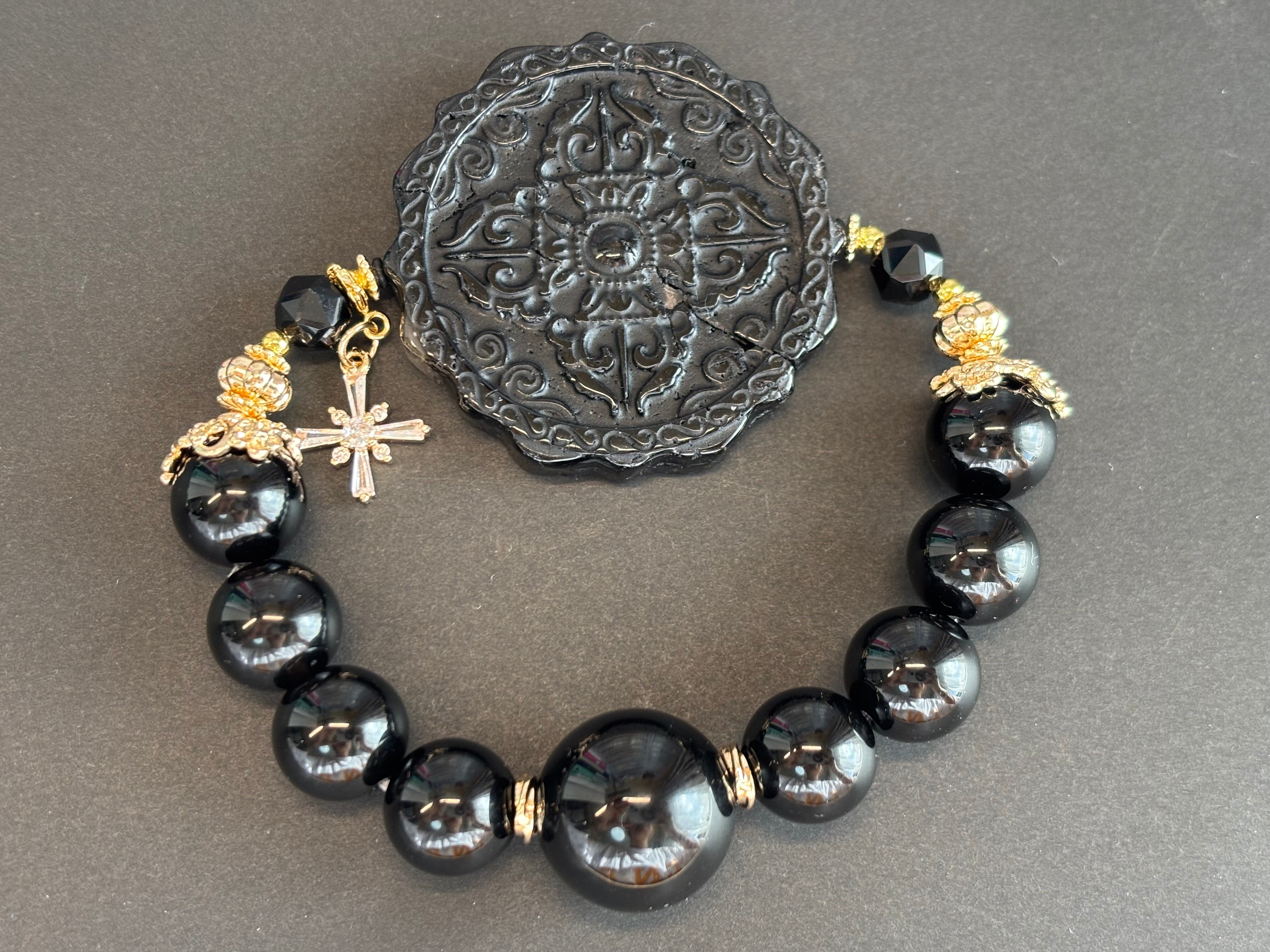 チベットのお守りとされていた人工モリオンに手彫りの美しい彫刻の施されたカツマのトップに高品質のカットモリオンと丸玉と組みました。
