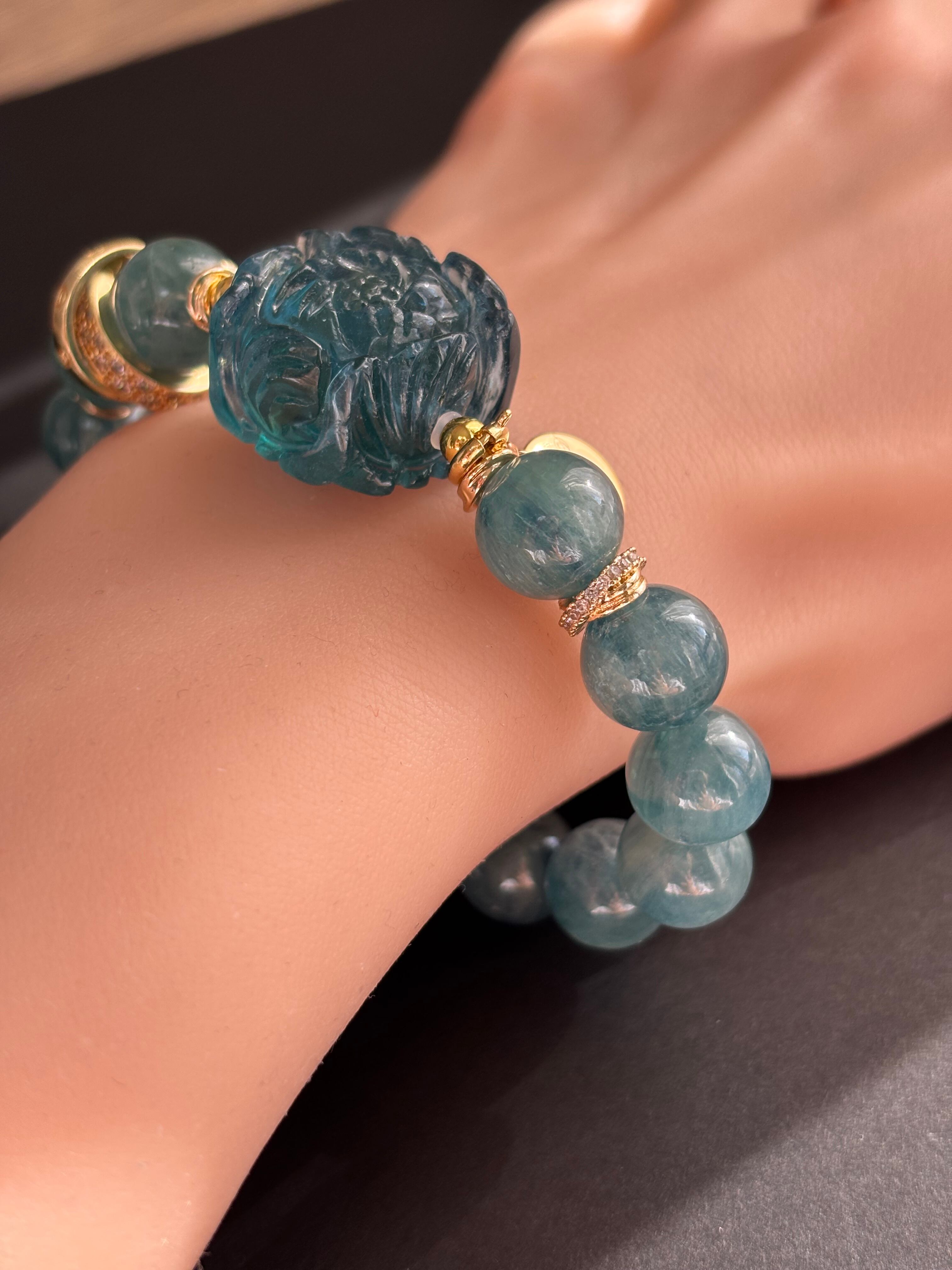 高品質ティファニーブルーカイヤナイト サンタマリアカラーアクアマリン手彫り彫刻薔薇 デザインブレスレット