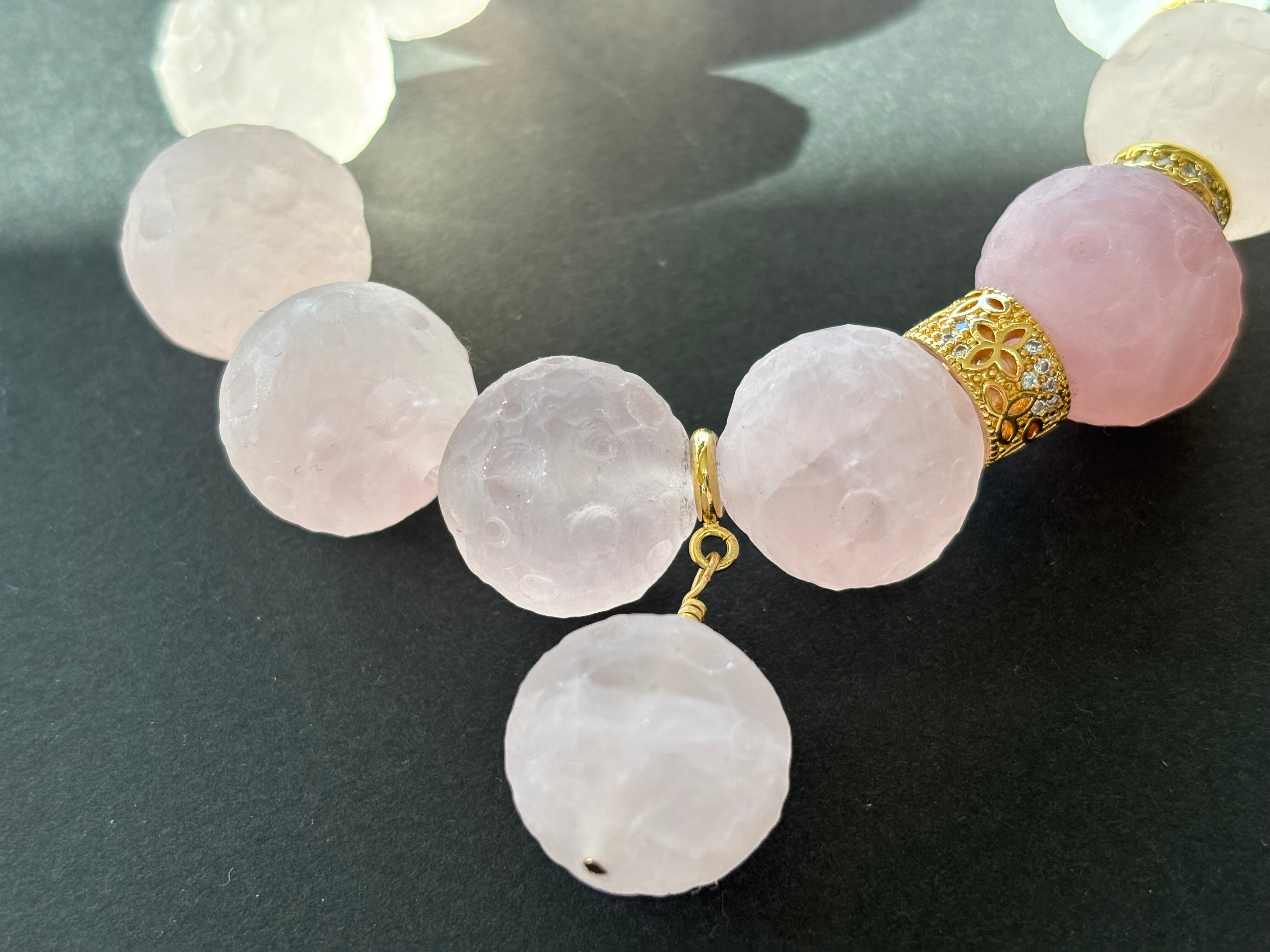 マット加工された惑星のようなカットのローズクォーツがグラデーションのように組まれています(*^^*)