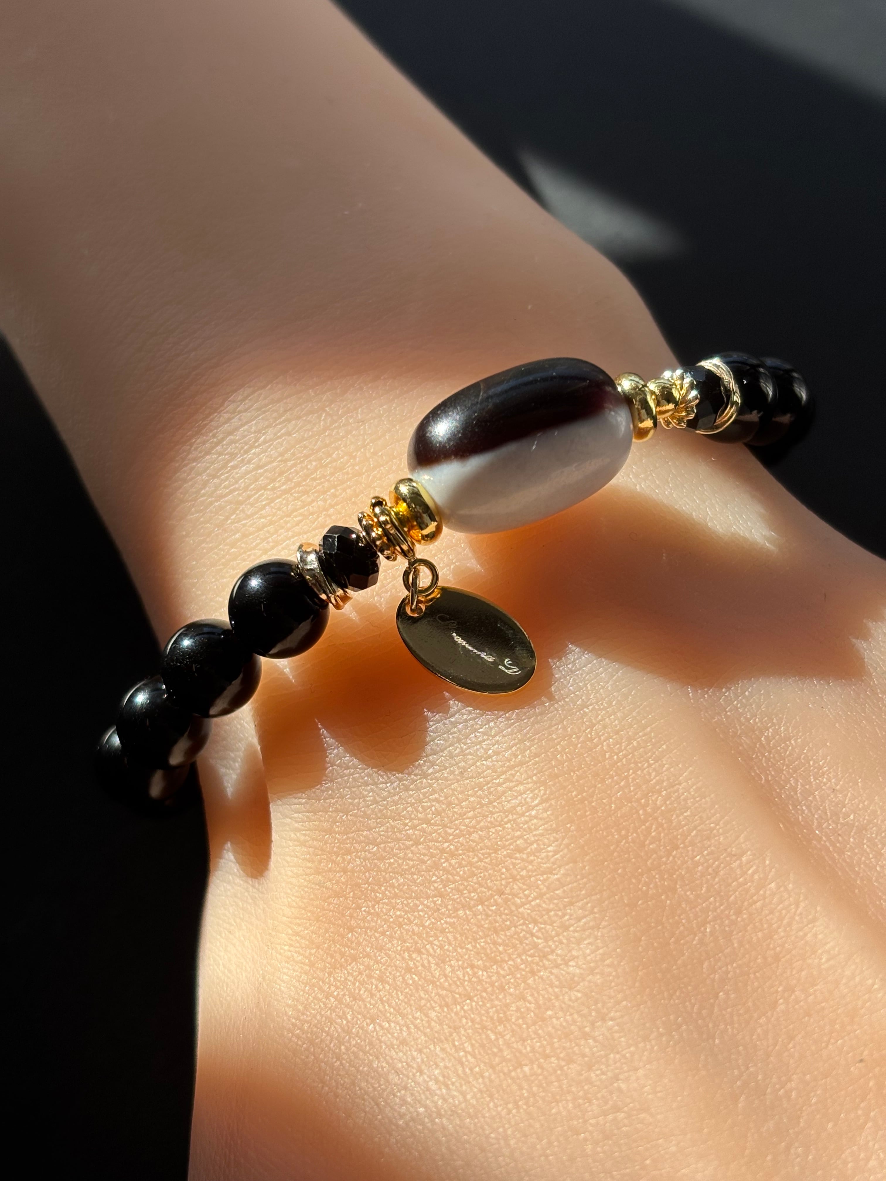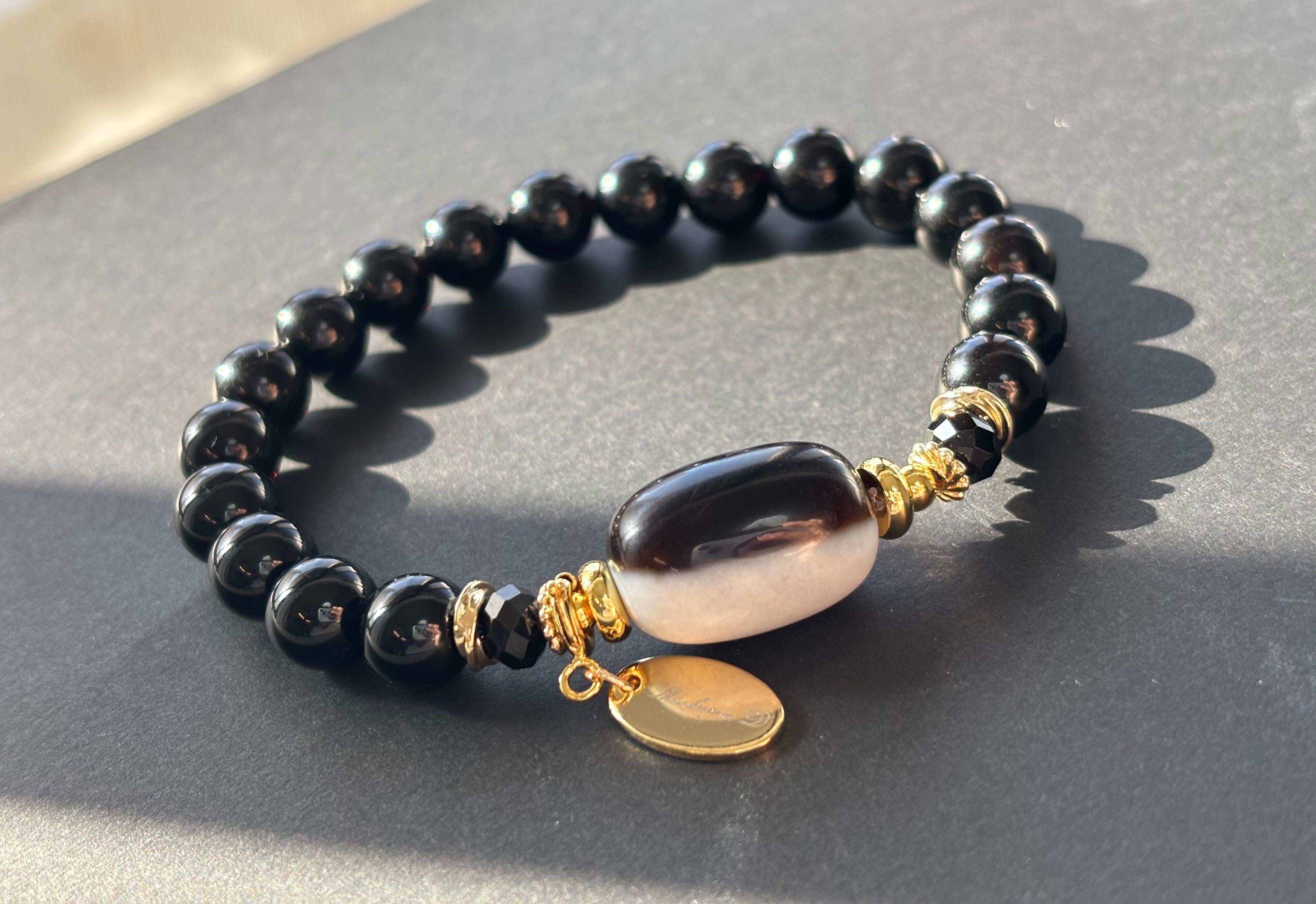 珍しい縦型の黒白天珠をトップにブレスレット部分は高品質モリオンとポイントにブラックスピネルを入れ組みました。