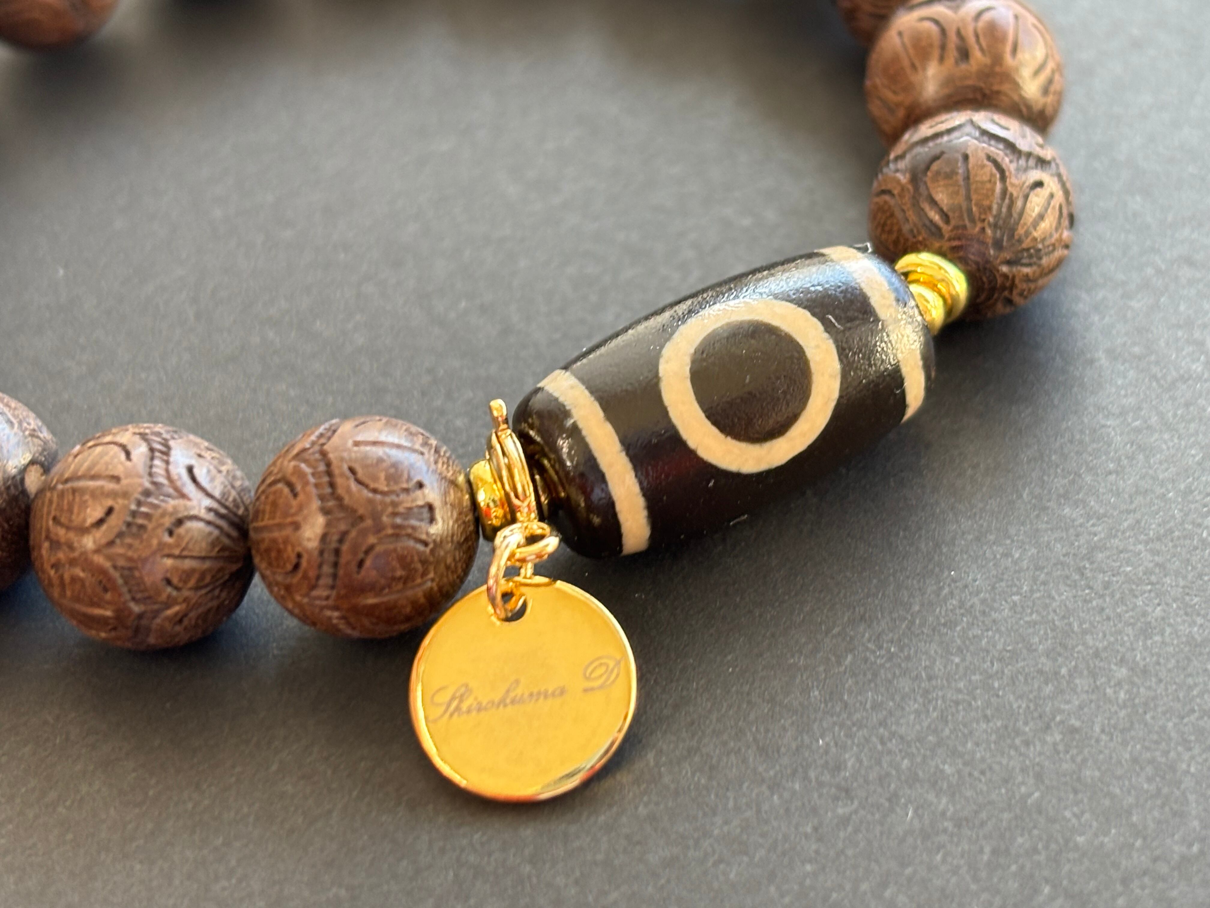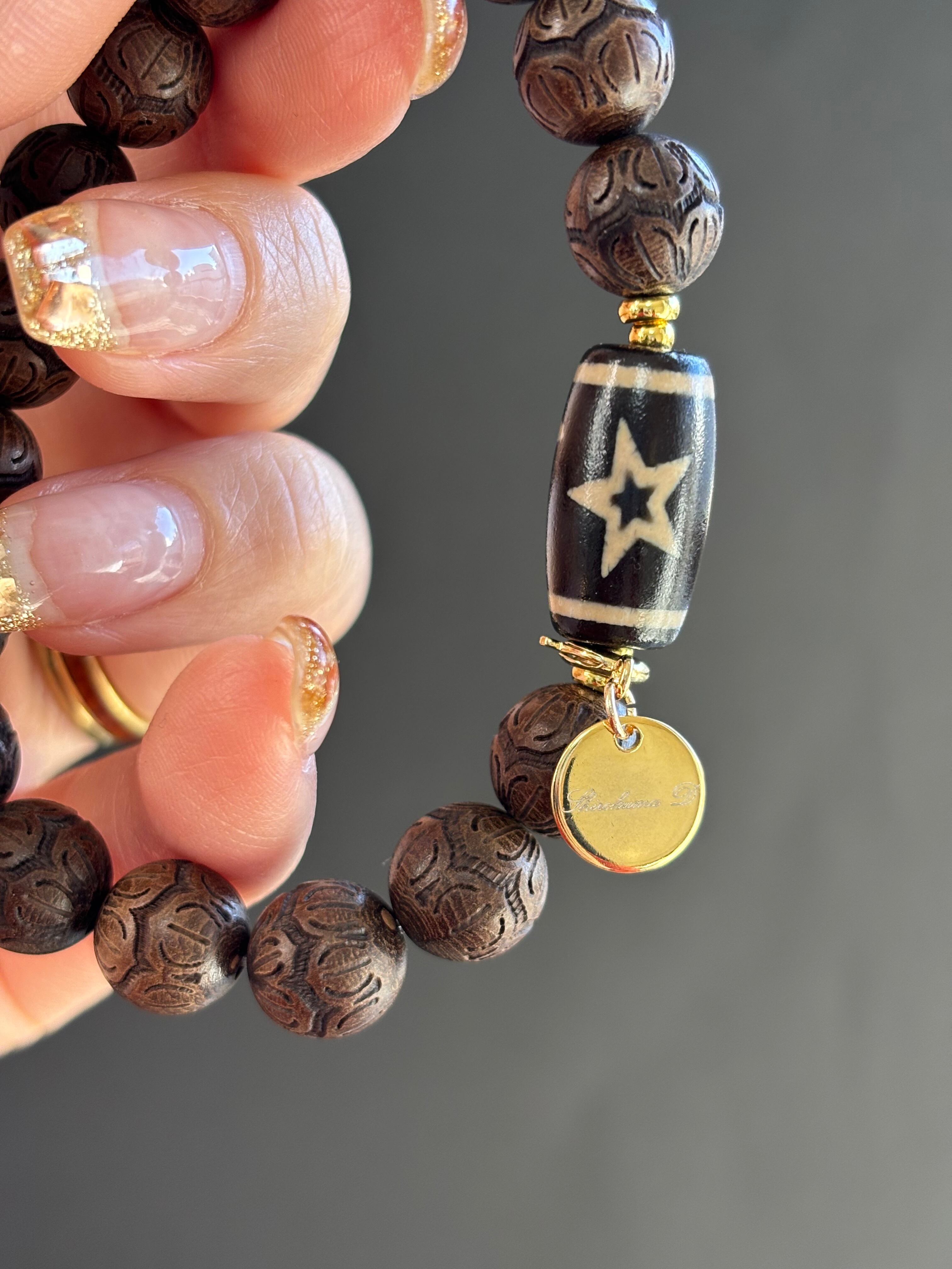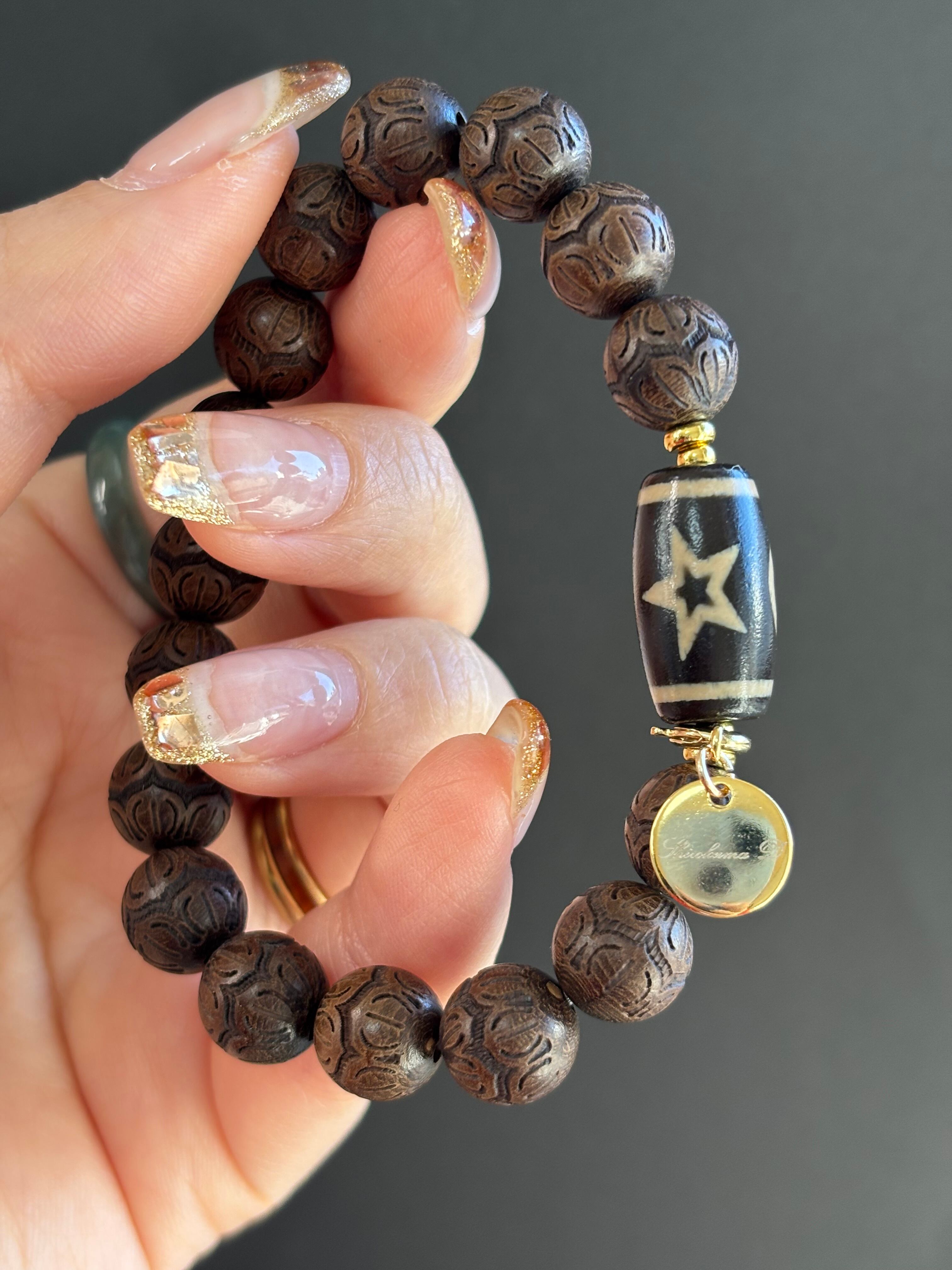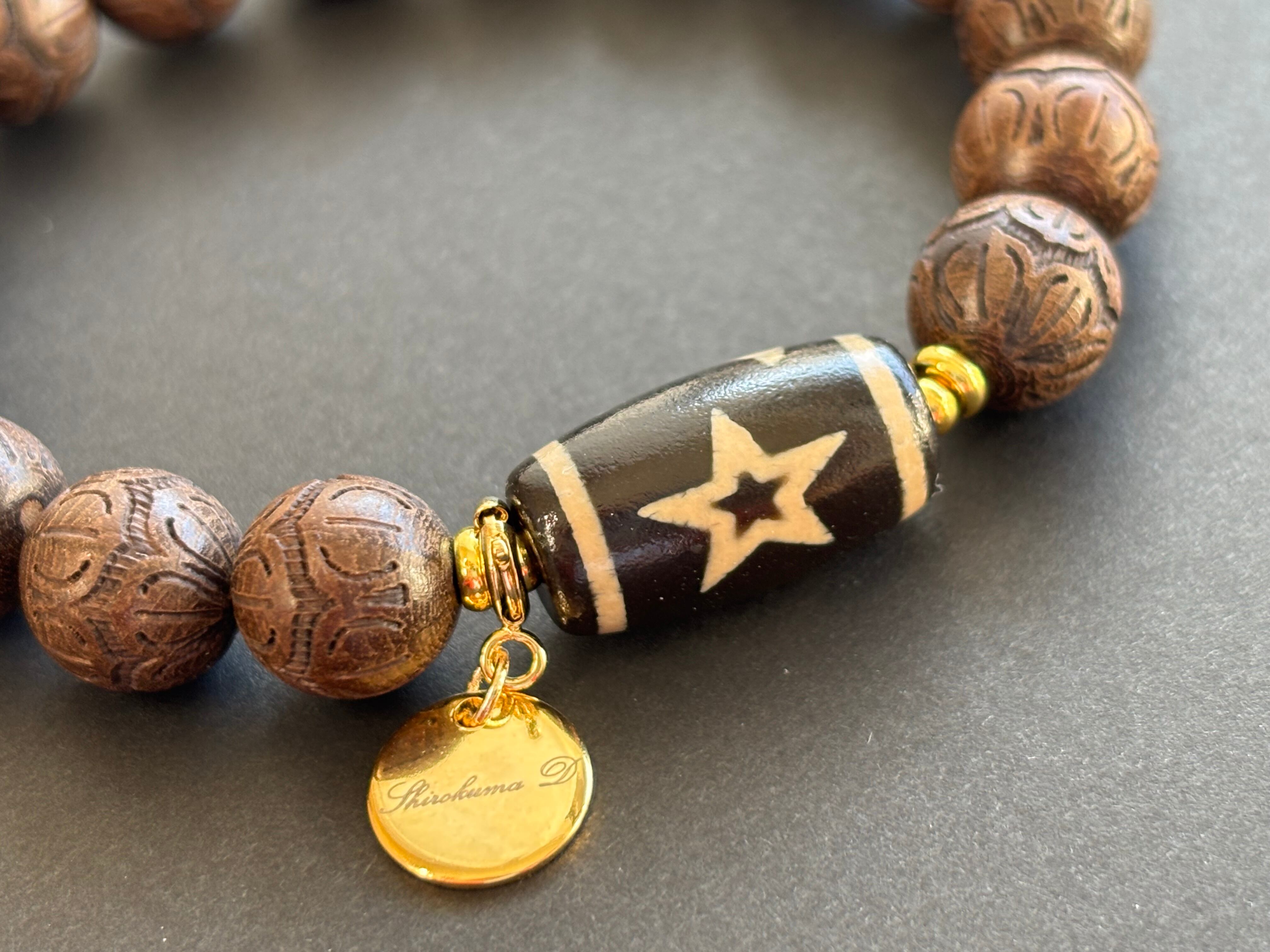 ミニサイズの日月星天珠のブラックのカラーをトップにブレスレット部分は蓮彫りの六道木を使ったブレスレットです( *´꒳`*)