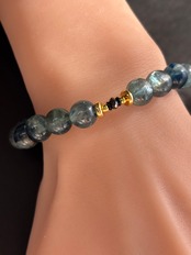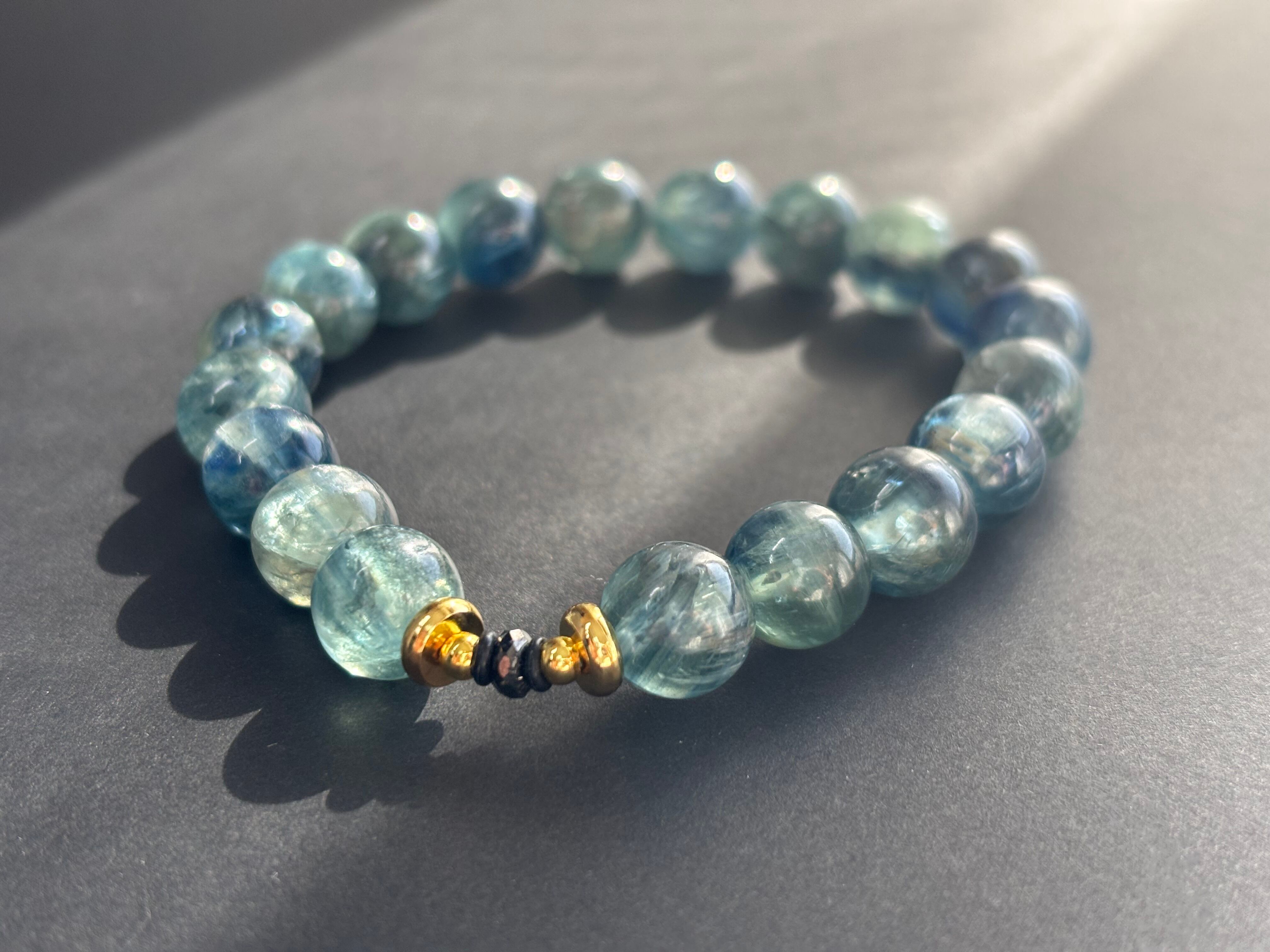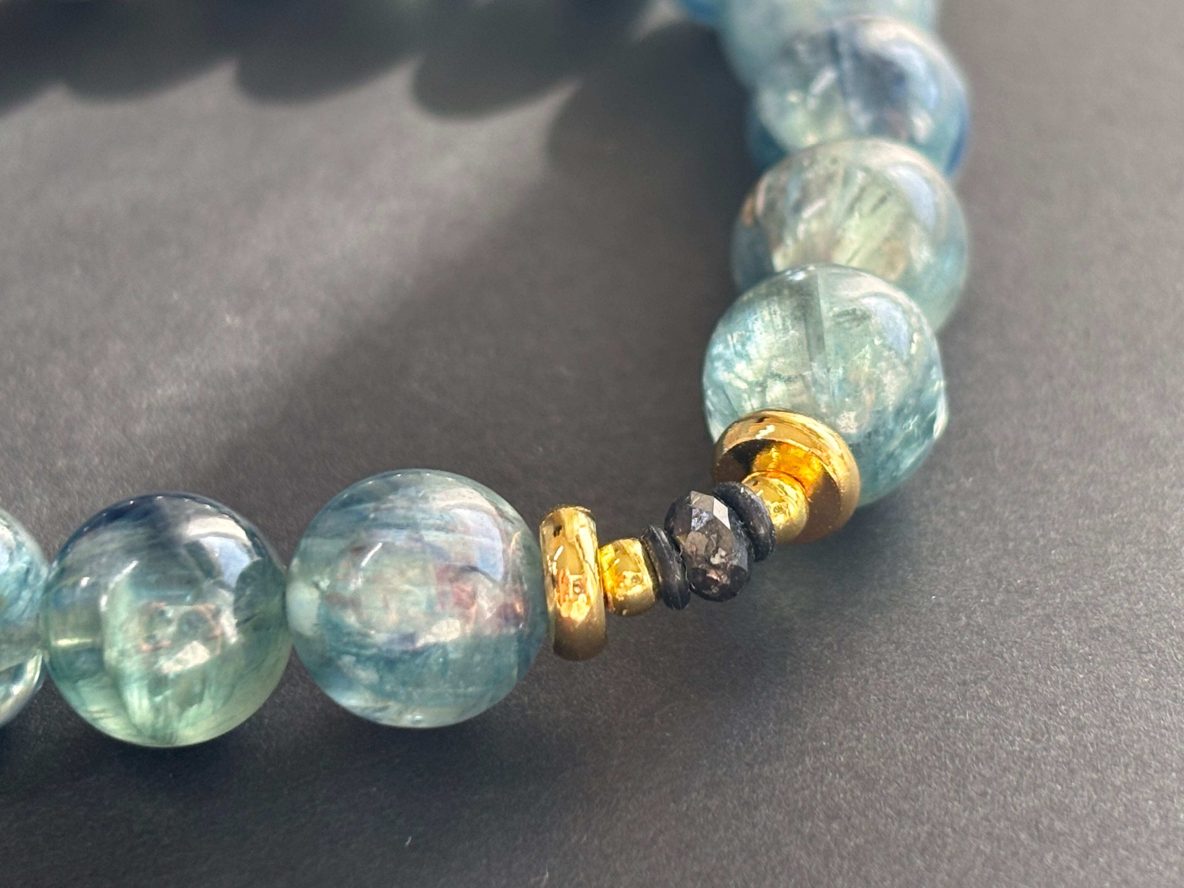 キラキラ輝く1粒のブラックダイヤモンドをトップにブルーグリーンの透け感の綺麗なカイヤナイトのブレスレットです( *´꒳`*)